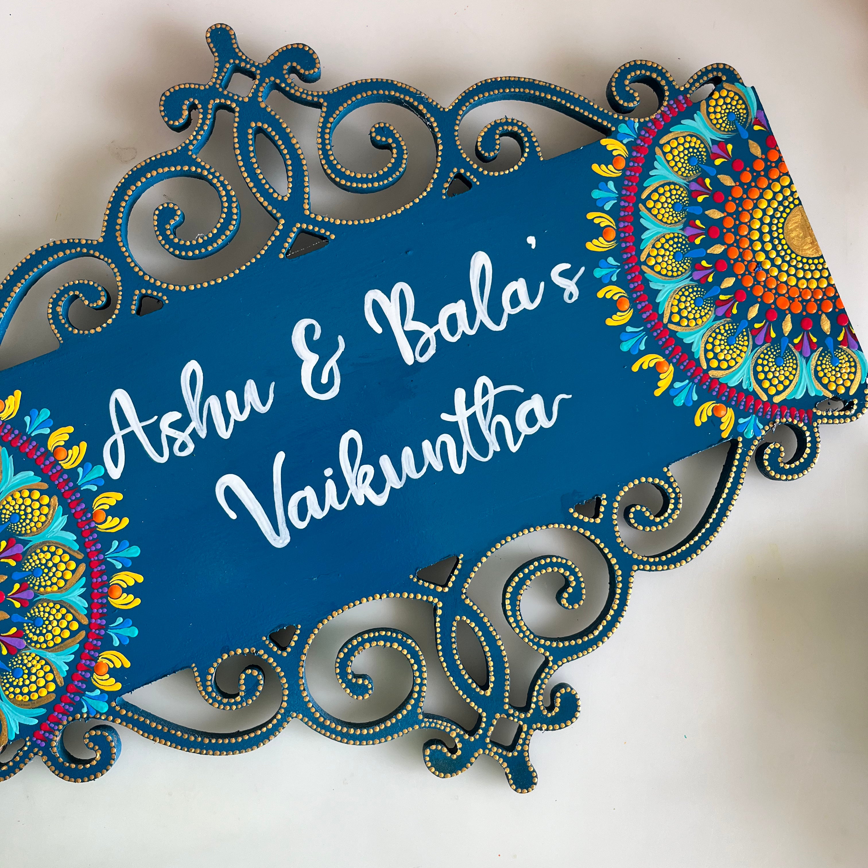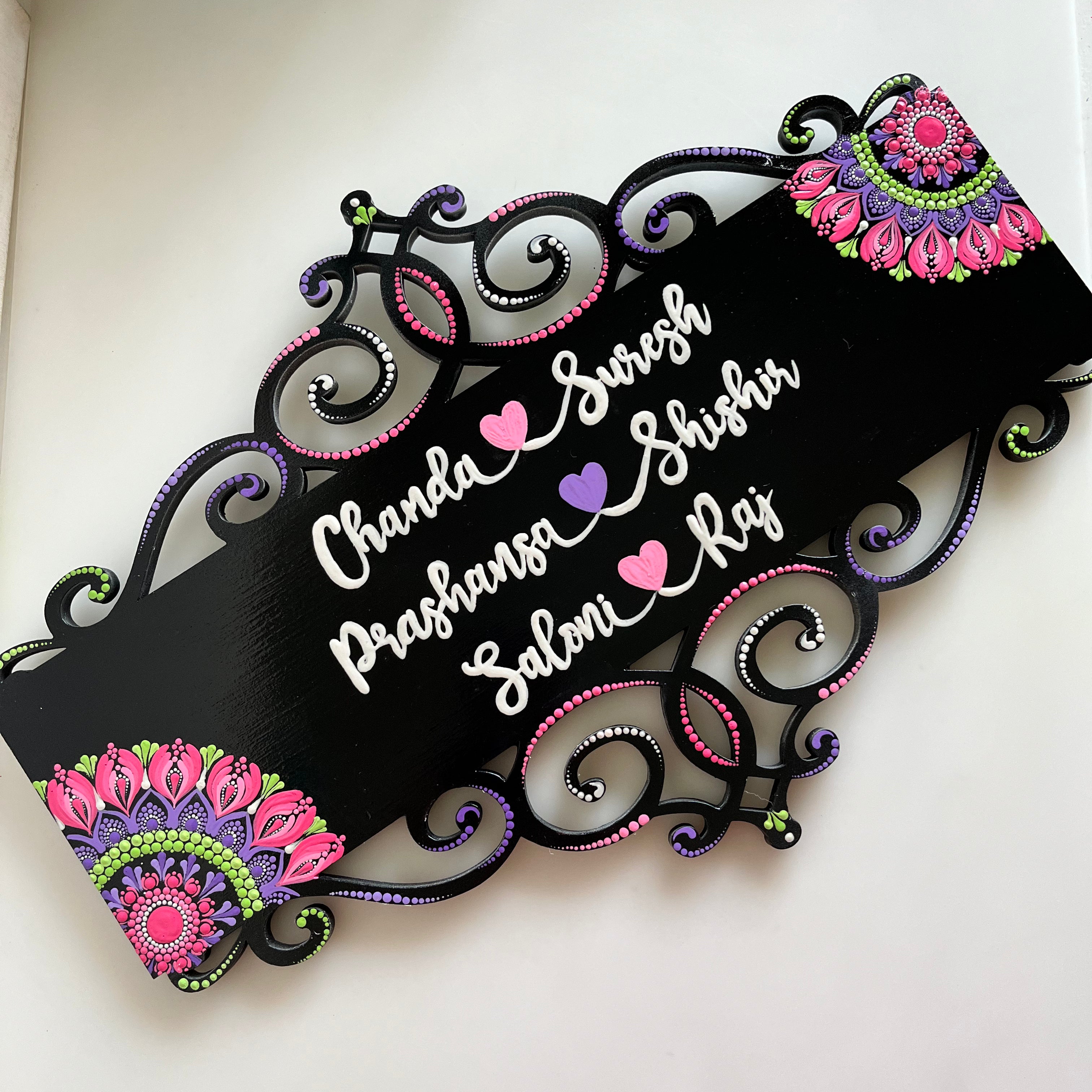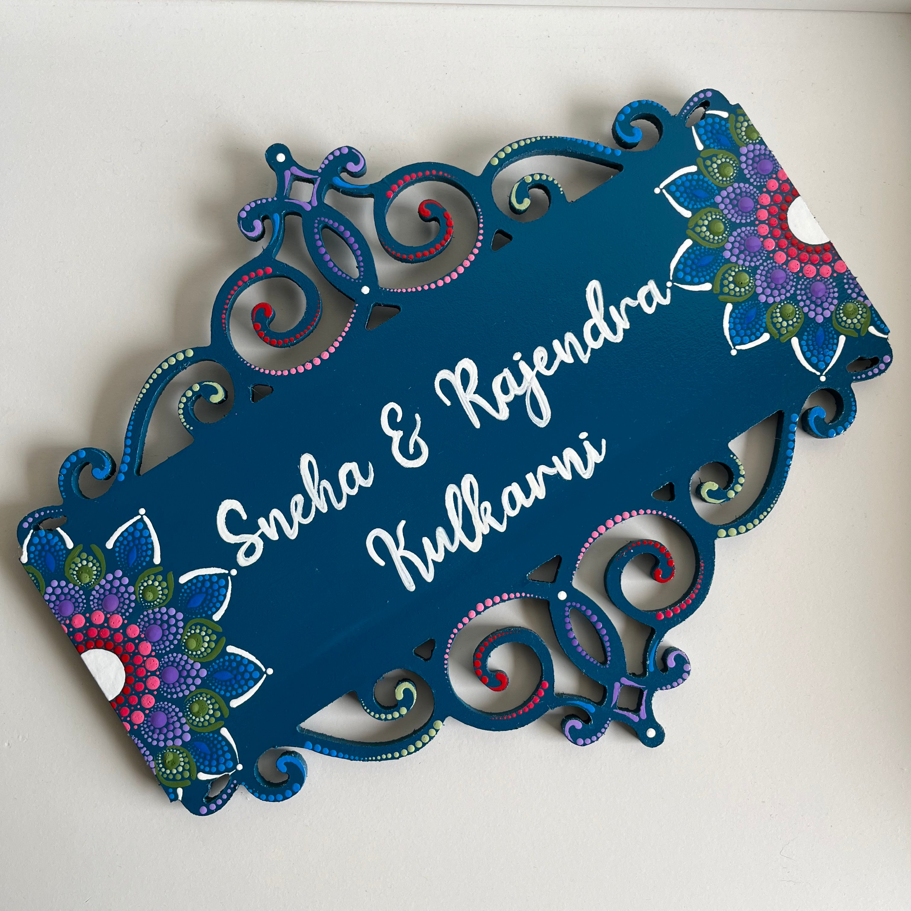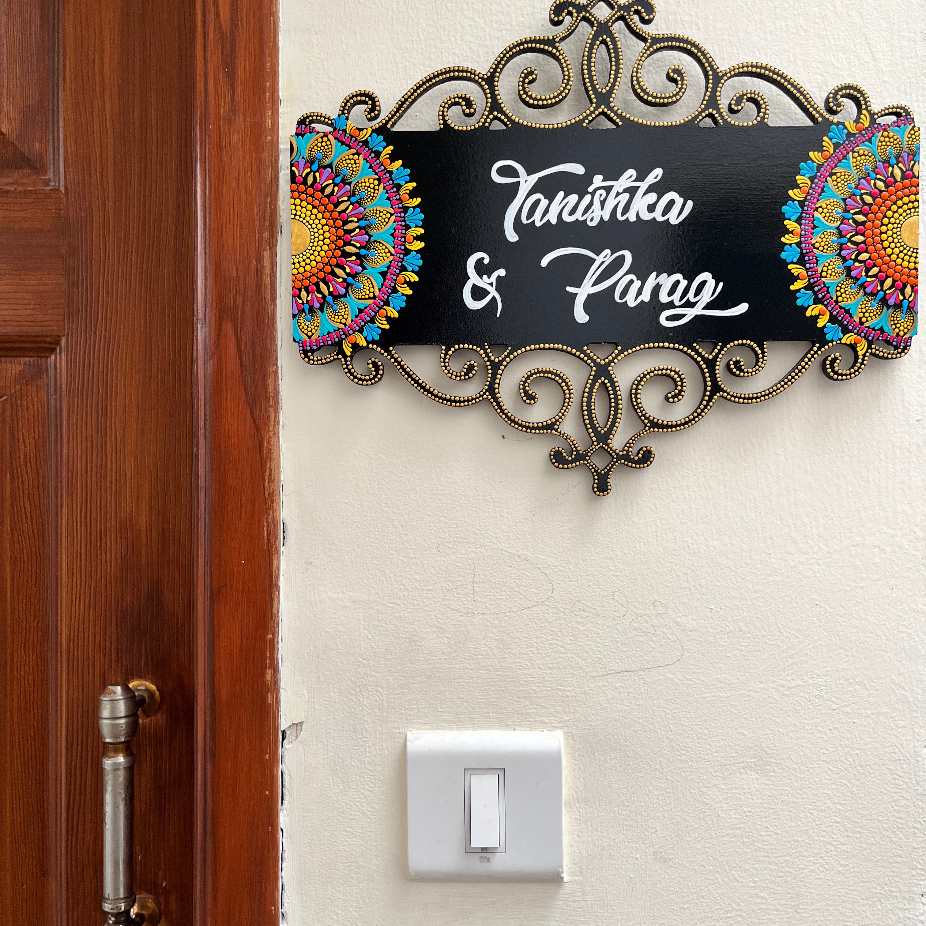 “We were looking out for Beautiful Name board for our new Home and then I came across the beautiful and mind blowing art done by Shrutika on Instagram done under the brand name of Nartika Creatives. In the very first look we were in Love of her art and chose the Name plate shown by her. It took 1 week for her to complete the work and throughout this she was very responsive on what's app, continuously sharing the progress of her work. We recieved the product and we just fell in love and were so happy and overwhelmed. Thank you so much and we wish you all the success you deserve.