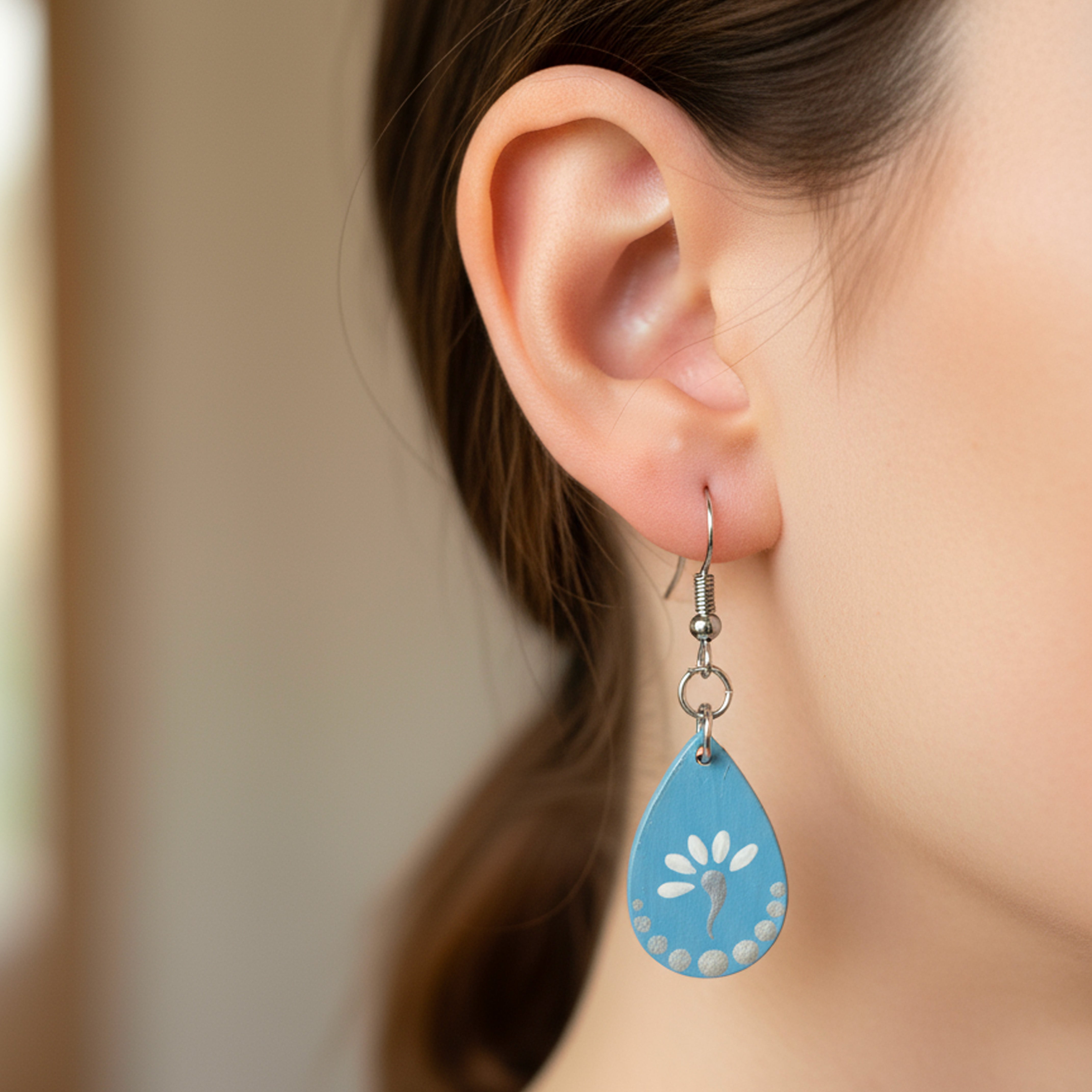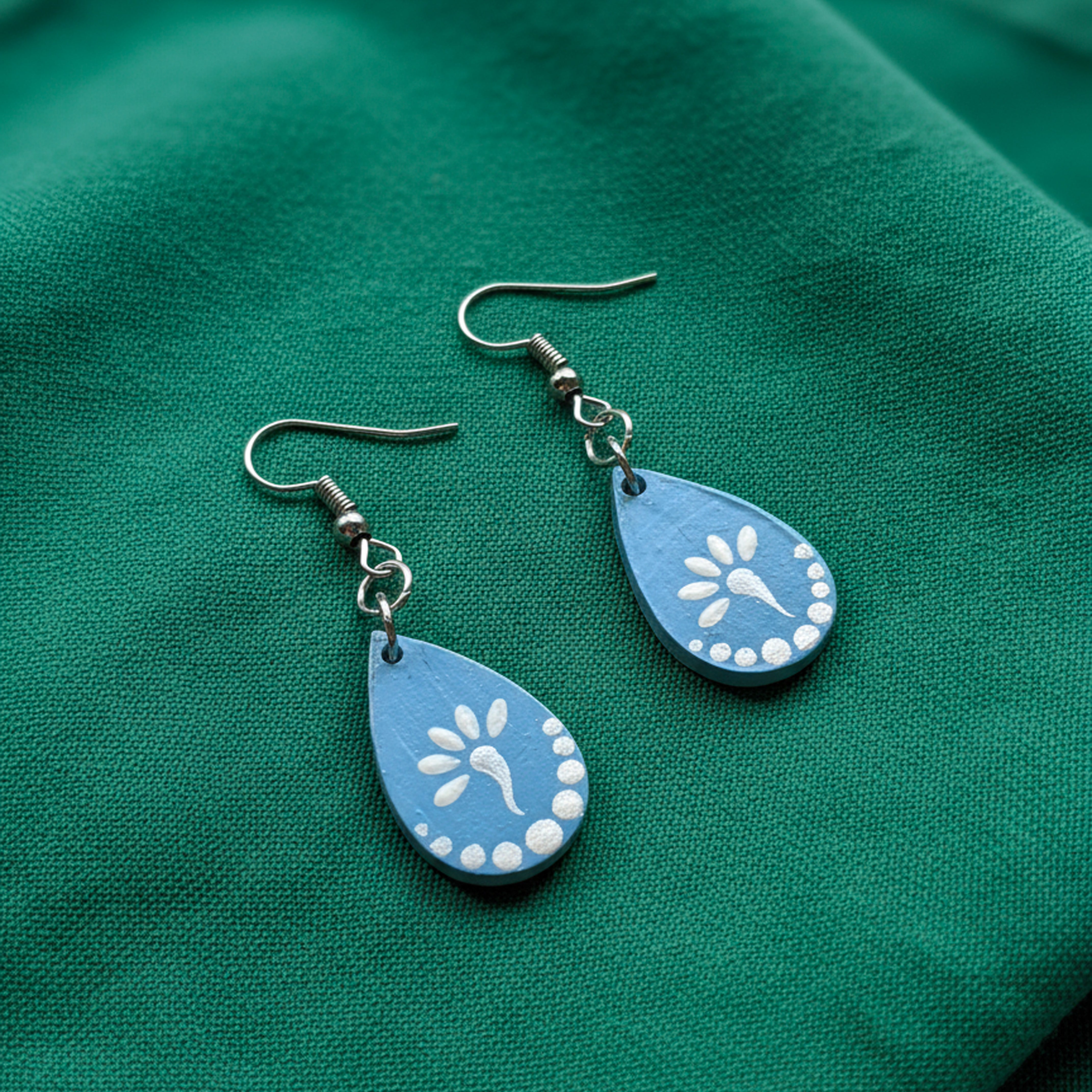 Blue Blossom Teardrop Earrings – Minimal Handpainted Mandala Charm