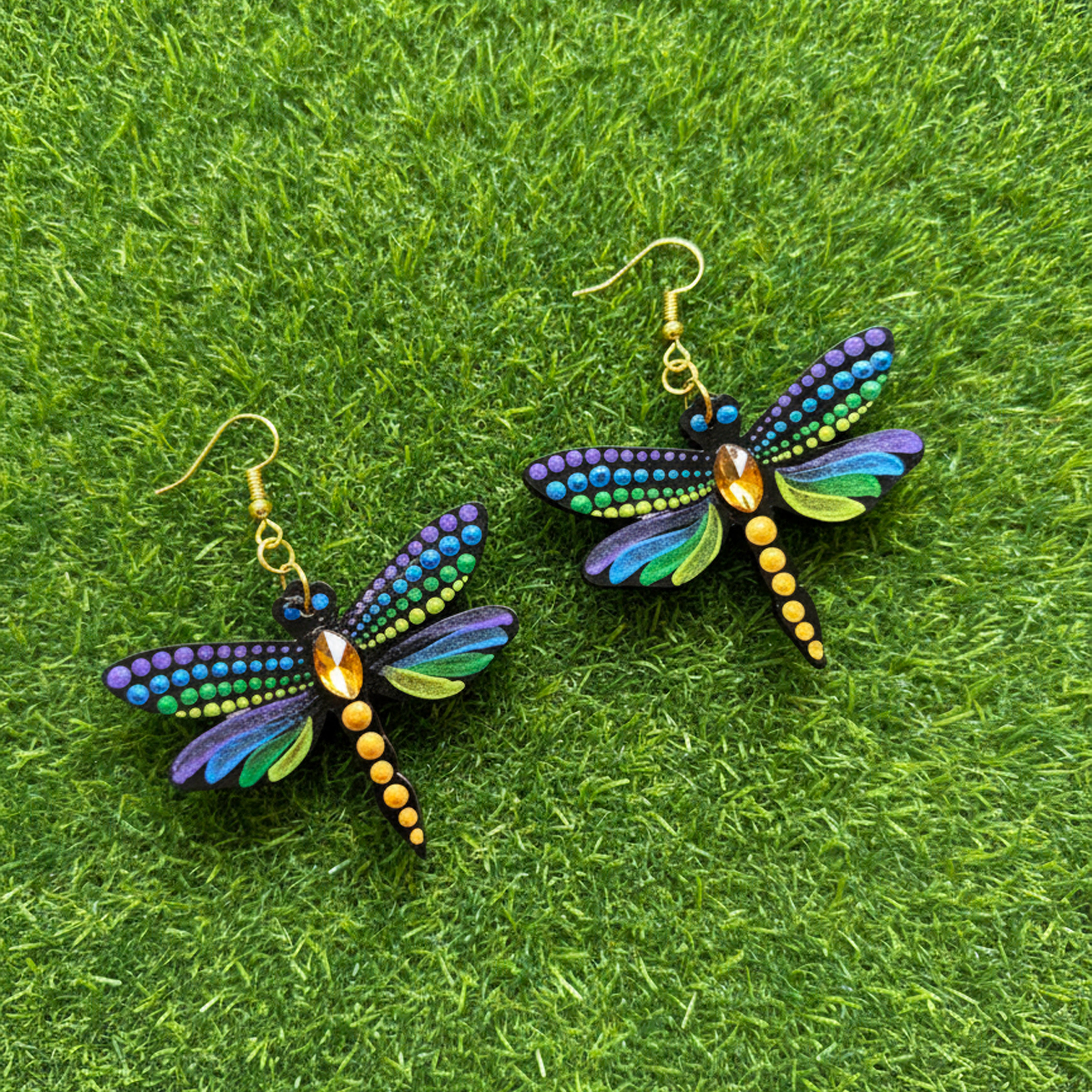 Mystic Dragonfly Mandala Earrings – Handpainted Art in Peacock Shades