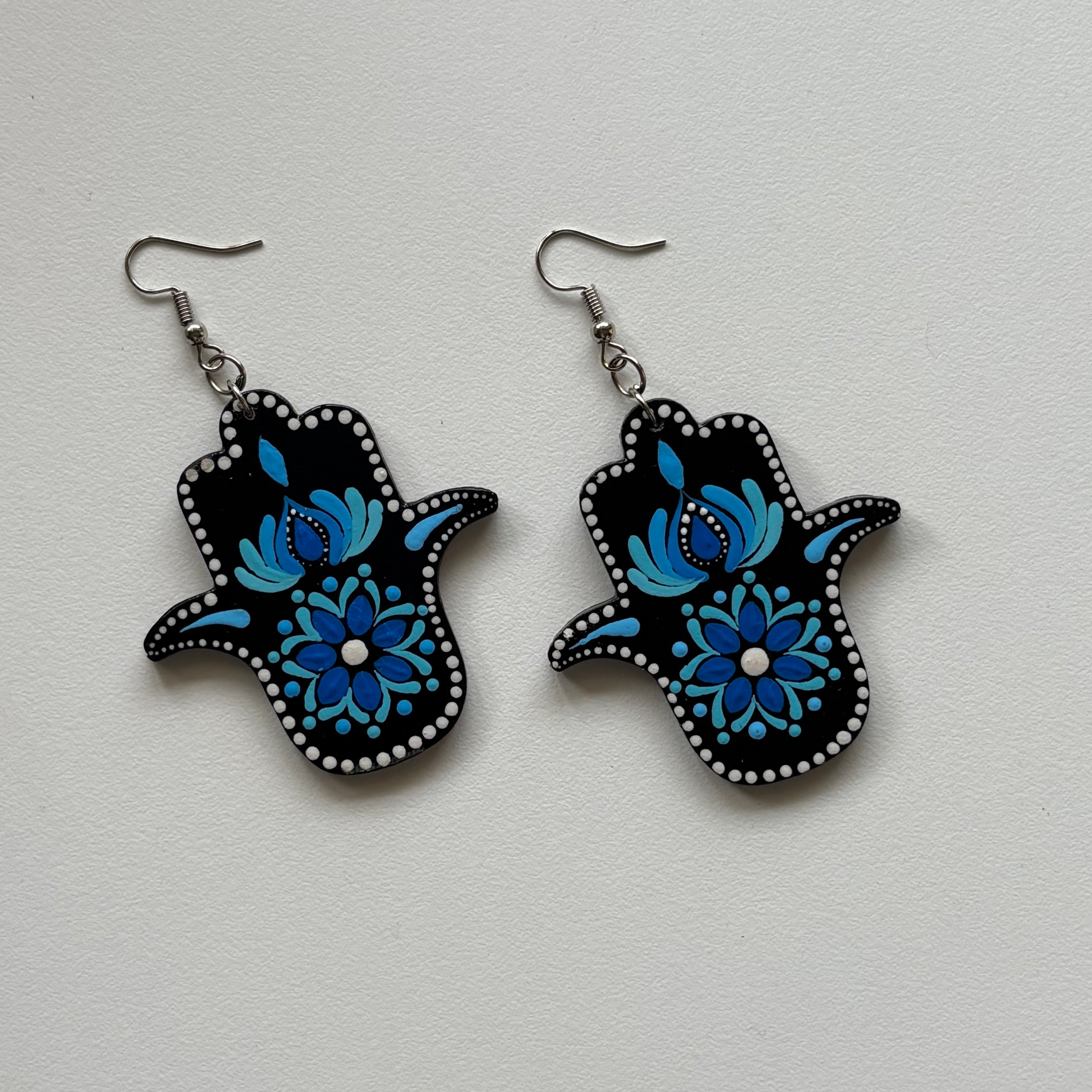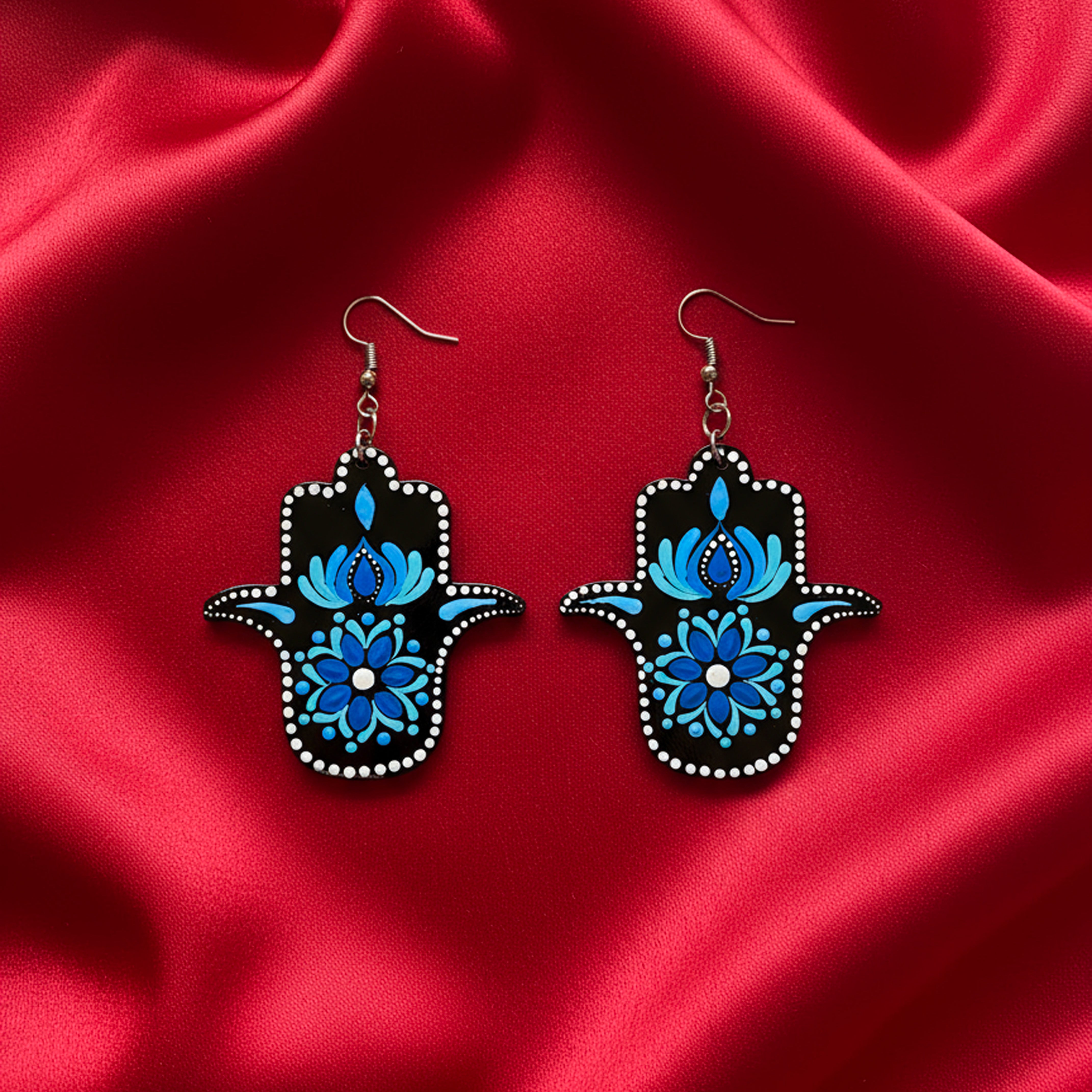 Hamsa Hand Dot Mandala Earrings – Shades of Blue