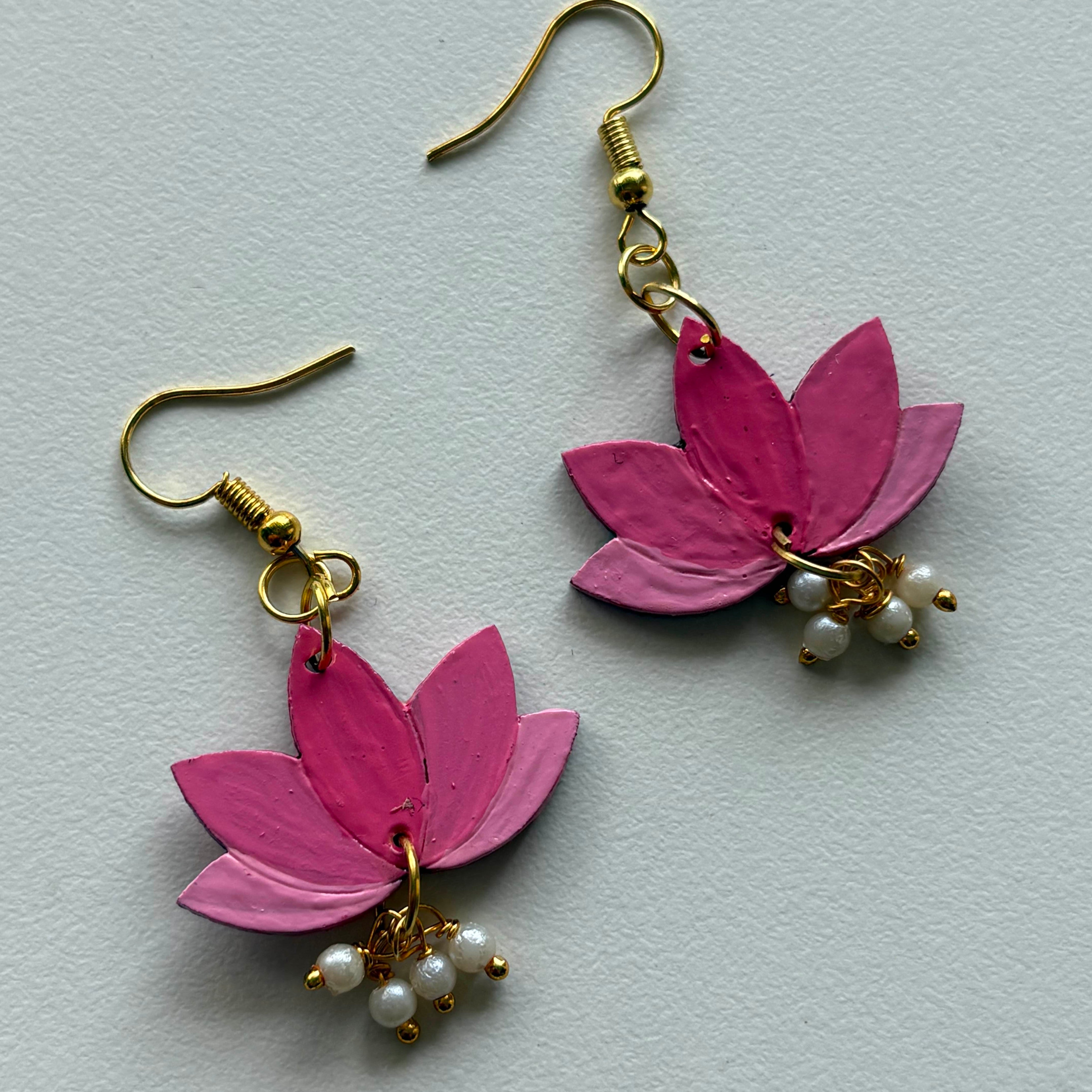 Pink Lotus Bloom Earrings – Handcrafted Elegance with Pearl Drops