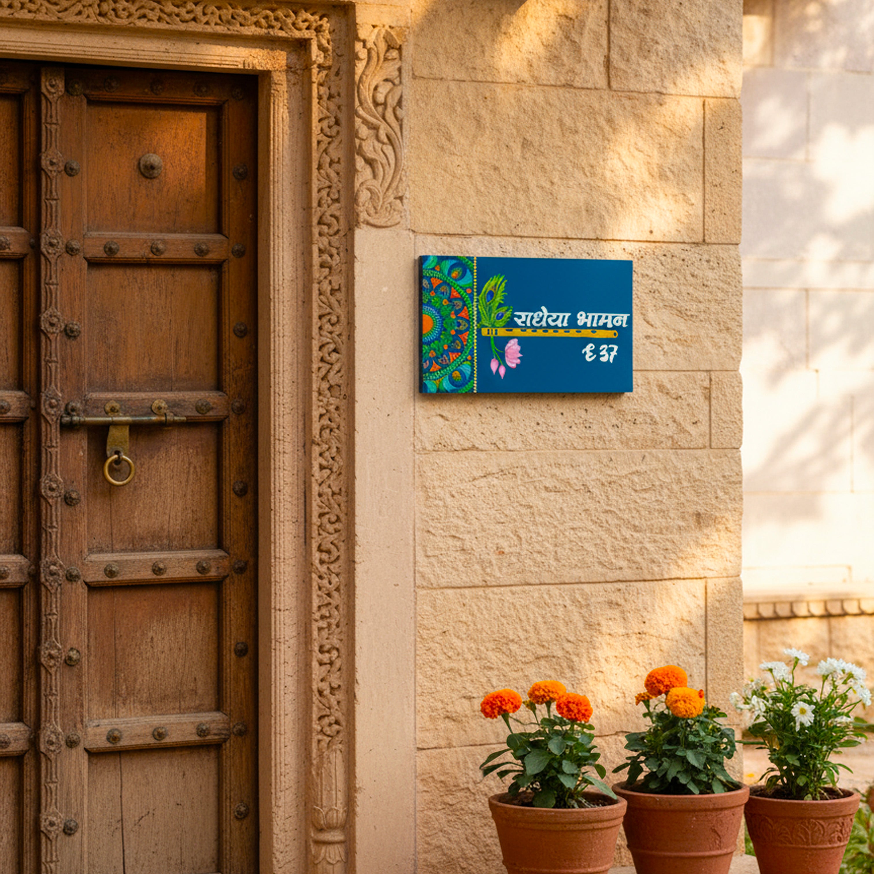 Traditional Dot Mandala Nameplate with Flute & Peacock Feather Design