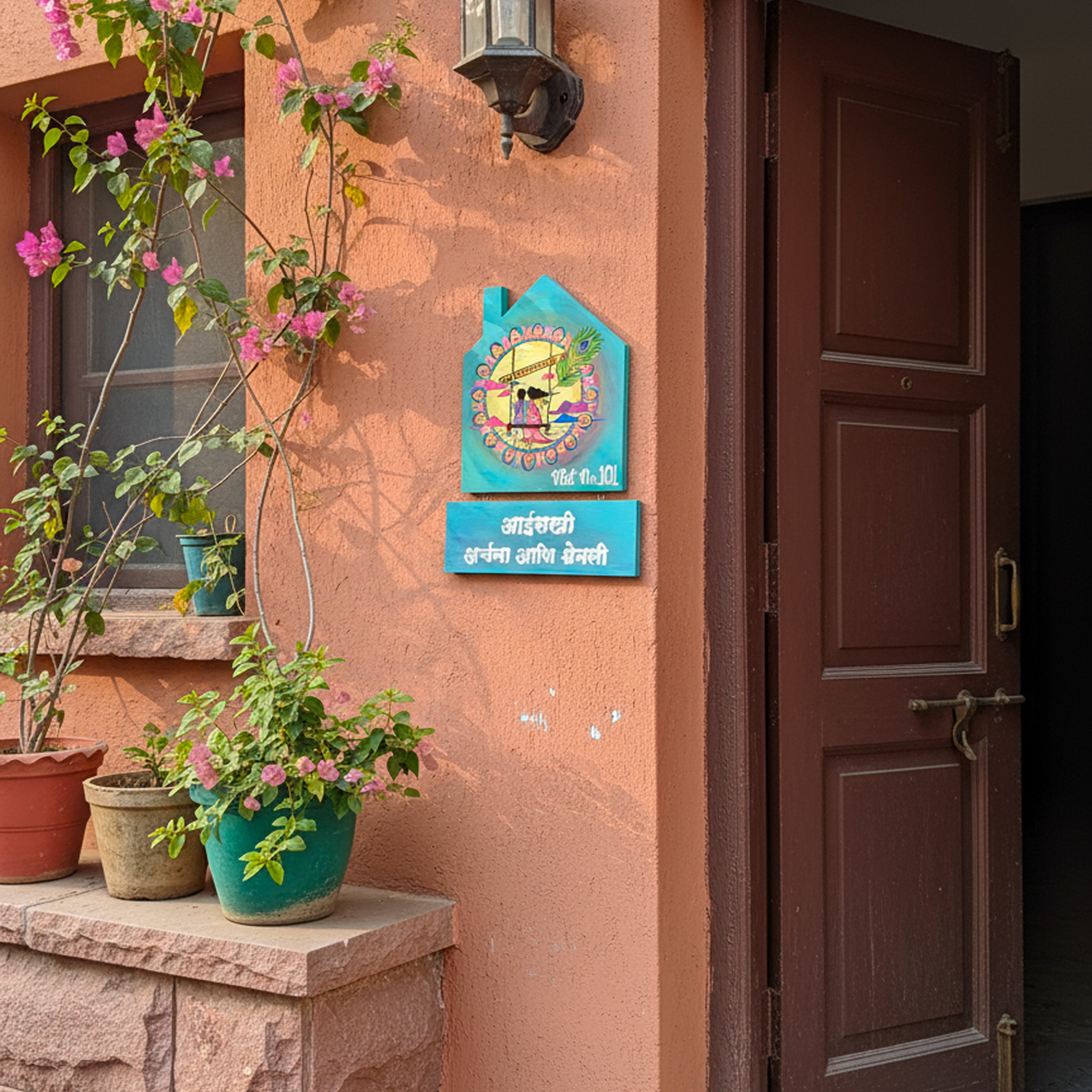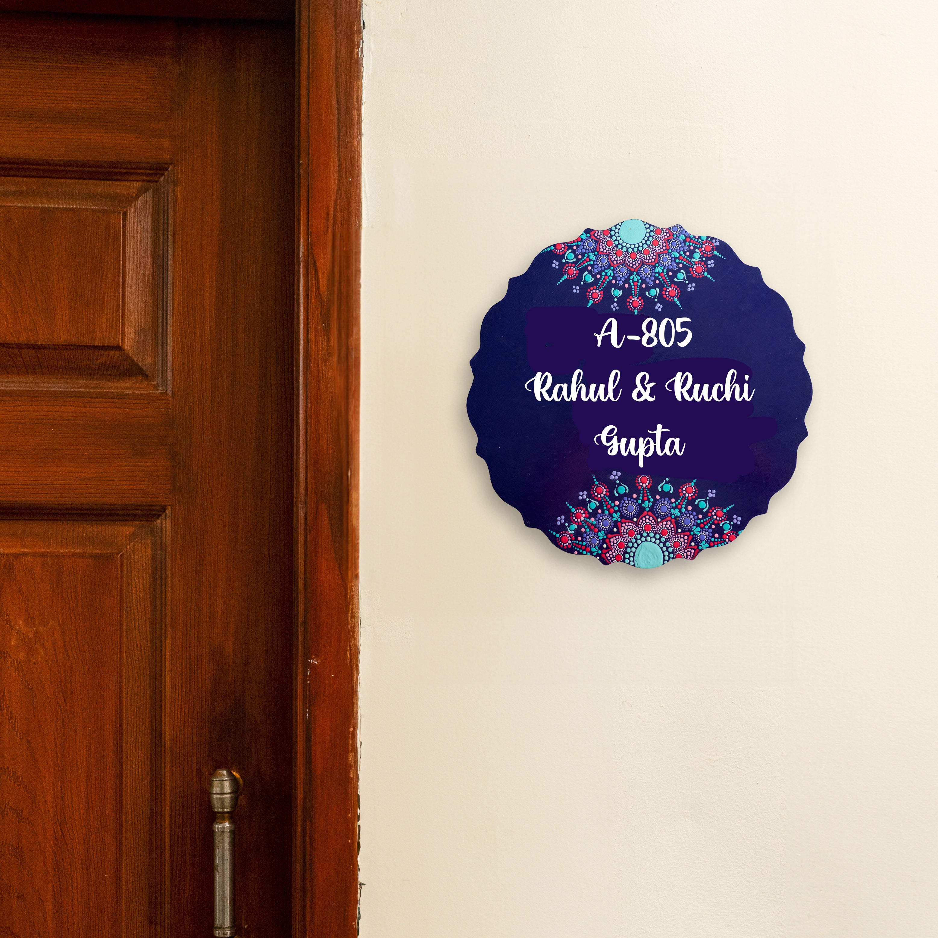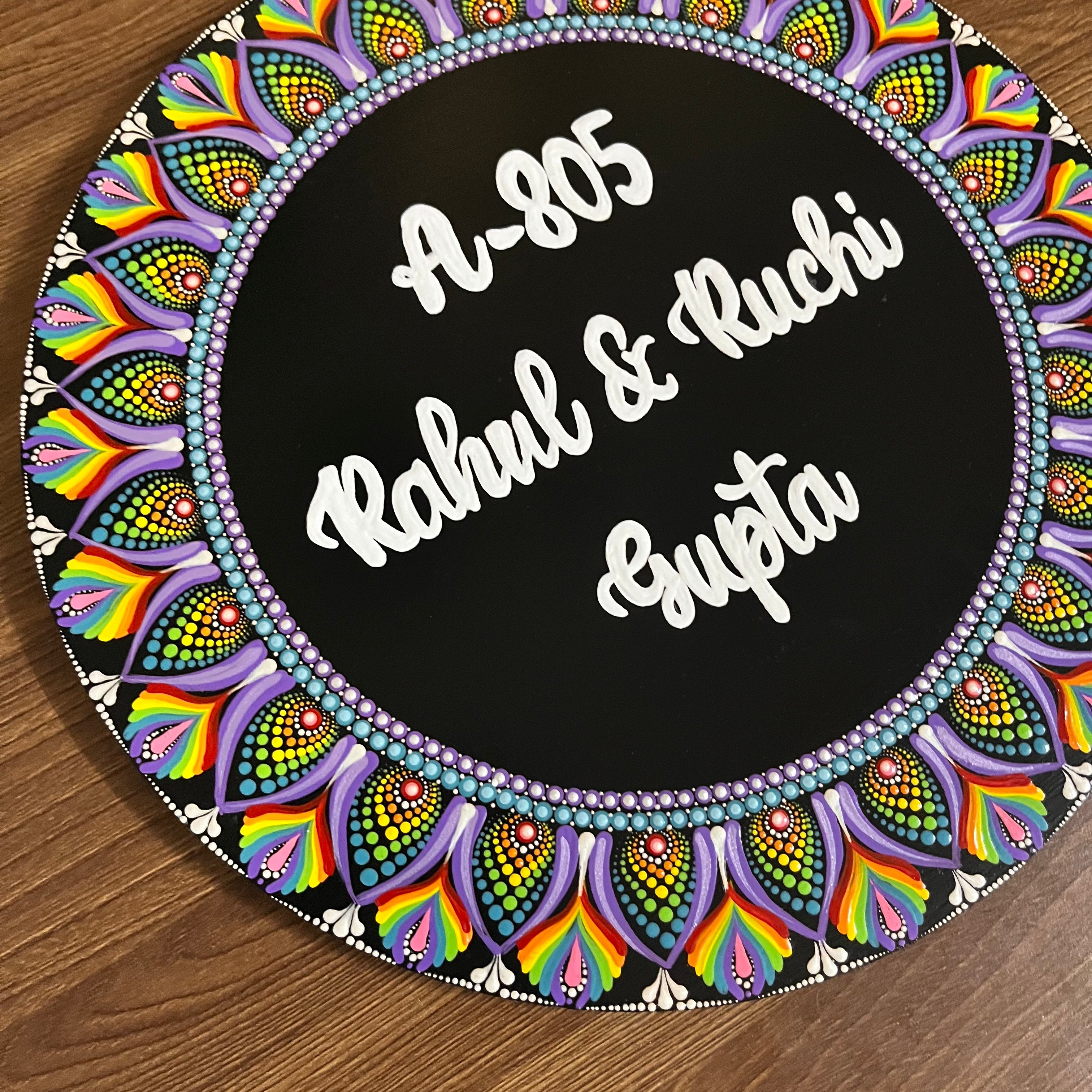 Personalized Handcrafted Home Dot Mandala Nameplate – Krishna Flute & Family Design