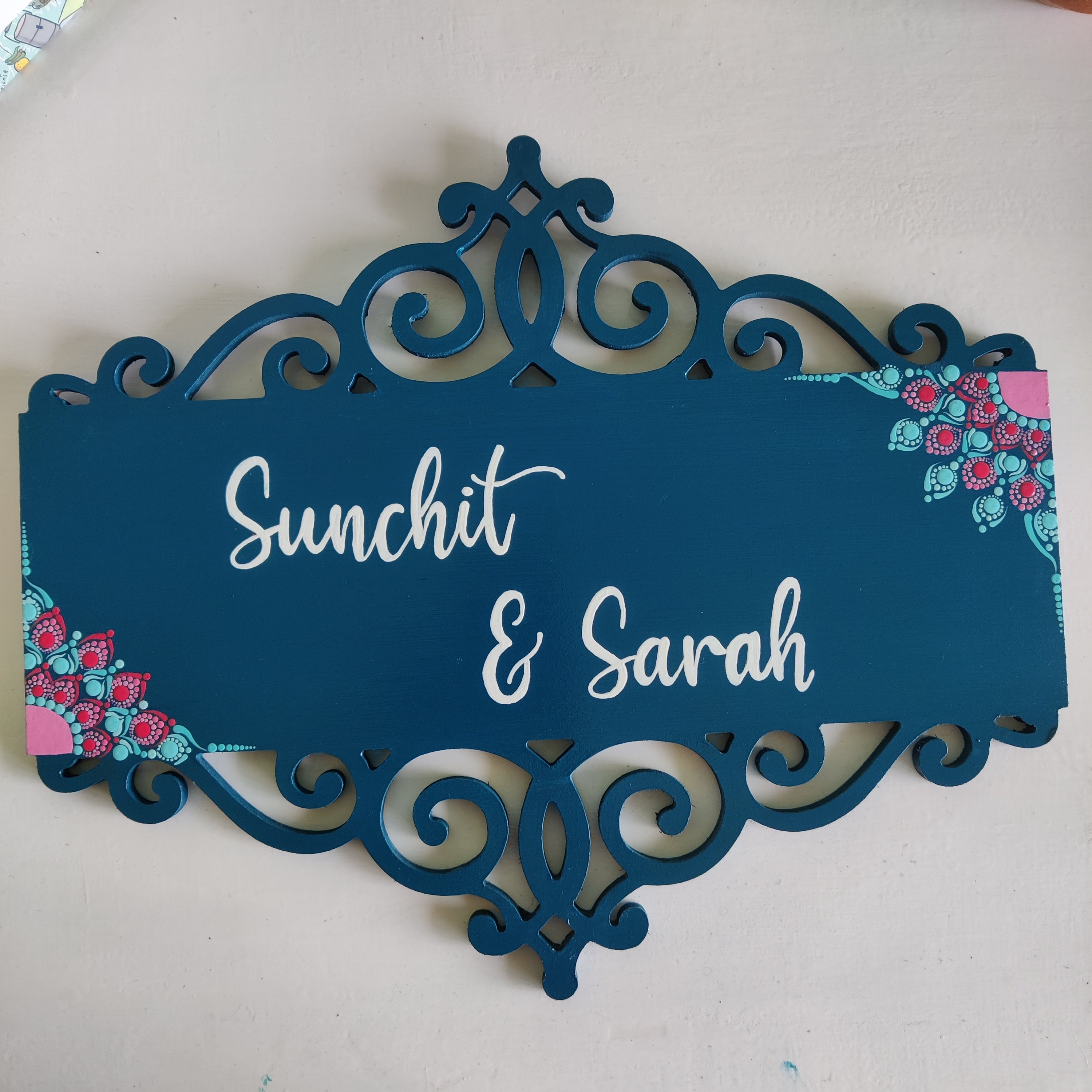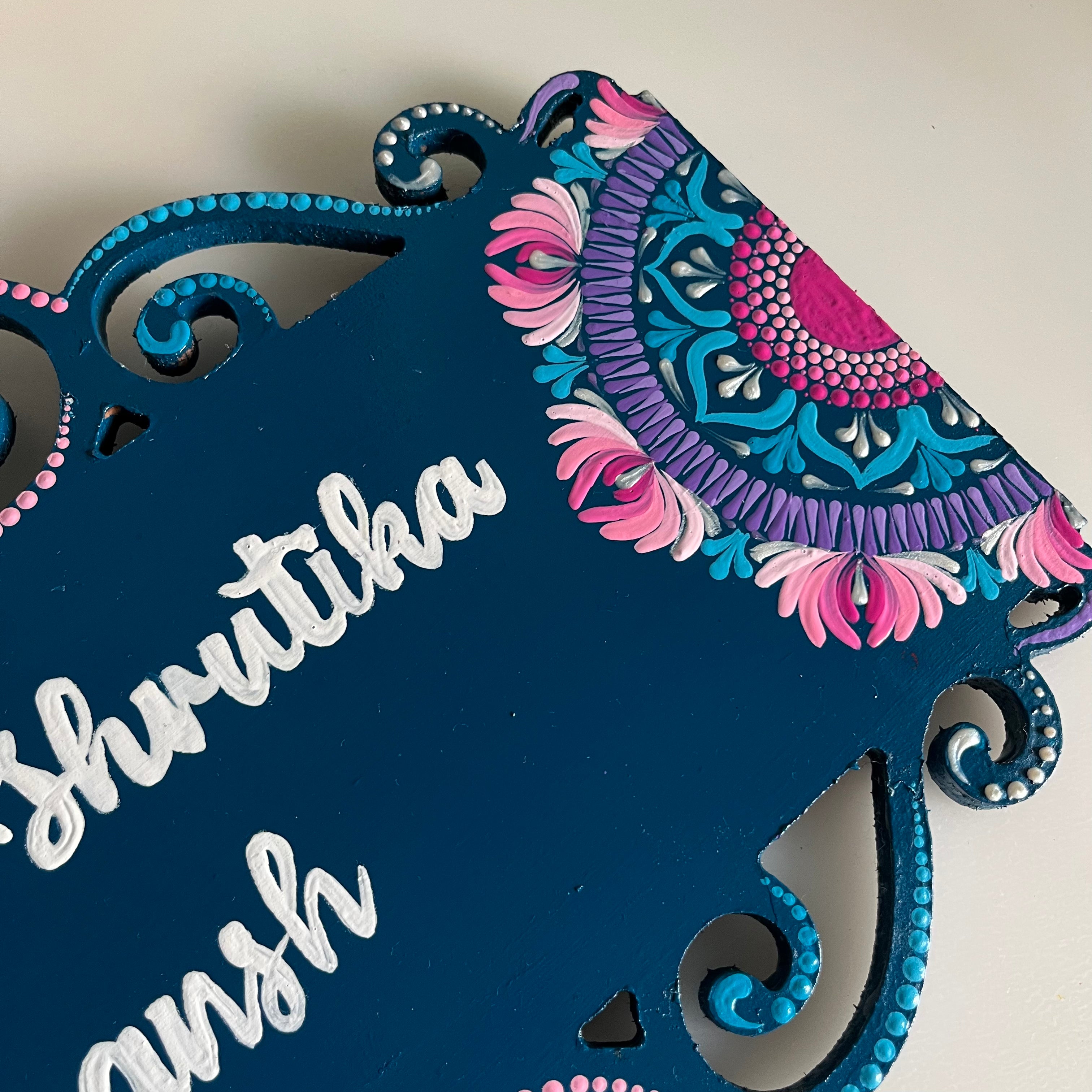 Turquoise & Pink Dot Mandala Corner Cutwork Nameplate – 3 Design Variants