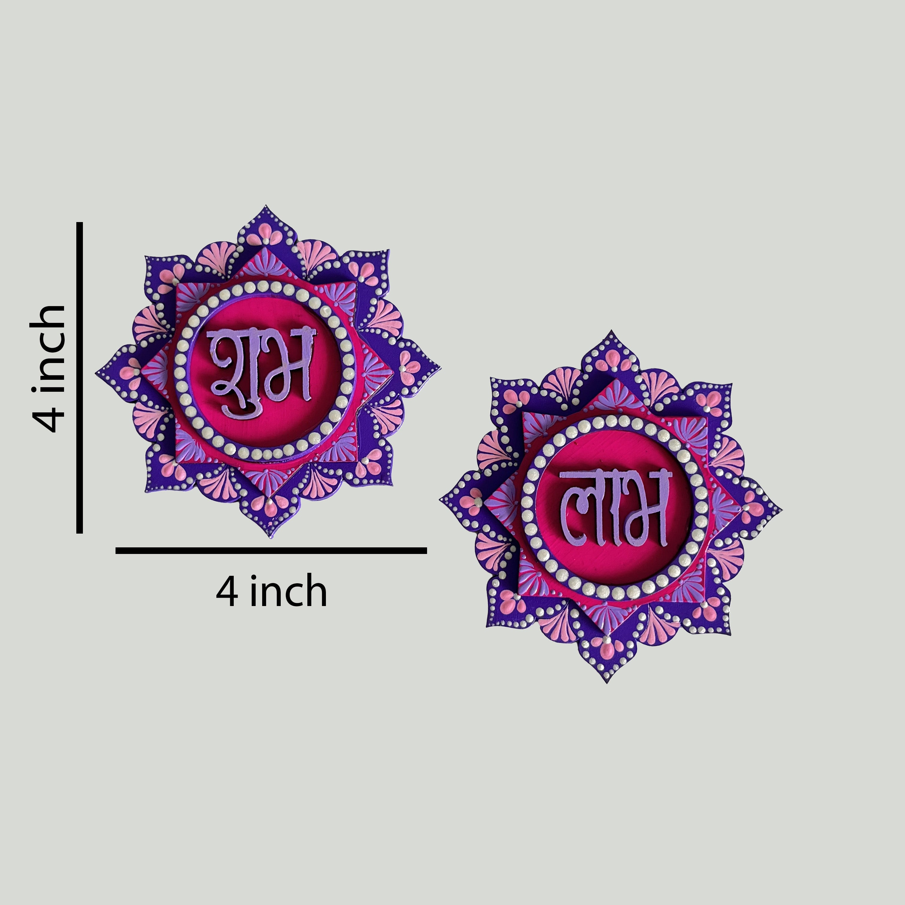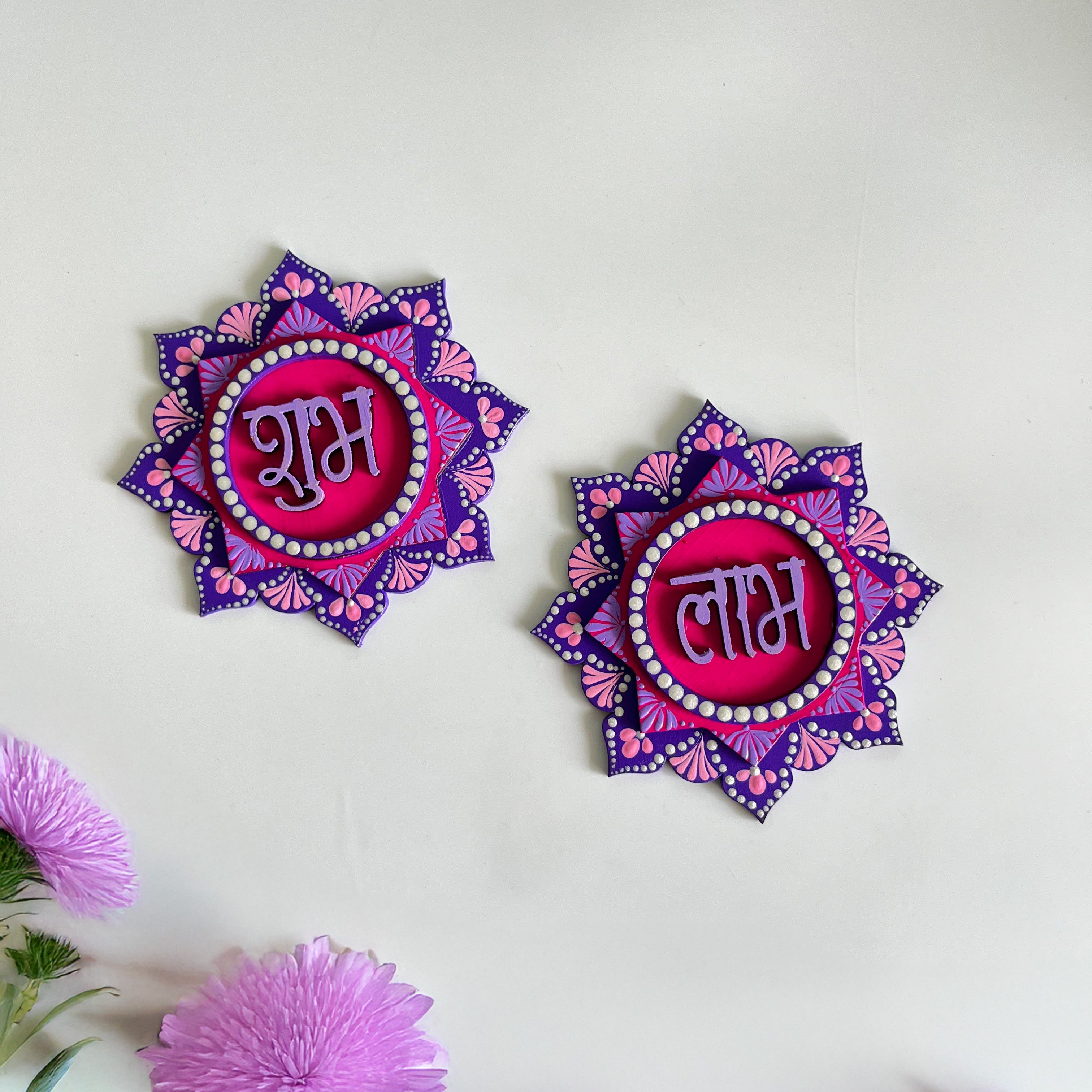 Handpainted Shubh Labh Wall Hanging – Flower Design in Purple & Pink (4x4 Inch)
