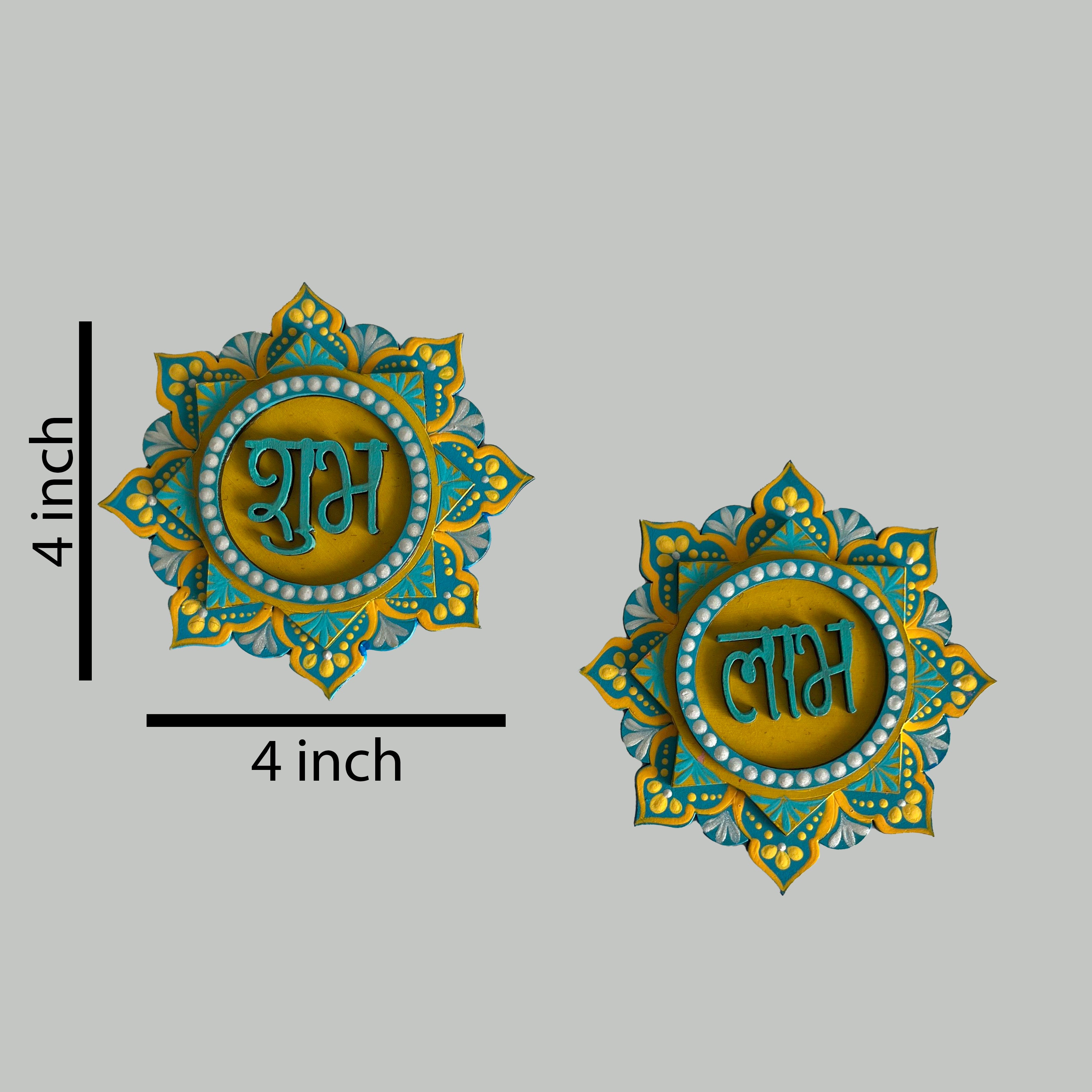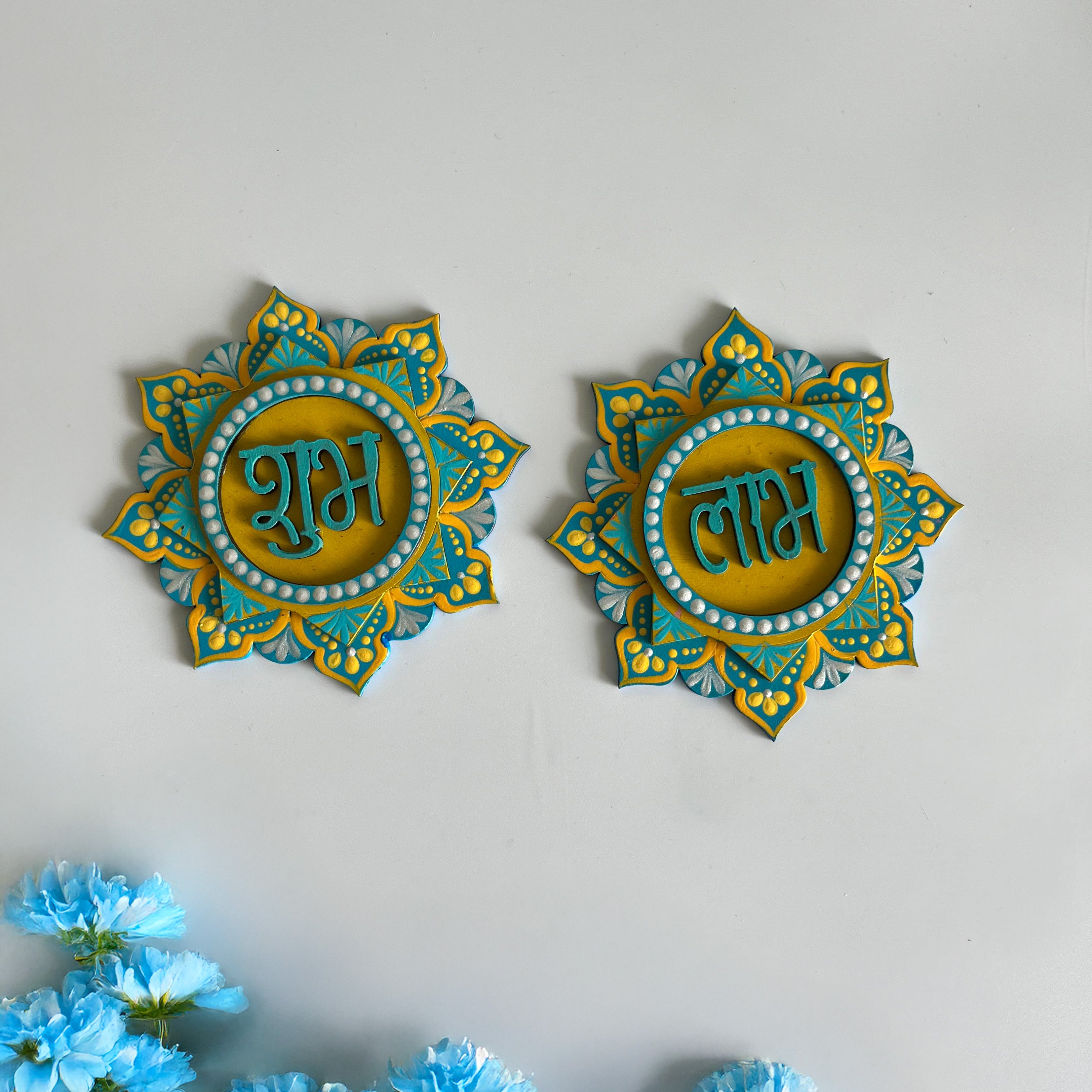 Handpainted Shubh Labh Wall Hanging – Flower Design in Teal and Yellow (4x4 Inch)