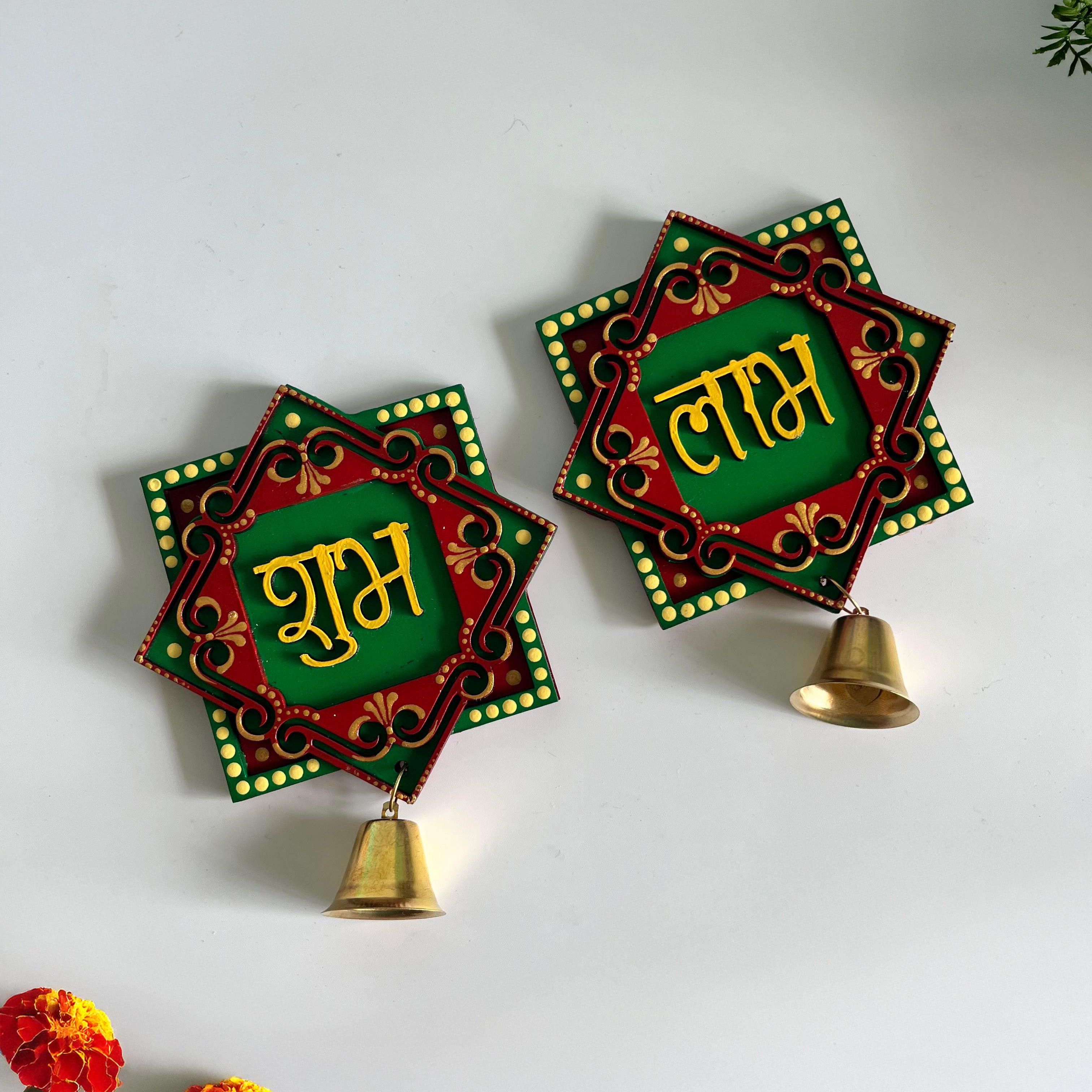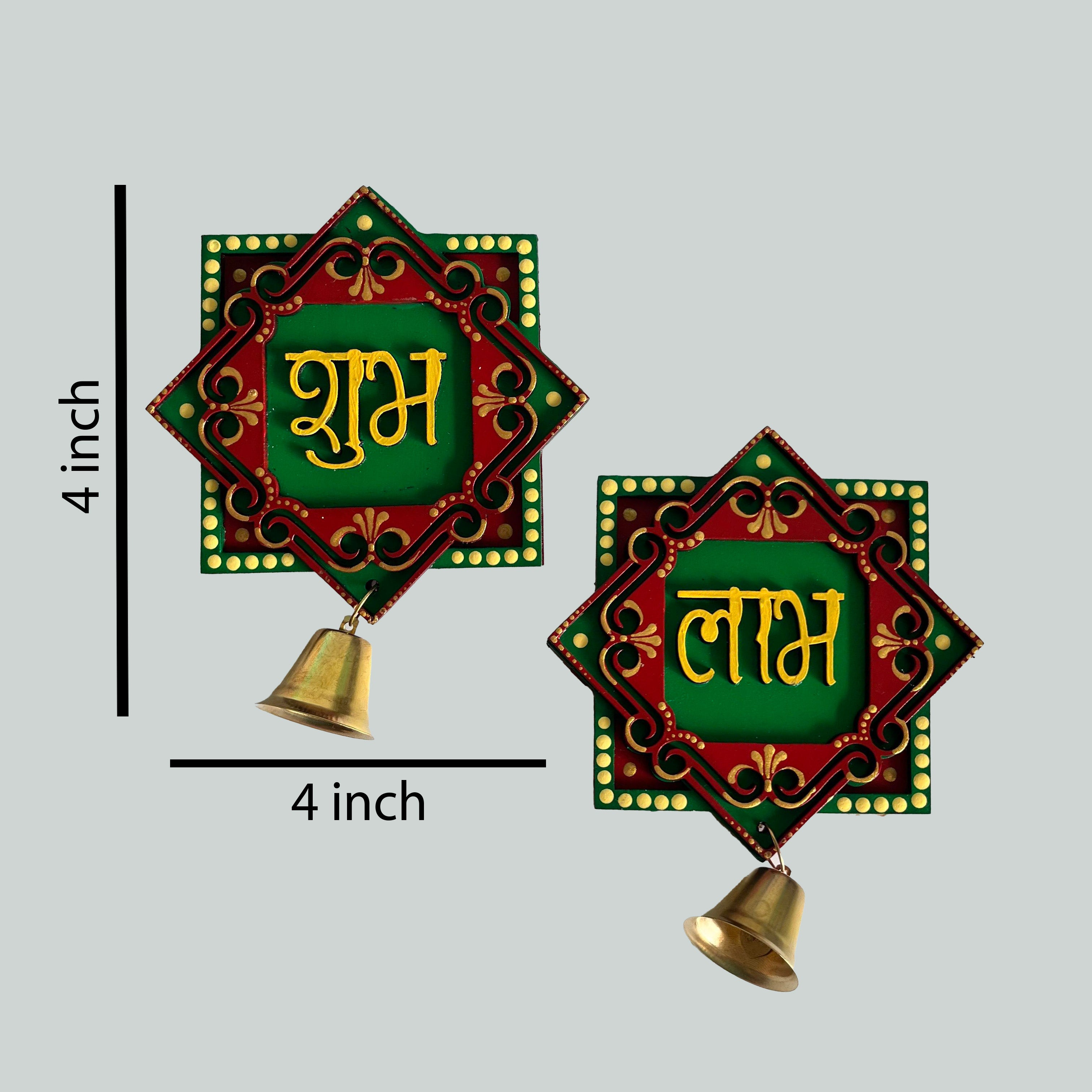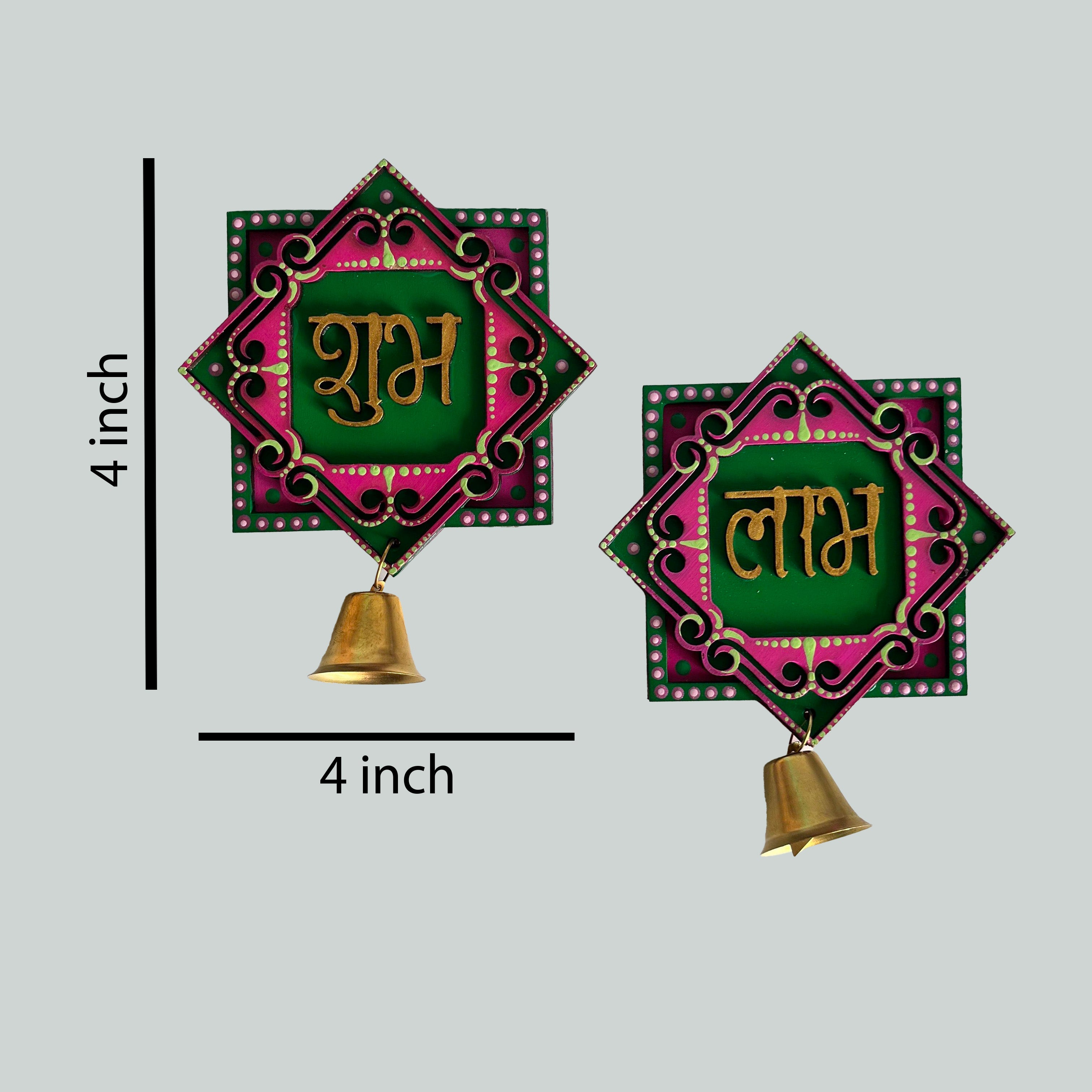 Handpainted Shubh Labh Wall Hanging with Decorative Bells – Red & Green Square (4x4 Inch)