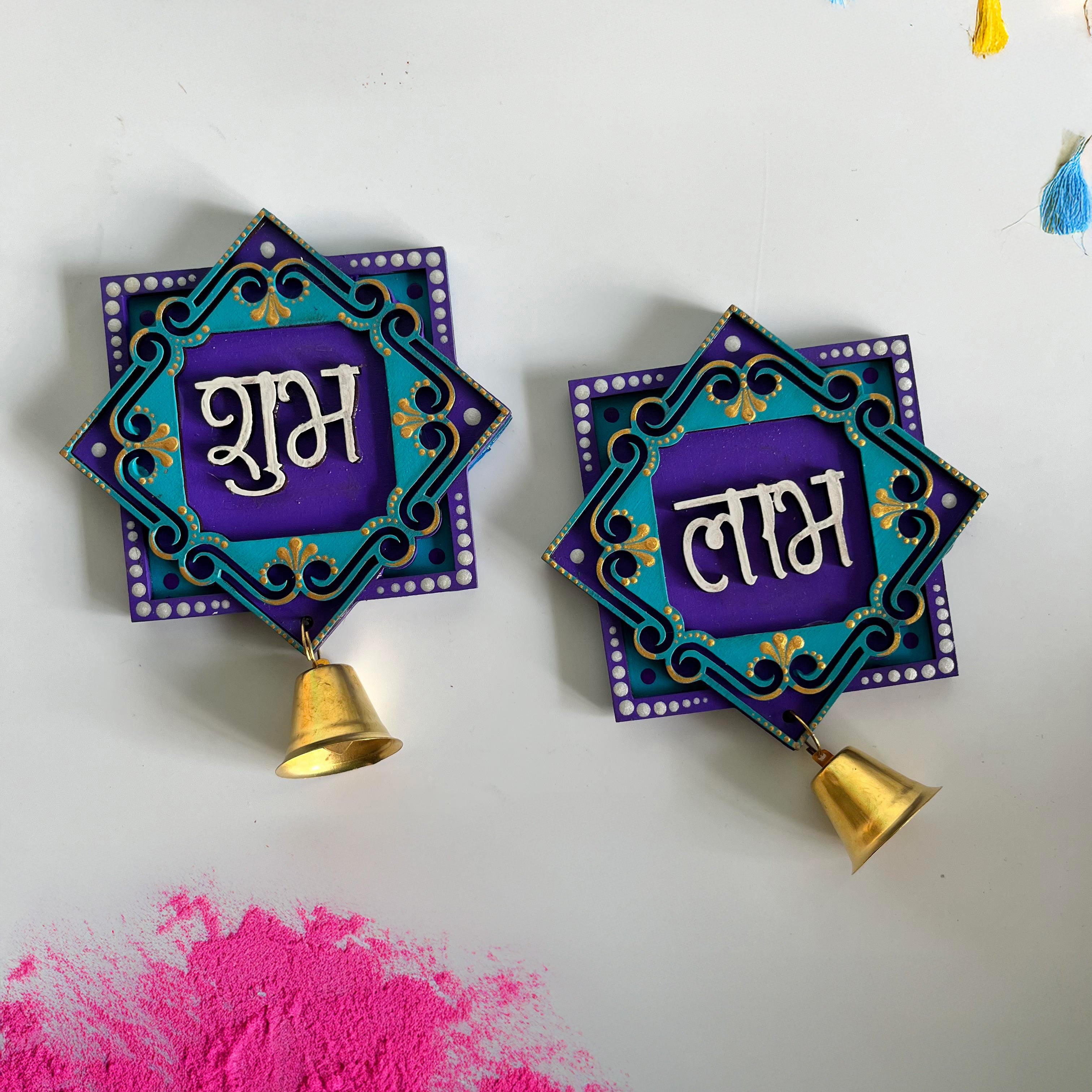 Handpainted Shubh Labh Wall Hanging with Decorative Bells – Turquoise & Purple Square (4x4 Inch)