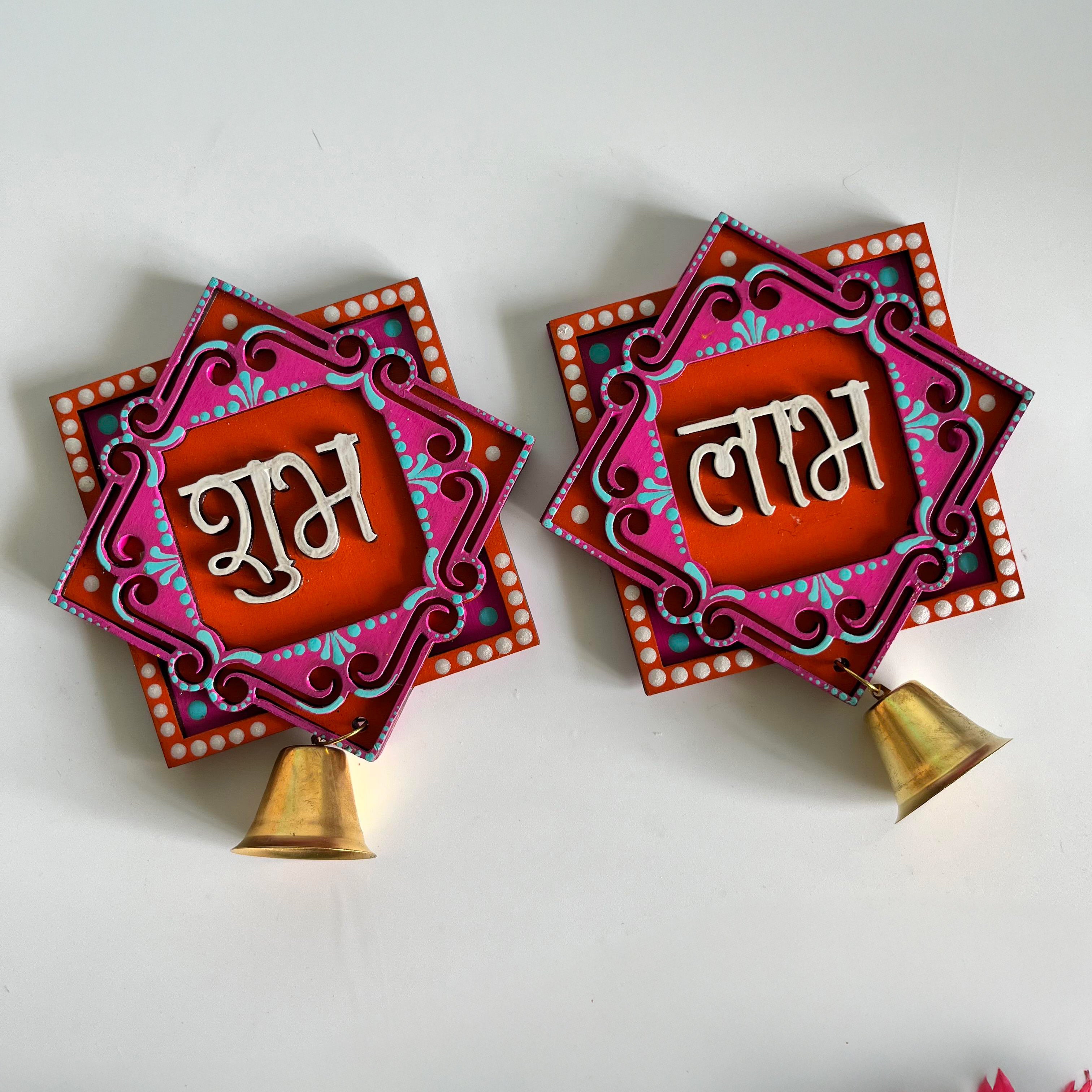 Handpainted Shubh Labh Wall Hanging with Decorative Bells – Orange & Pink Square (4x4 Inch)