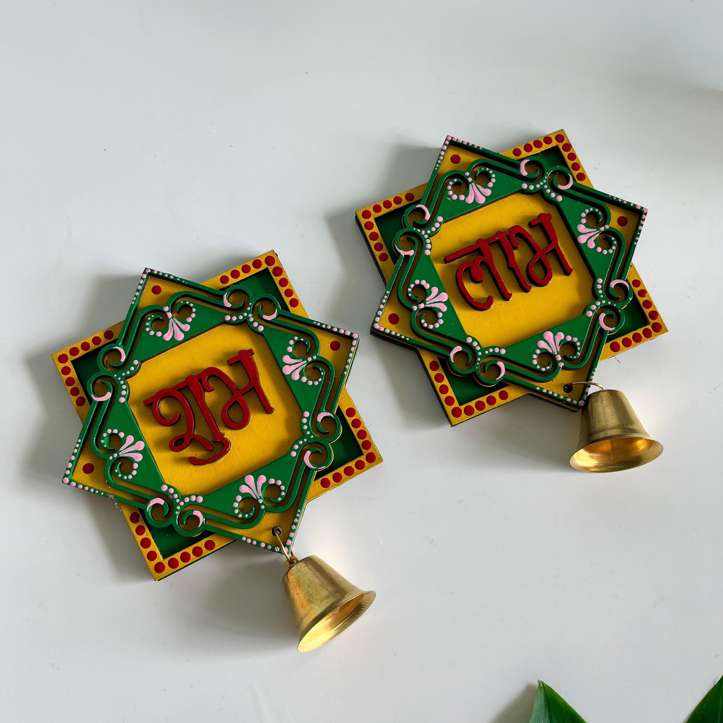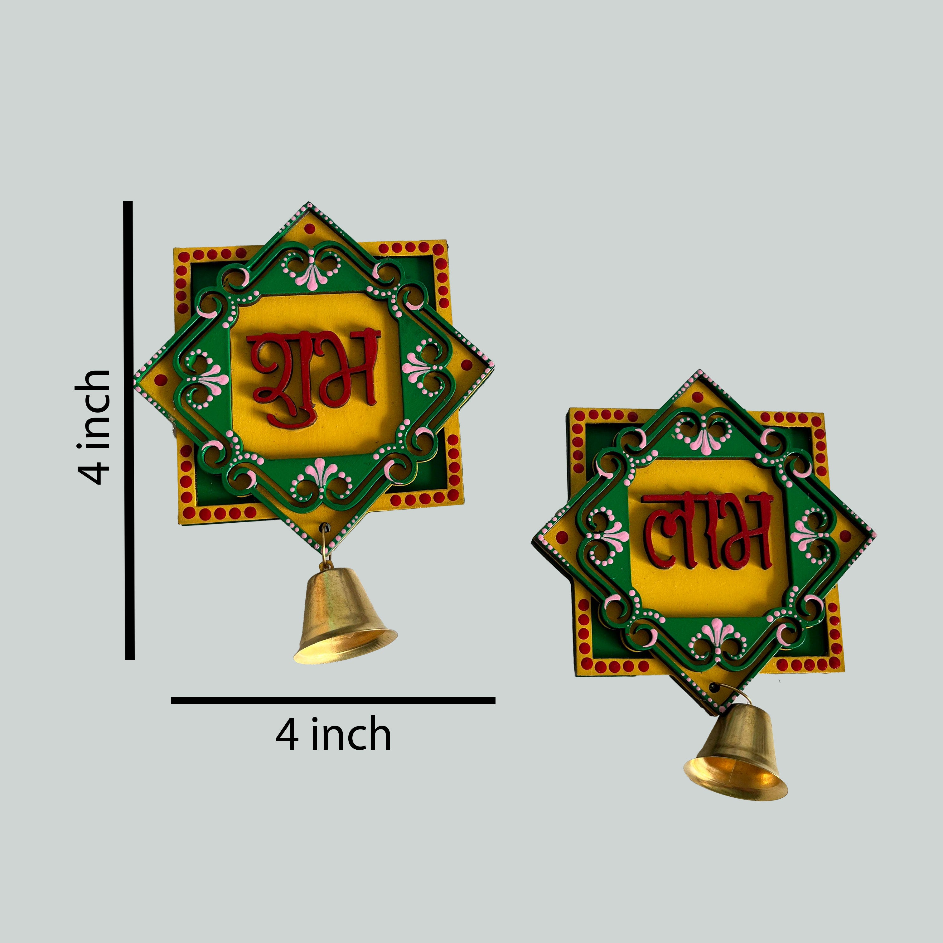 Handpainted Shubh Labh Wall Hanging with Decorative Bells – Green & Yellow Square (4x4 Inch)