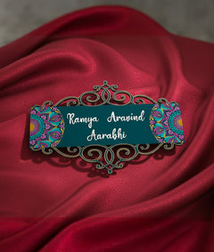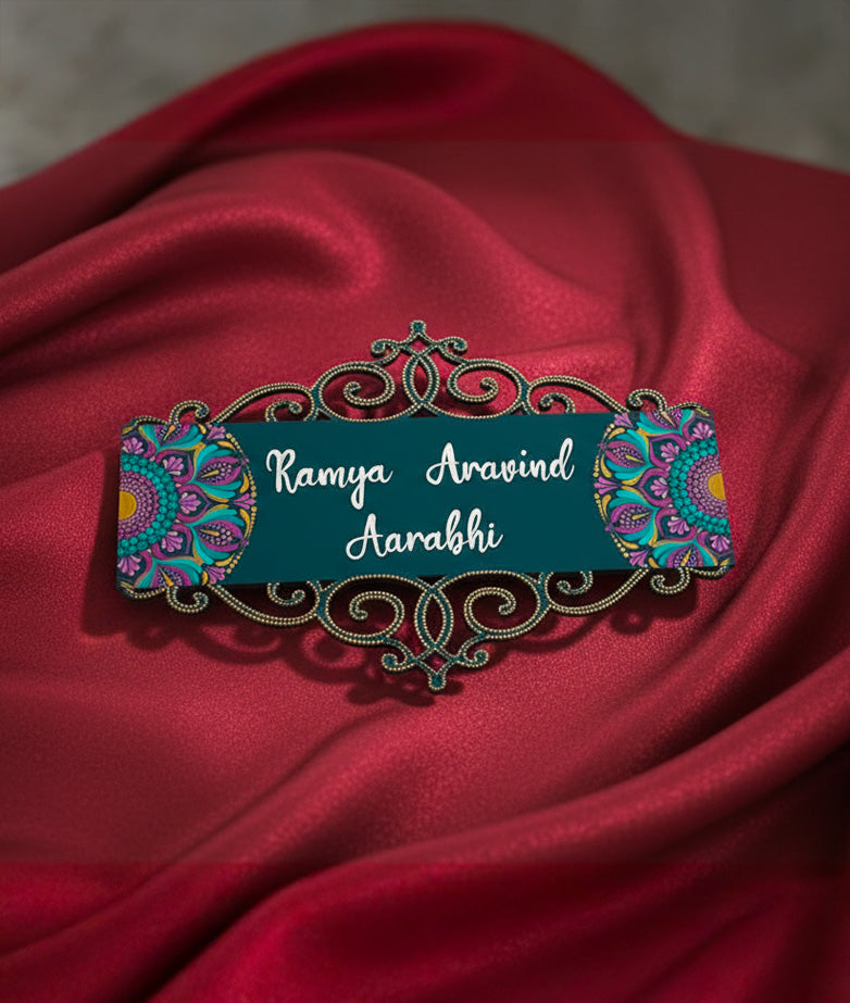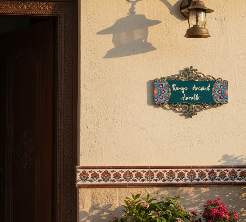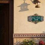 This 18-inch Hand-Painted Wooden Nameplate beautifully blends functionality with artistry. Designed on MDF with an elegant wrought-iron frame, it is adorned with vibrant dot mandala art on both sides, making it a striking piece for your entrance. The central teal base is personalized with names in white, while the colorful mandala borders bring charm and positivity to your doorway. A perfect blend of tradition and modern aesthetics, this nameplate is not just a sign but a piece of art that welcomes guests with warmth and elegance.