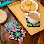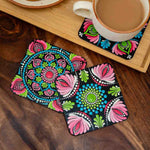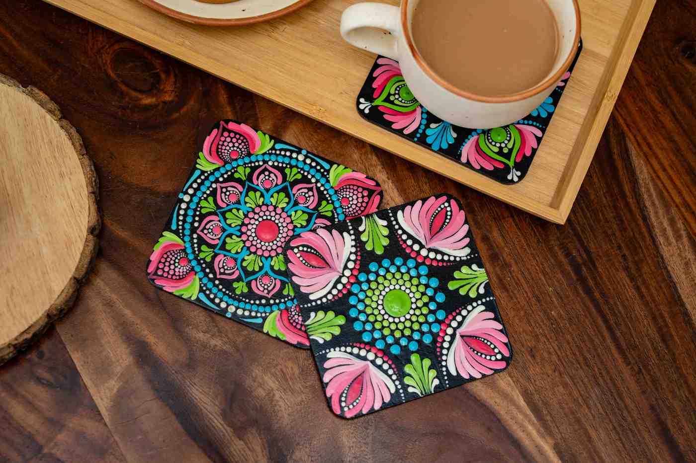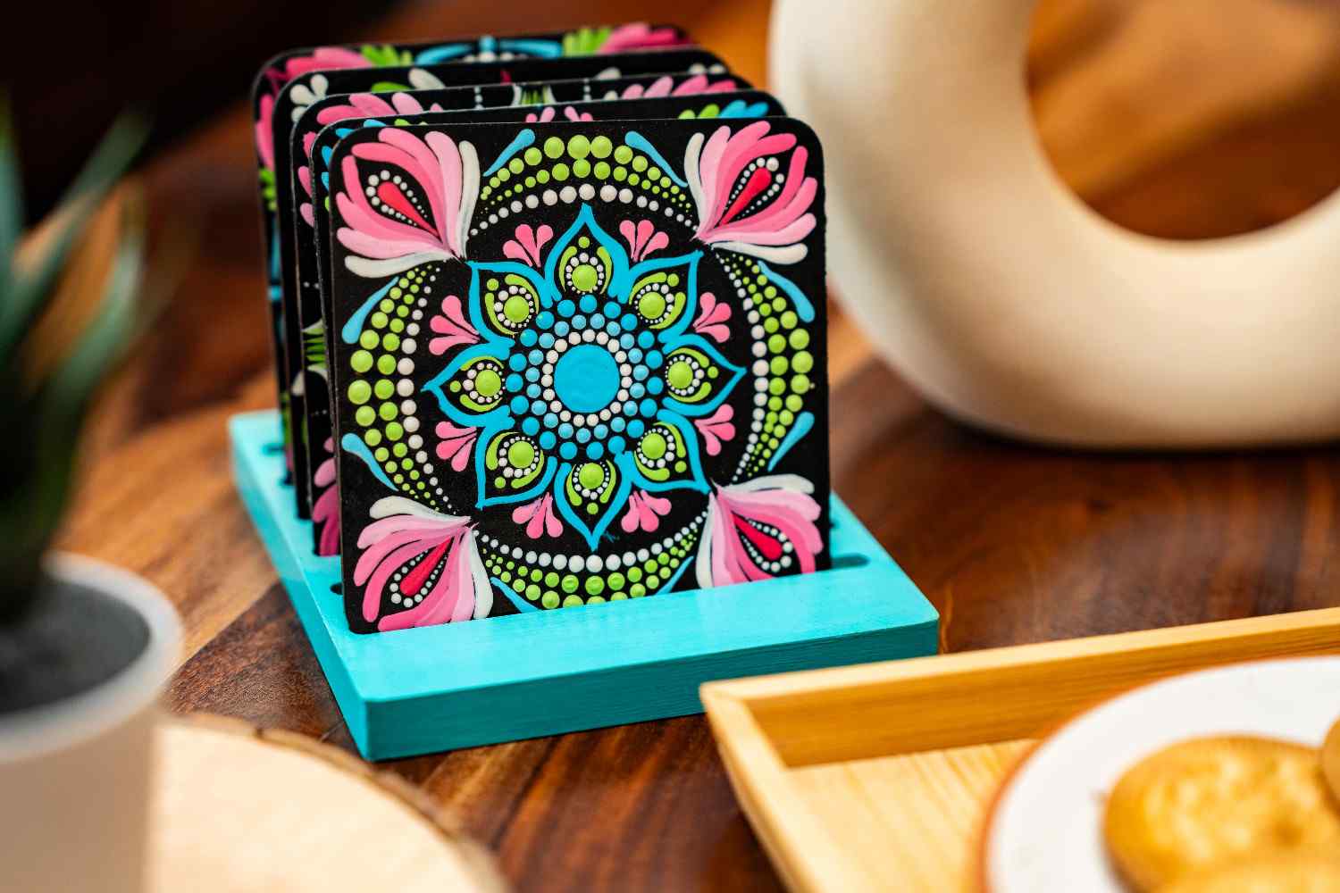 Brighten your table space with this hand painted mandala dot coaster set . Featuring vibrant shades of aqua blue, lime green, pink, and white against a bold black base, these coasters bring a perfect balance of elegance and cheer. Each piece is meticulously crafted using the dot mandala technique, celebrating patience, precision, and the joy of handmade art.
