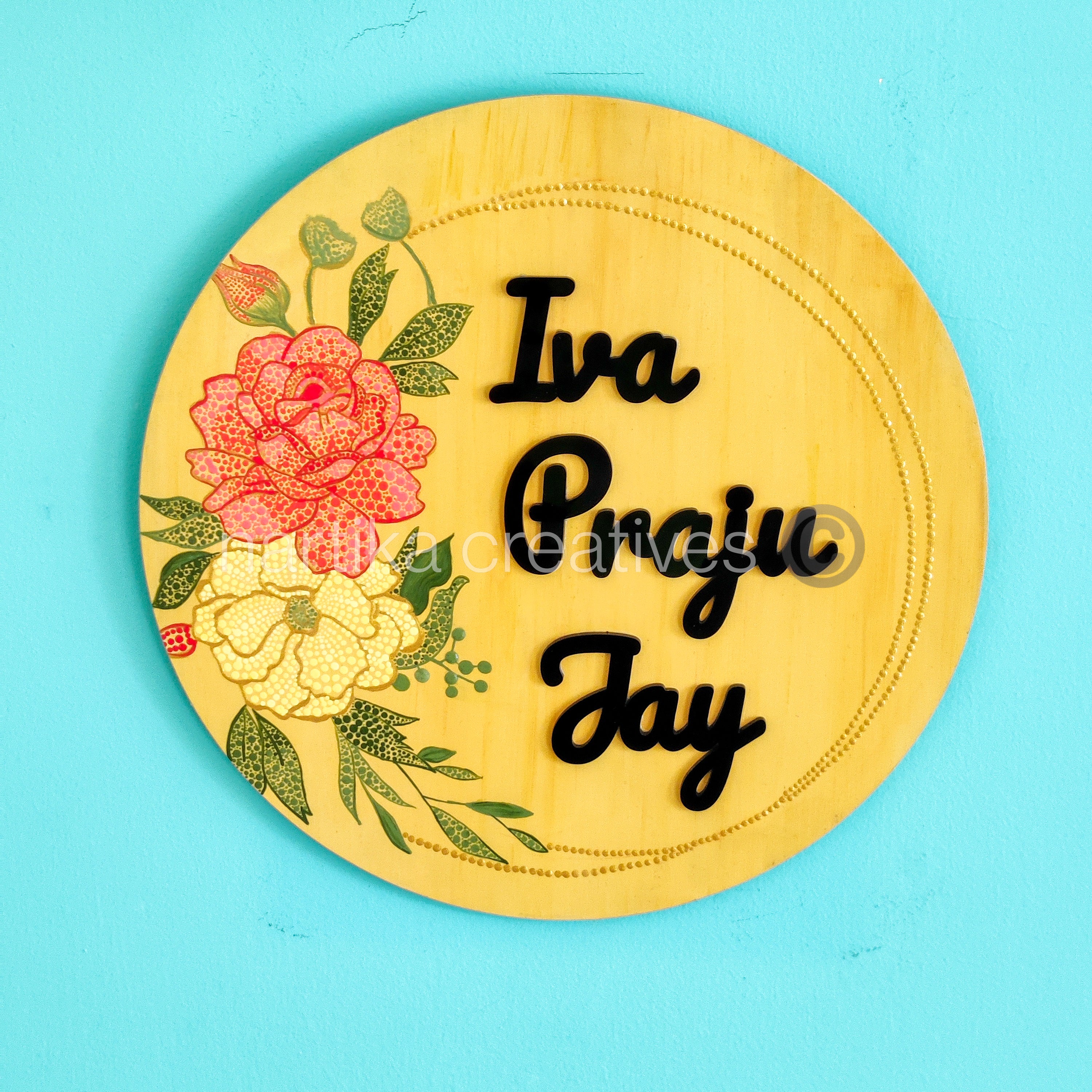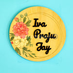 Hand-painted on a sturdy MDF base, this 12-inch round nameplate features intricate floral designs in soft pink, cheerful yellow, and lush green against a bright golden-yellow background. The delicate combination of dot work and brushstrokes creates a unique, textured finish that frames your personalized names beautifully. Each piece is varnish-sealed for water resistance and durability, ensuring it remains a cheerful welcome for years.