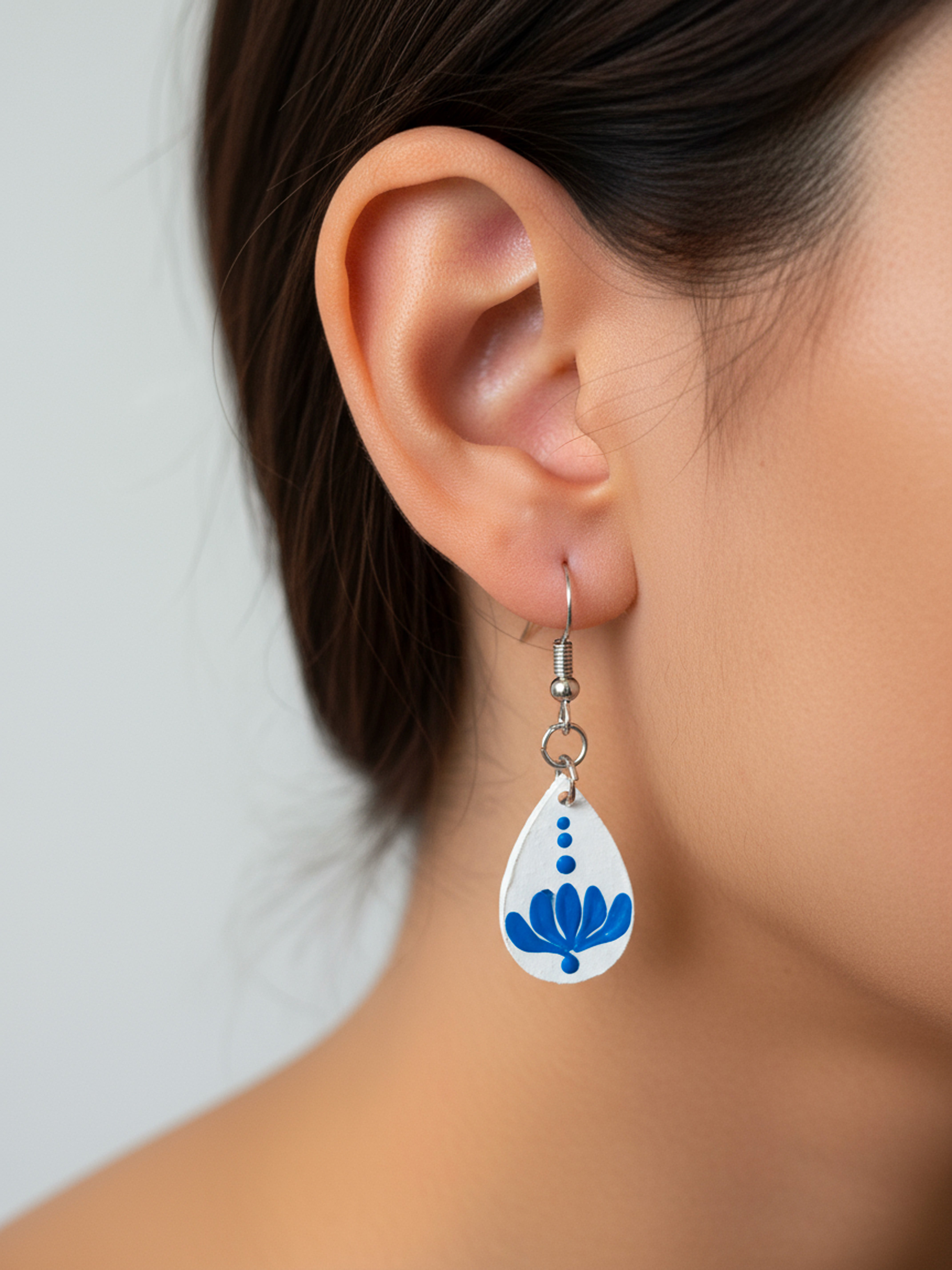 Delicate, elegant, and full of mindful charm these Blue Blossom Teardrop Earrings are a celebration of simplicity in art. Hand-painted on a lightweight MDF base, each earring features a serene floral mandala motif in blue against a crisp white backdrop, symbolizing calmness, clarity, and creativity.