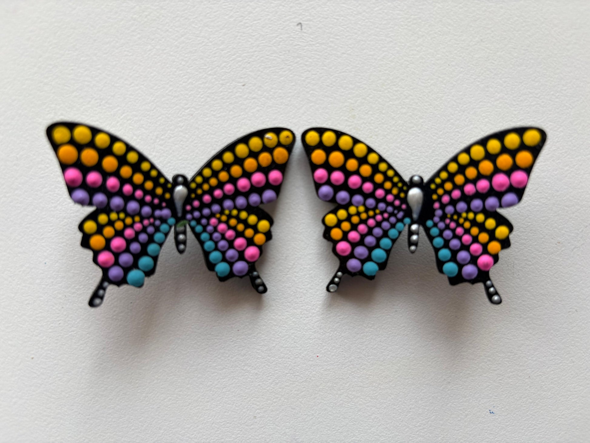 Make a graceful statement with these hand-painted butterfly earrings, inspired by the beauty of transformation and nature’s palette. Each pair is intricately detailed using dot mandala art and brushstroke techniques in vibrant shades of lavender, green, yellow, pink, and black, finished with a glossy shine and crystal embellishments for that extra sparkle.