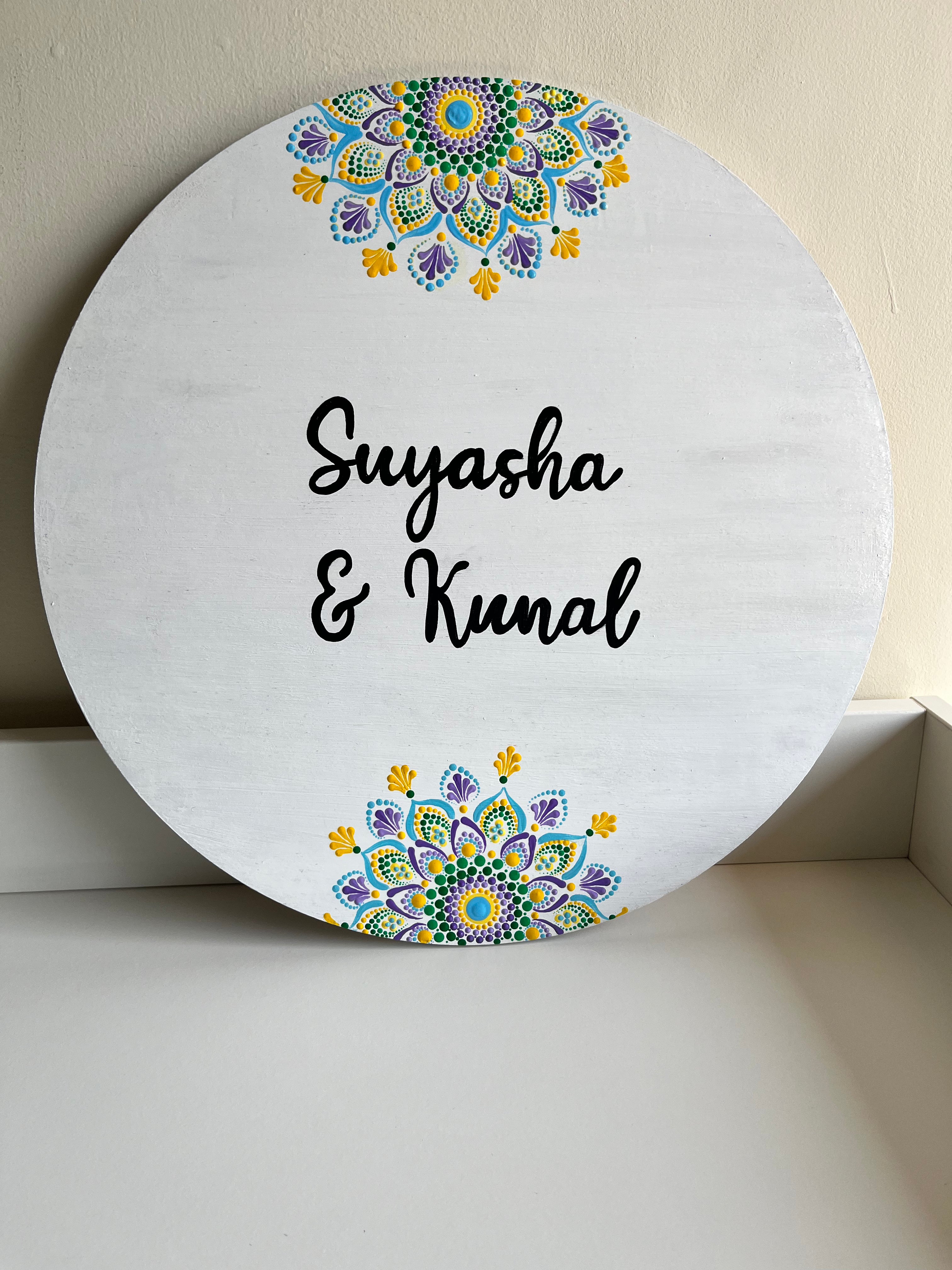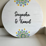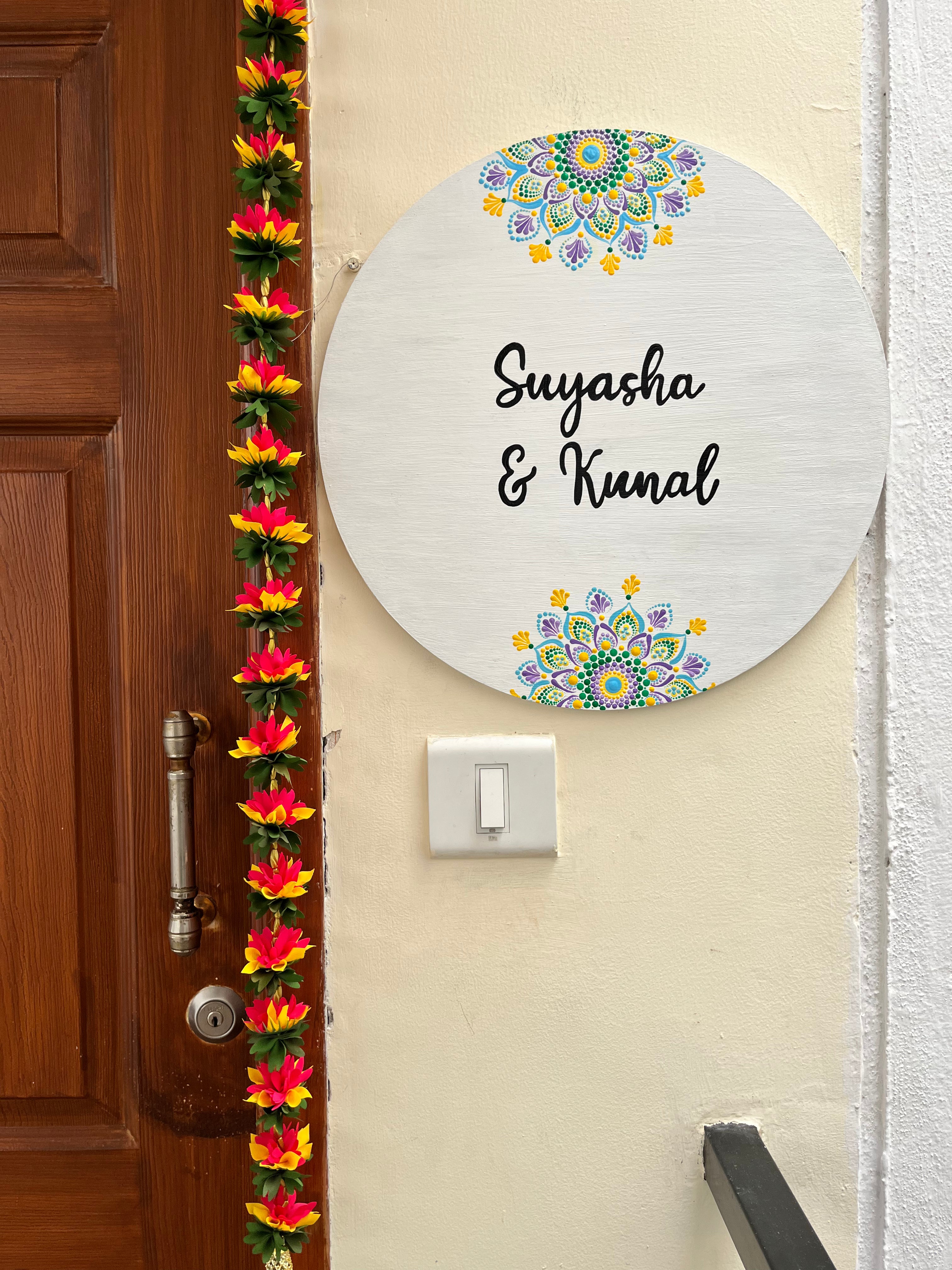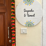 Crafted on a high-quality MDF base, this 16-inch nameplate features delicate dot mandala patterns in soothing pastel tones arranged in graceful floral motifs. The harmonious combination of colors on a deep background creates a balanced and eye-catching design, perfectly framing your family name or house number. Each piece is varnish-sealed for water resistance and long-lasting vibrance, making it both a functional nameplate and a piece of wall art.