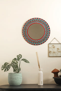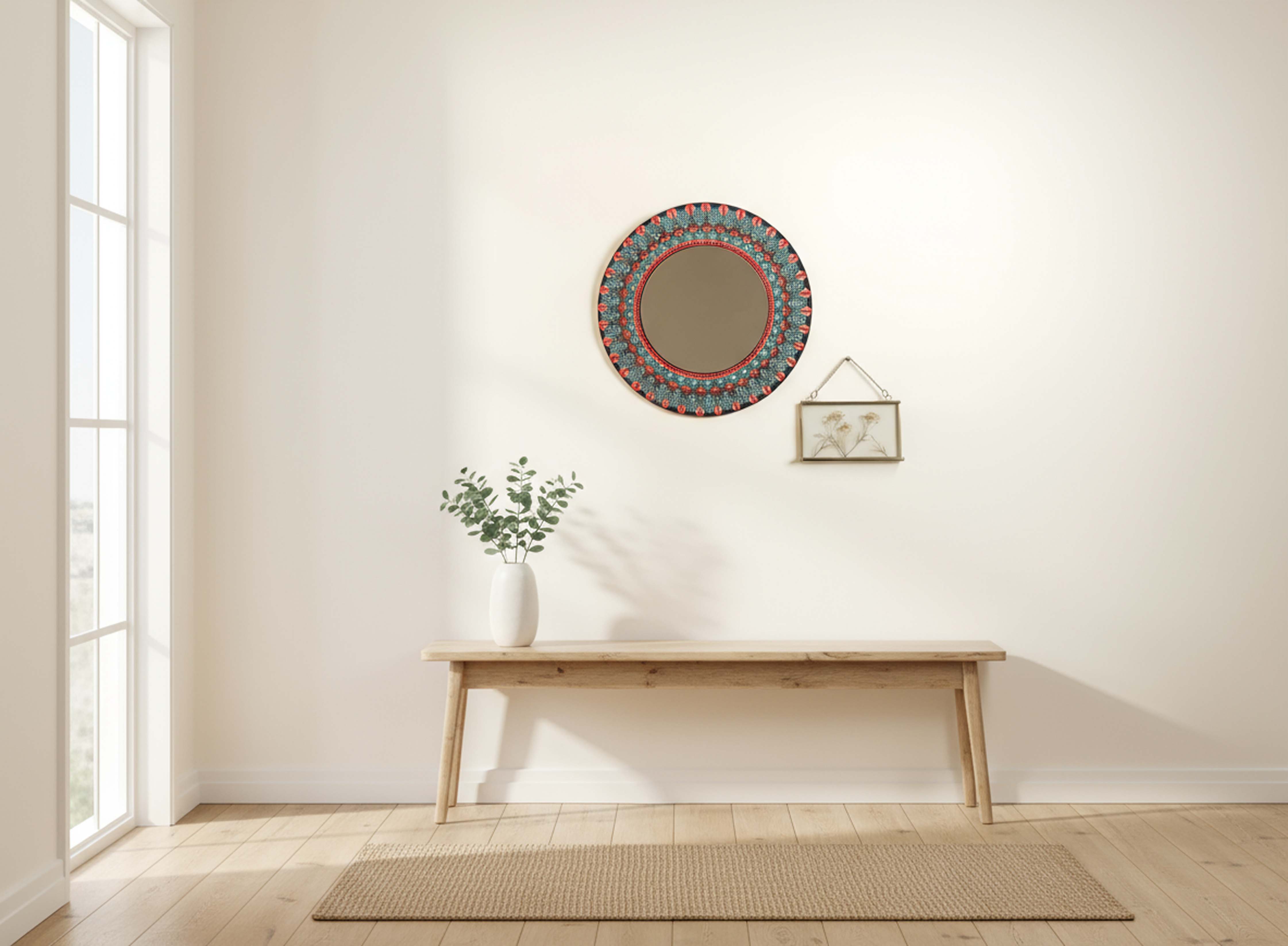 Introducing the Bloom Mirror, a vibrant handpainted mandala wall mirror designed to bring color, elegance, and artistic charm into your space. The circular frame is adorned with intricate dot mandala patterns in shades of teal blue, and soft pink — creating a radiant, blooming effect that beautifully surrounds the reflective center.