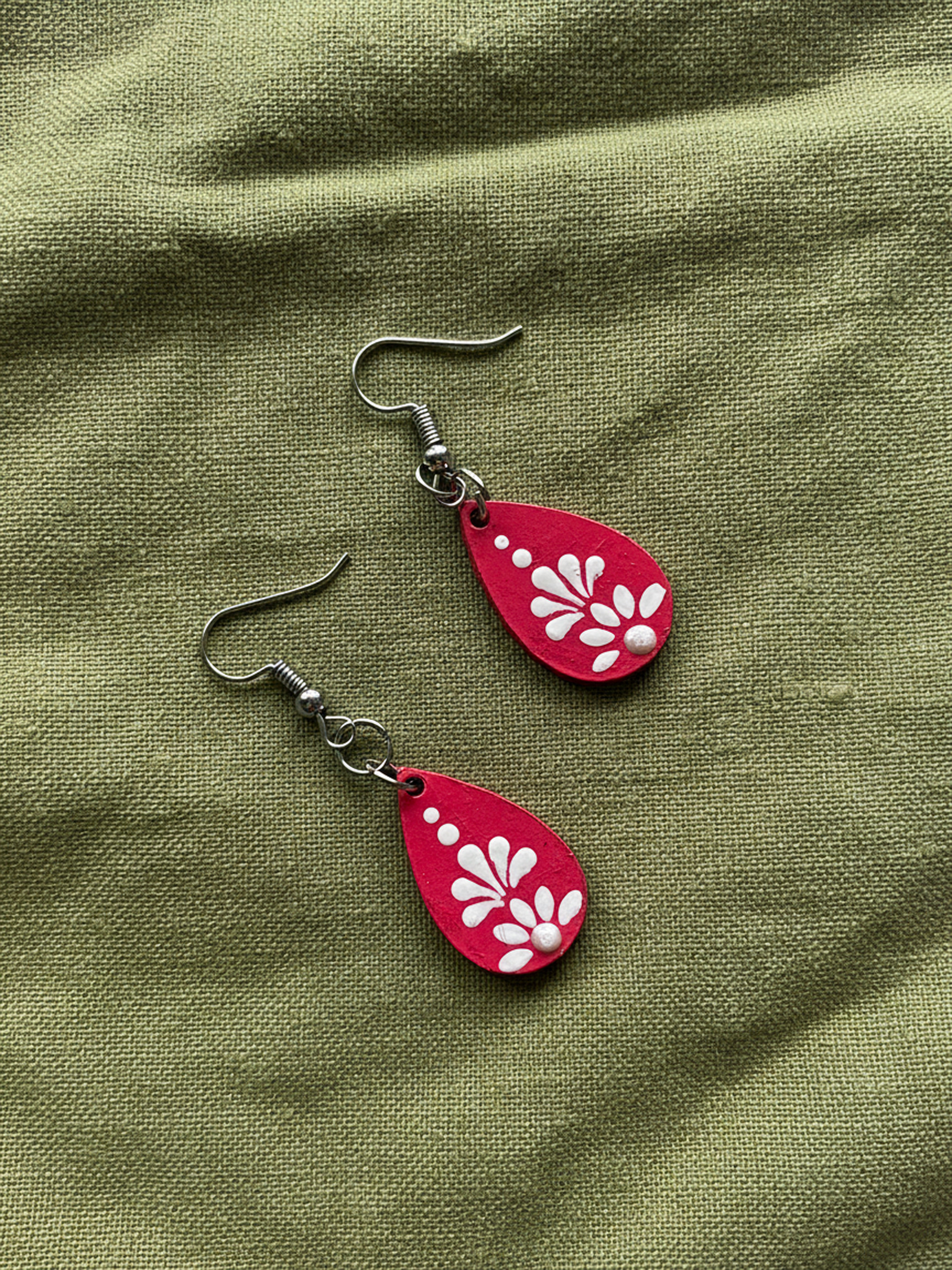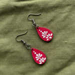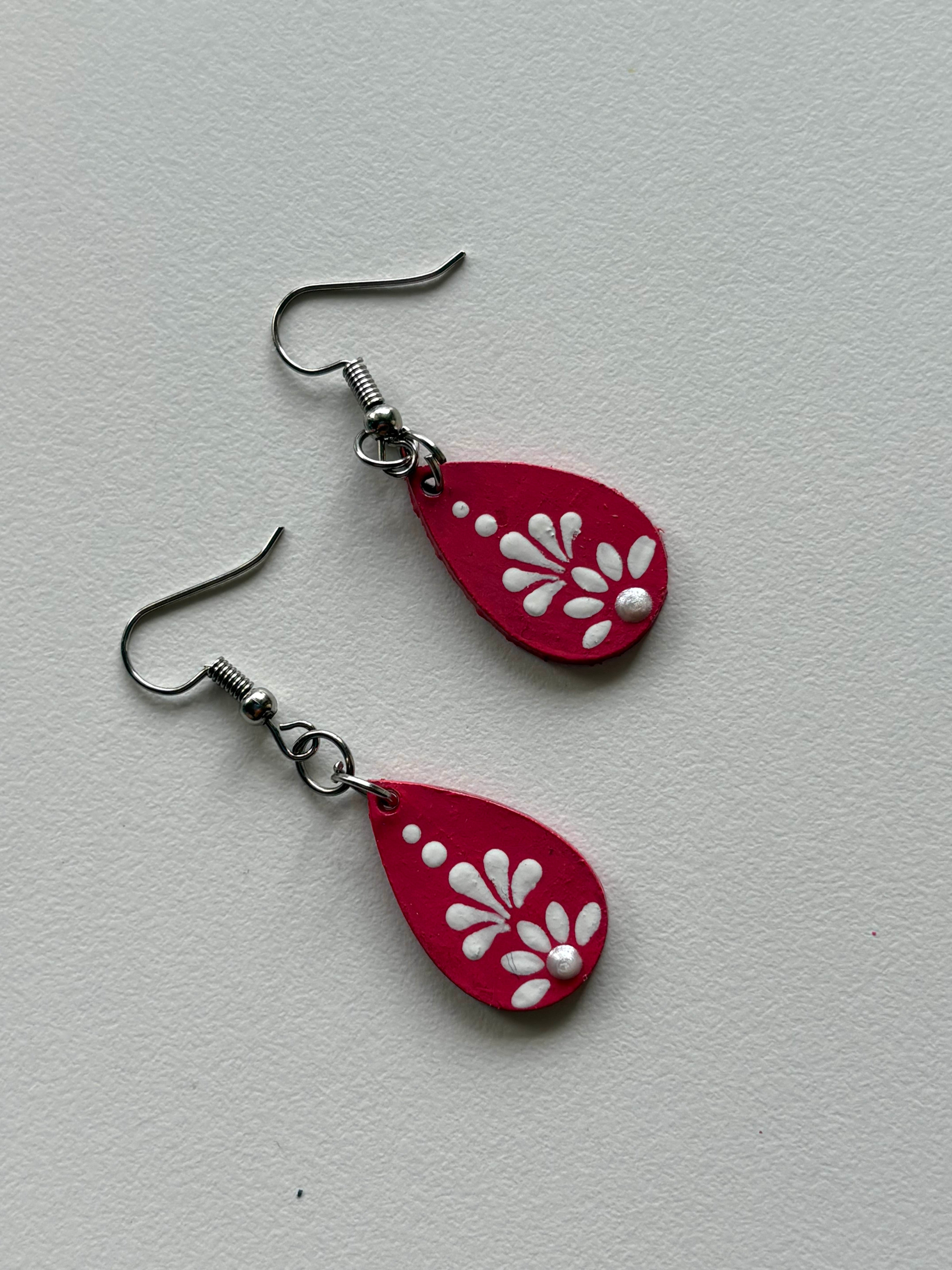 Add a pop of color and soul to your look with these Pink Petal Drop Earrings by Nartika Creatives. Handcrafted with love, each earring features delicate white petal motifs and dots on a rich red base symbolizing strength, confidence, and creativity.