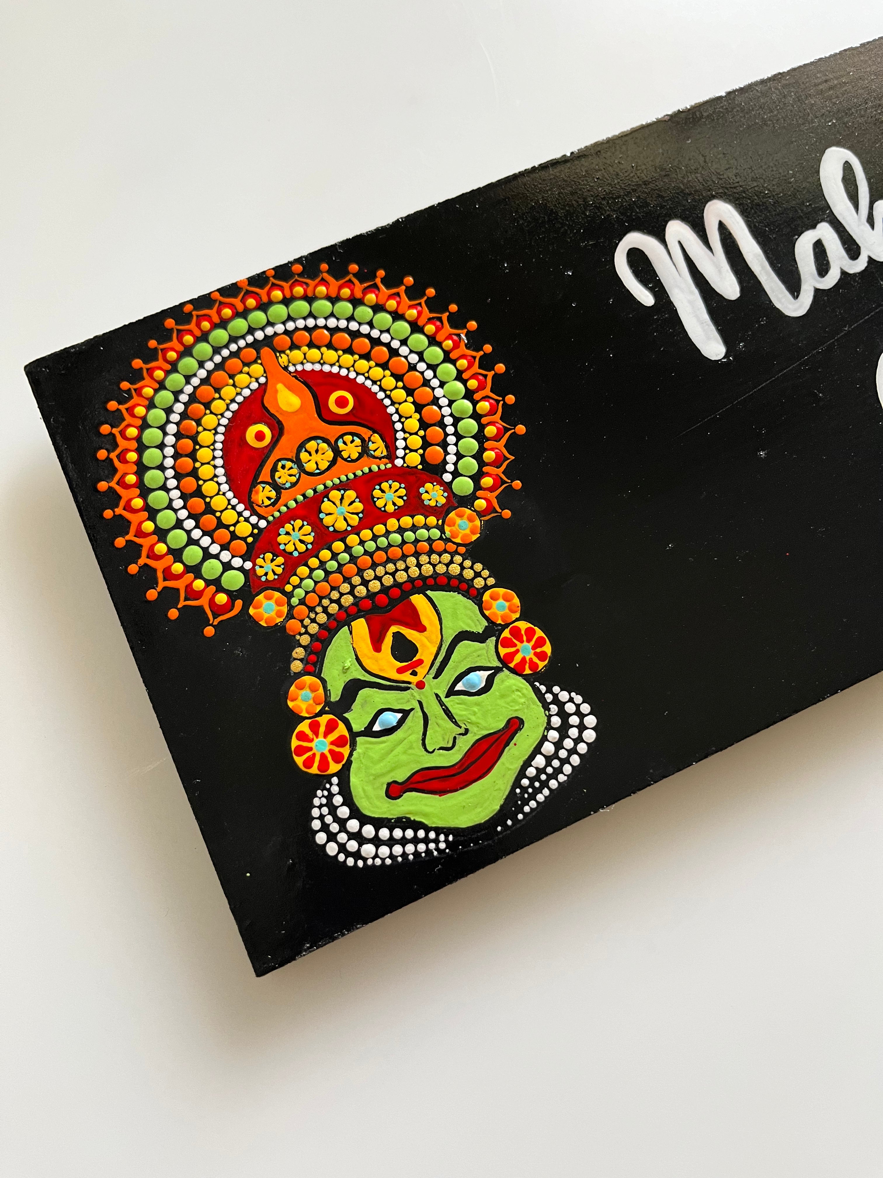 Bring home the cultural charm of Kerala with this hand-painted Kathakali face nameplate. Measuring 12 x 30 cm, this compact yet vibrant piece is crafted on premium MDF and adorned with intricate dot mandala details in traditional shades of green, red, orange, and gold.