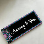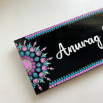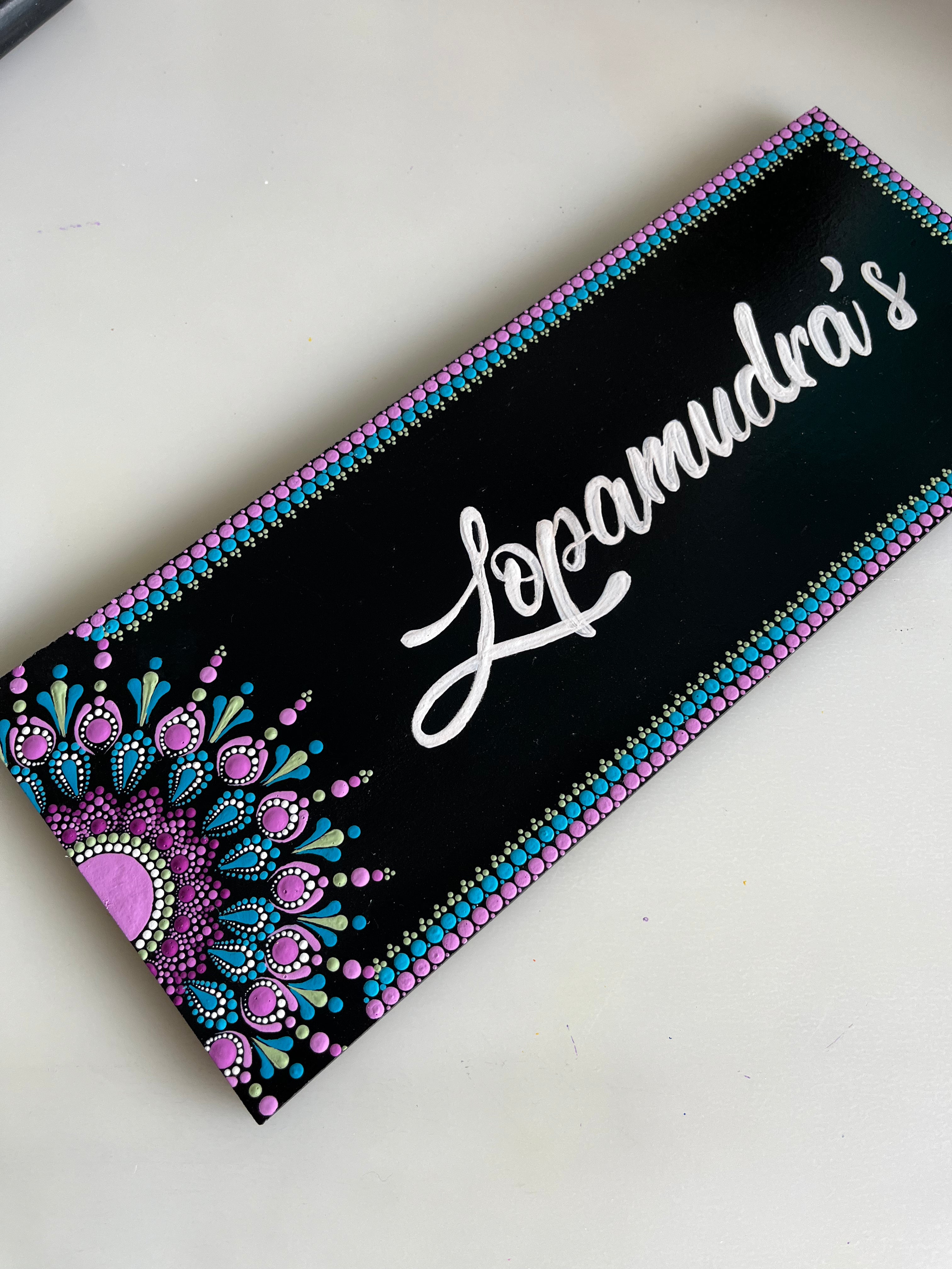 A vibrant yet compact nameplate that blends the beauty of dot mandala art with a sleek rectangular design.