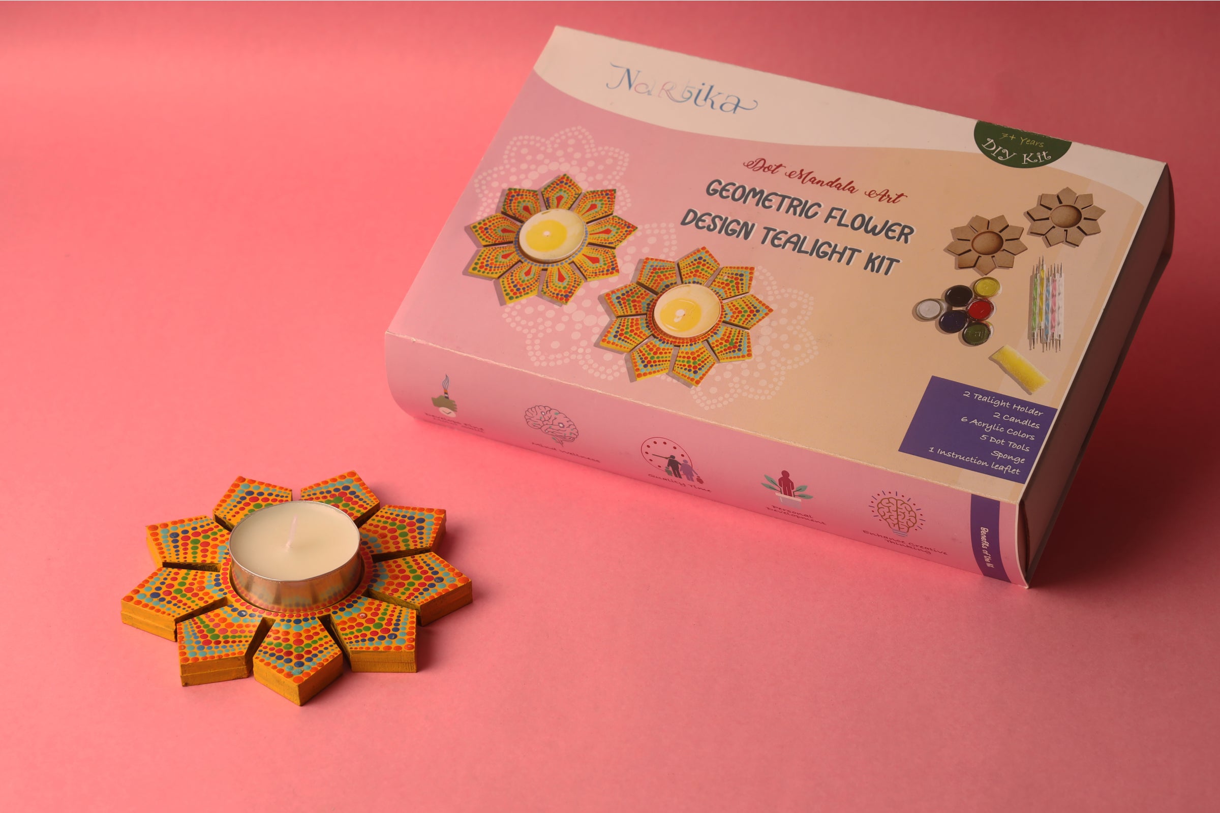 Become a master in dot art techniques and create your own unique tealight holder with our all-inclusive DIY kit. The kit includes MDF bases, colors, and more, making it perfect for beginners. Plus, you can reuse the tools for endless creations. This fun and therapeutic activity is suitable for all ages above 10 years.