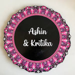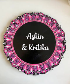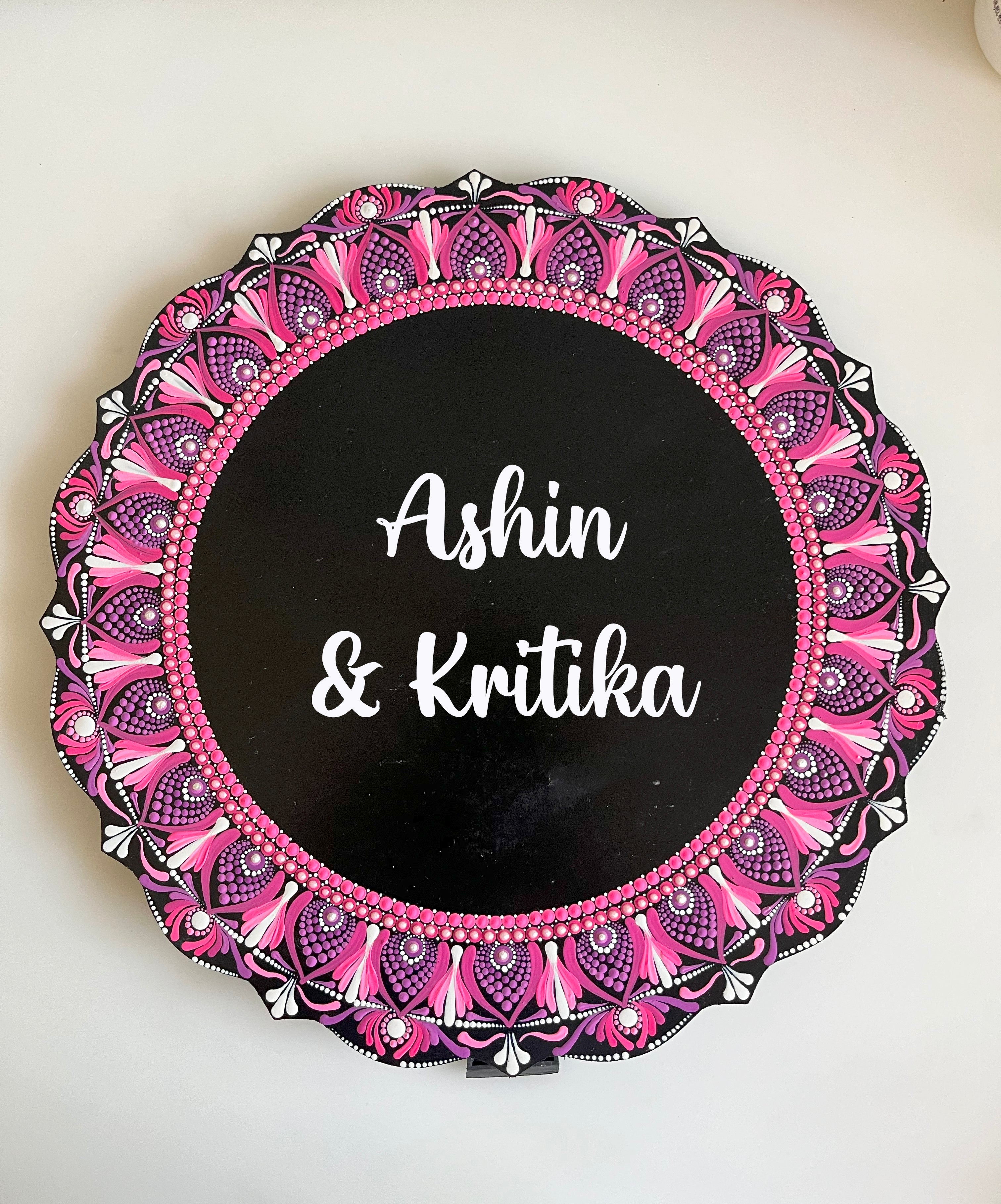Hand-painted on a high-quality MDF base, this 12-inch nameplate showcases intricate dot mandala patterns in shades of pink, white, beautifully arranged in petal-like motifs that radiate from the center. The curved edge adds a refined, ornamental look, perfectly framing your names and making this piece as artistic as it is personal. Each nameplate is varnish-sealed for water resistance and long-lasting beauty.
