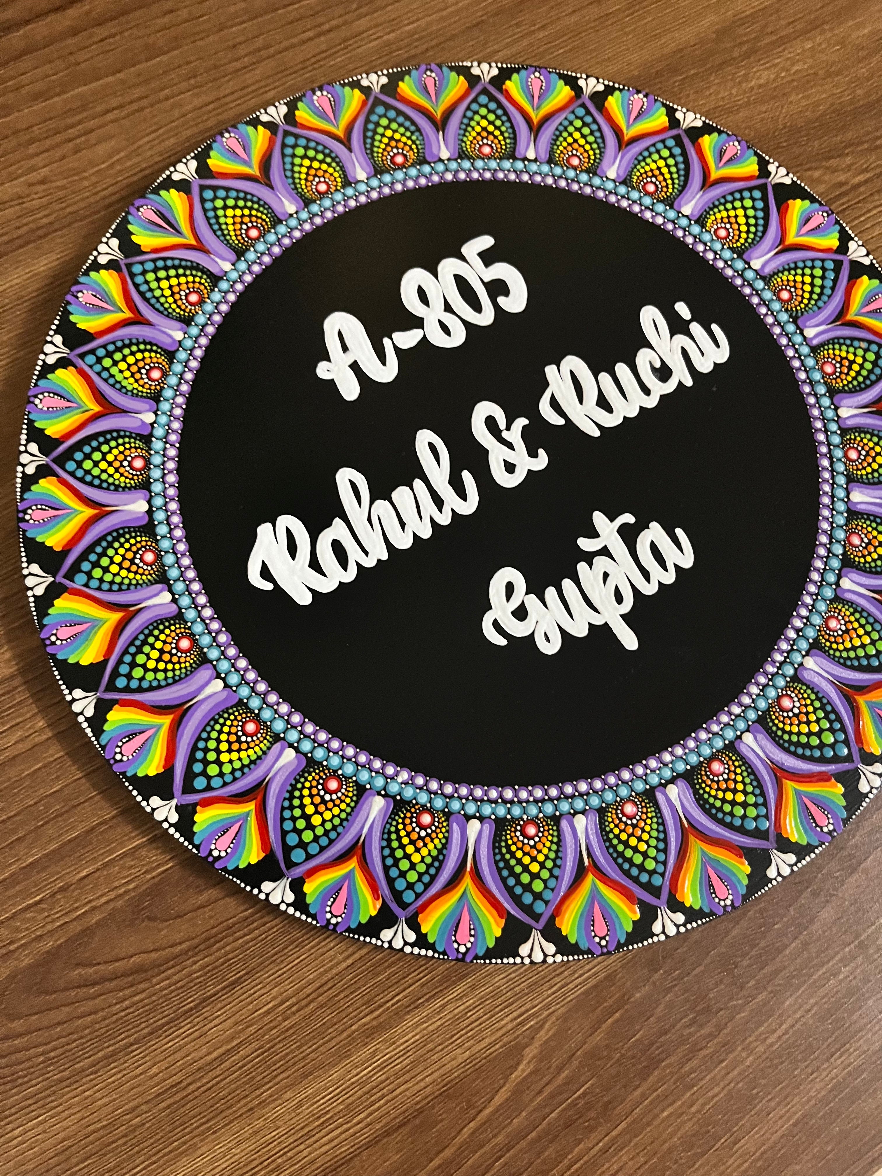 Bring a burst of color and positivity to your home entrance with our Rainbow Dot Mandala Round Nameplate – a perfect blend of hand-painted artistry and personalized charm.