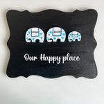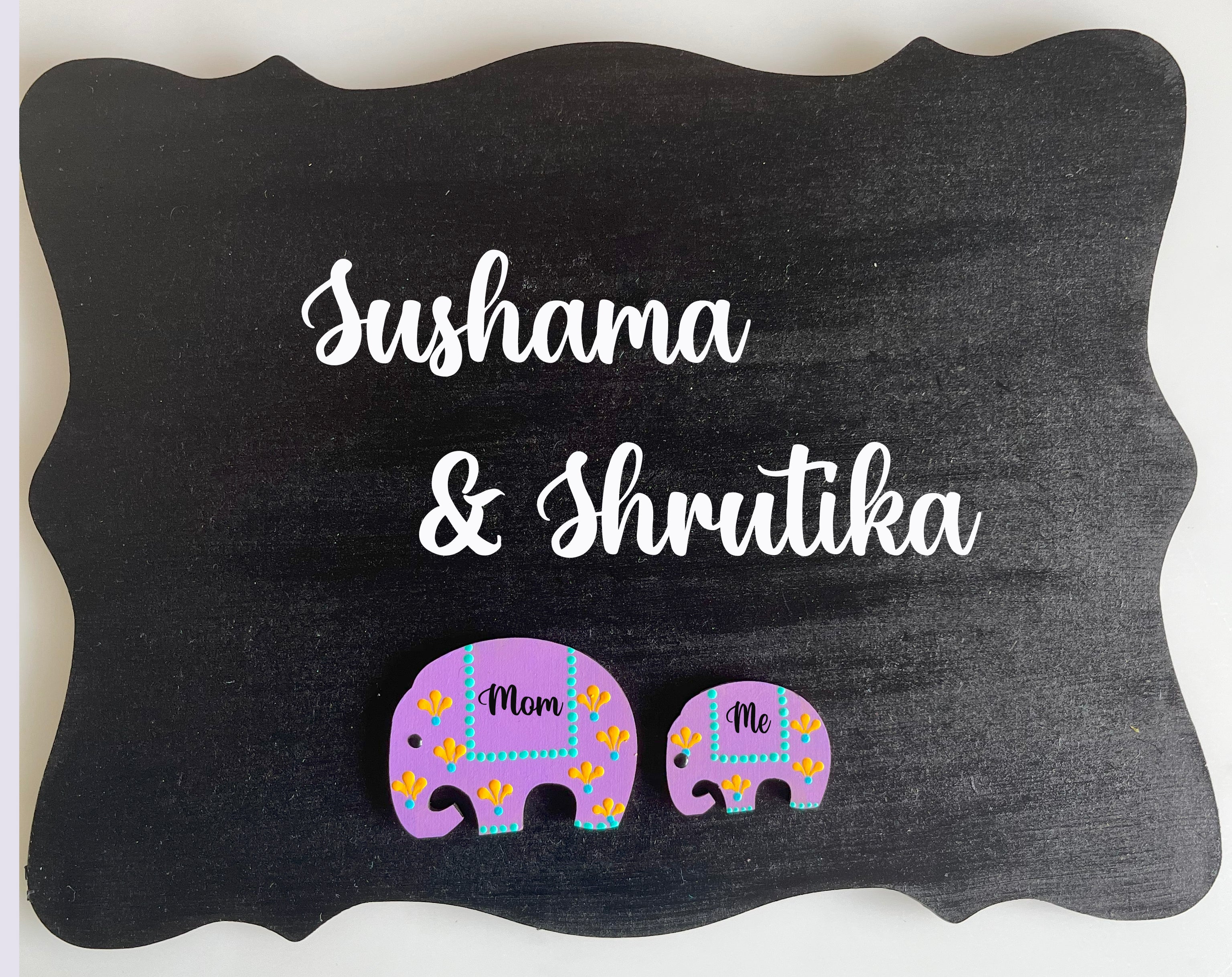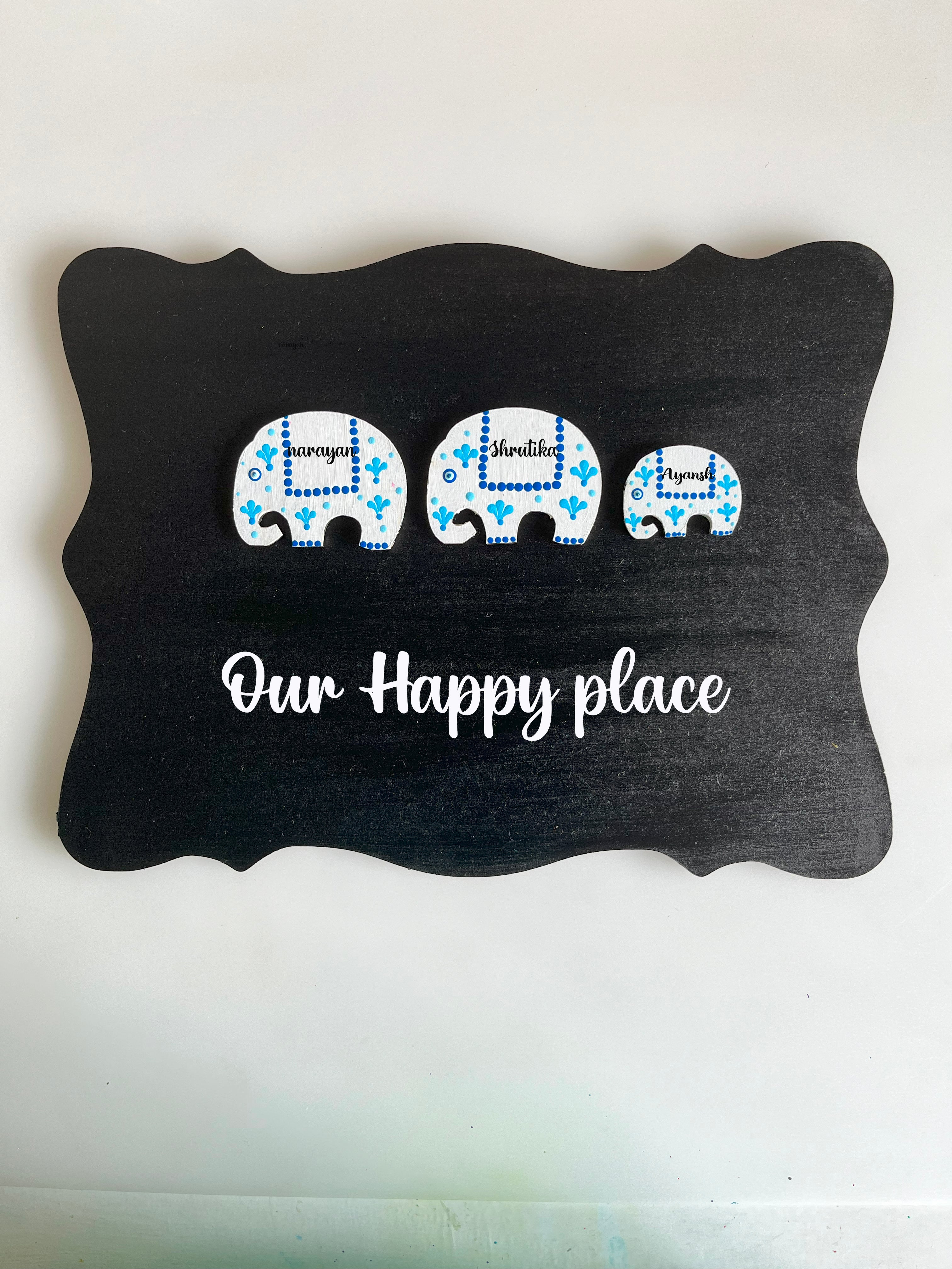 Set on a curved-edge rectangular MDF base, this 25x30 cm nameplate features a playful trio of white elephants adorned with intricate blue dot art patterns. Each elephant carries a personalized name, making it as meaningful as it is beautiful. Finished with a smooth varnish for water resistance, it’s perfect for anyone who loves elephants, vibrant design, and unique handcrafted décor.