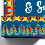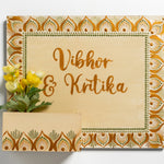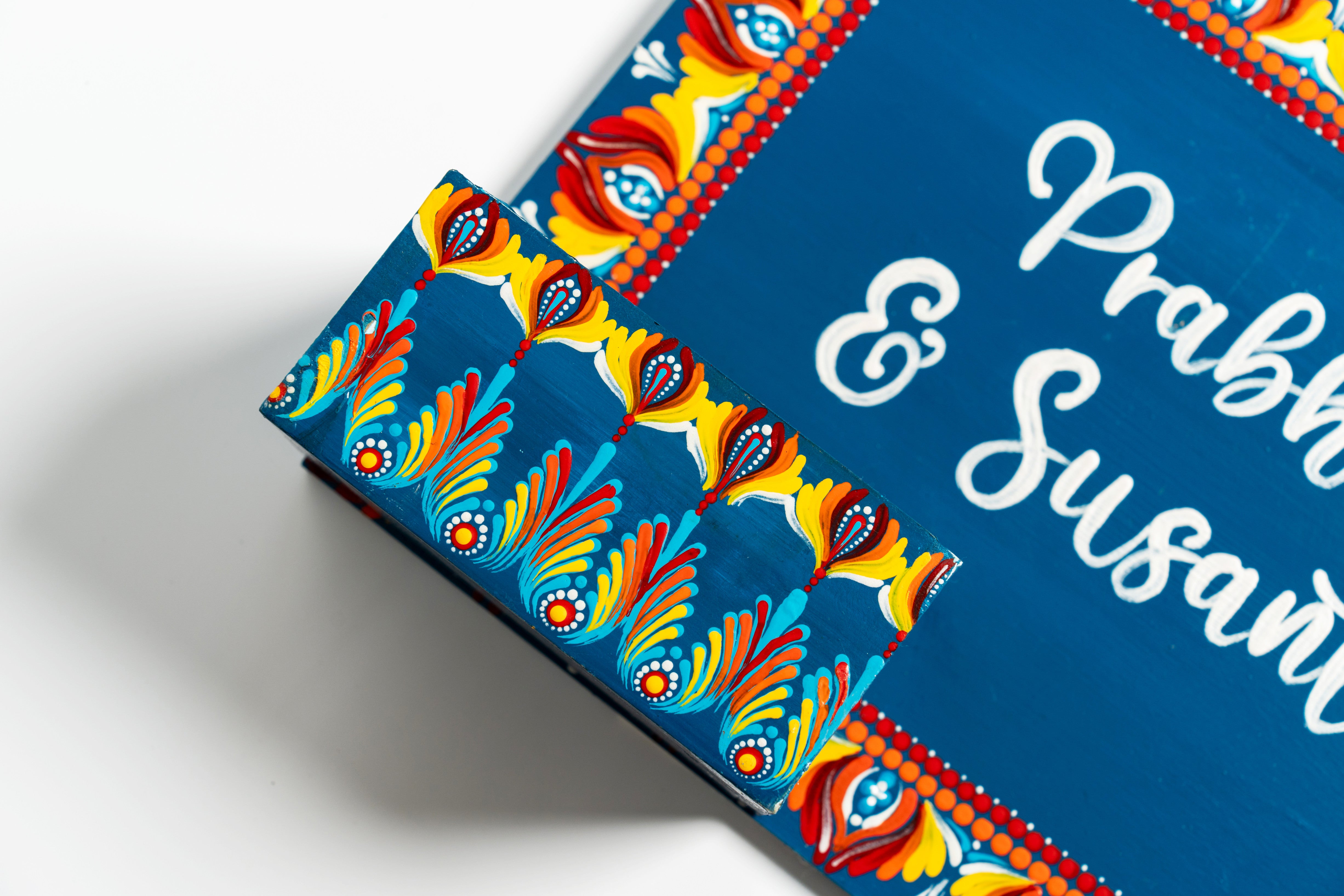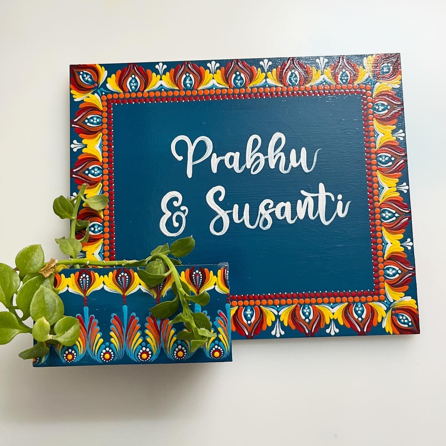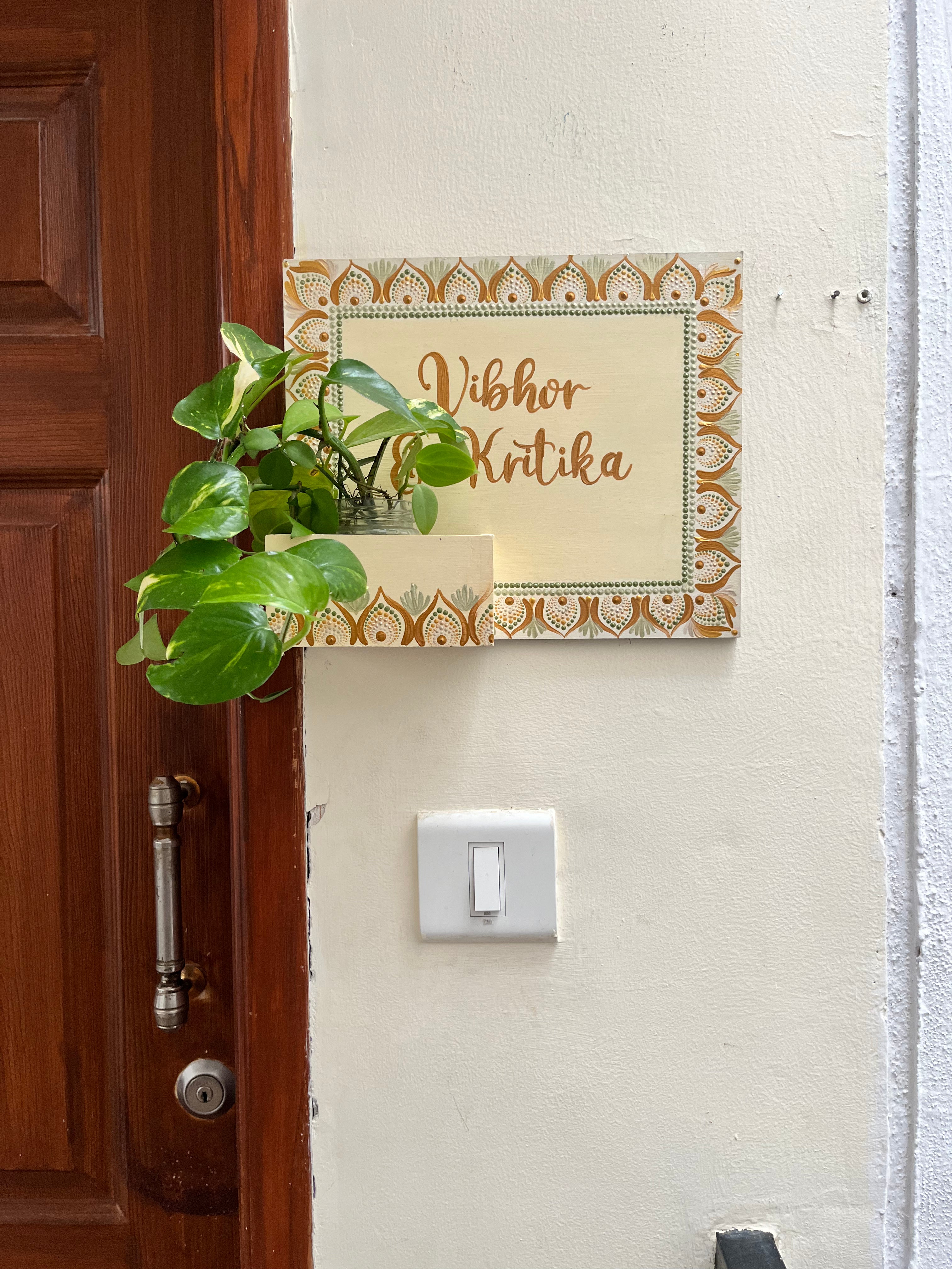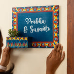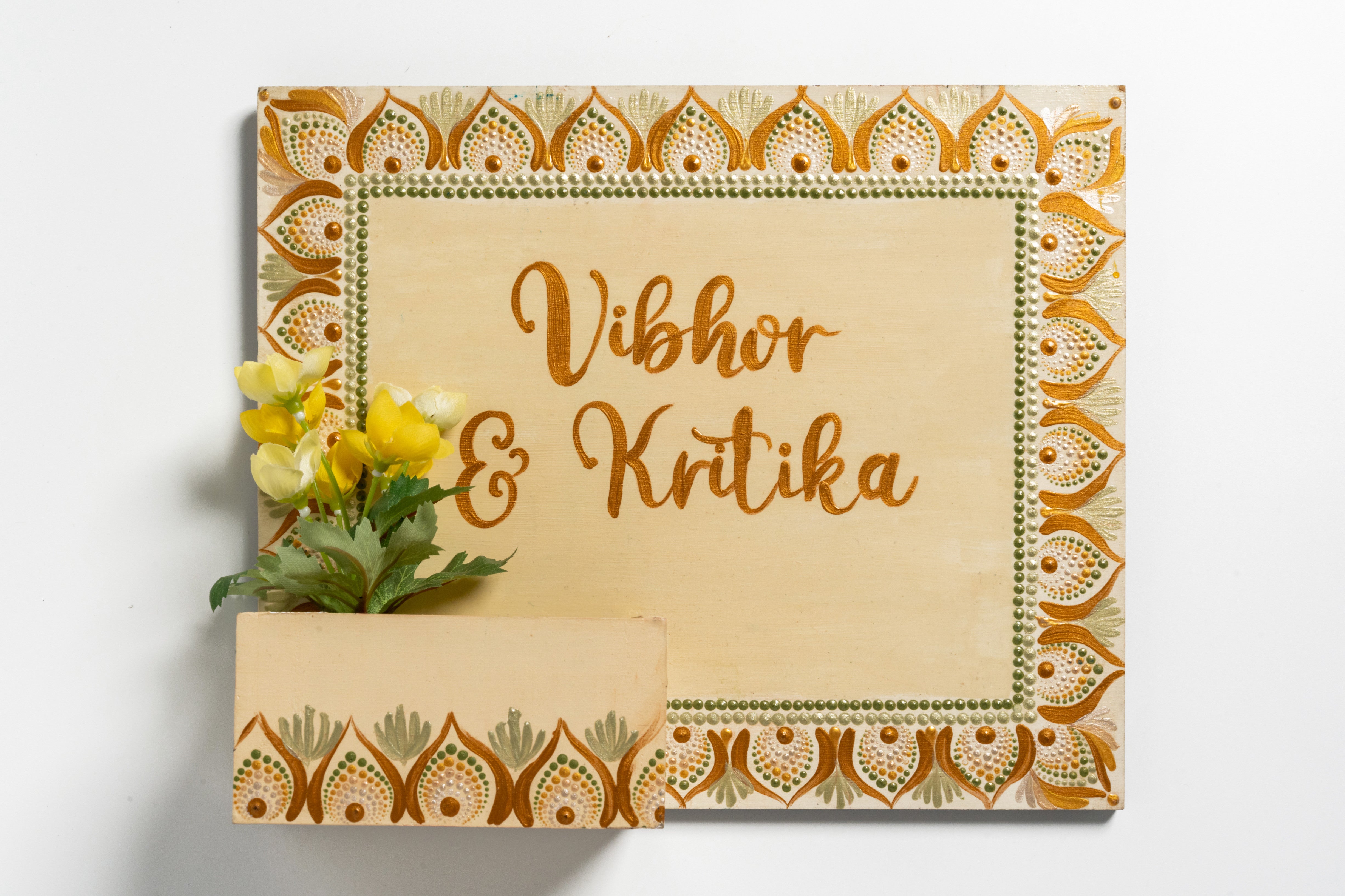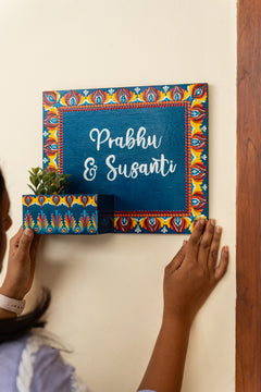 Crafted on a sturdy MDF rectangular board (25x30 cm) with an attached mini planter box (4"x2"), this nameplate is perfect for displaying small plants, succulents, or faux blooms alongside your personalized name. The rich color palette, intricate dot mandala floral borders, and varnish-sealed finish make it a vibrant and durable statement for your home entrance.