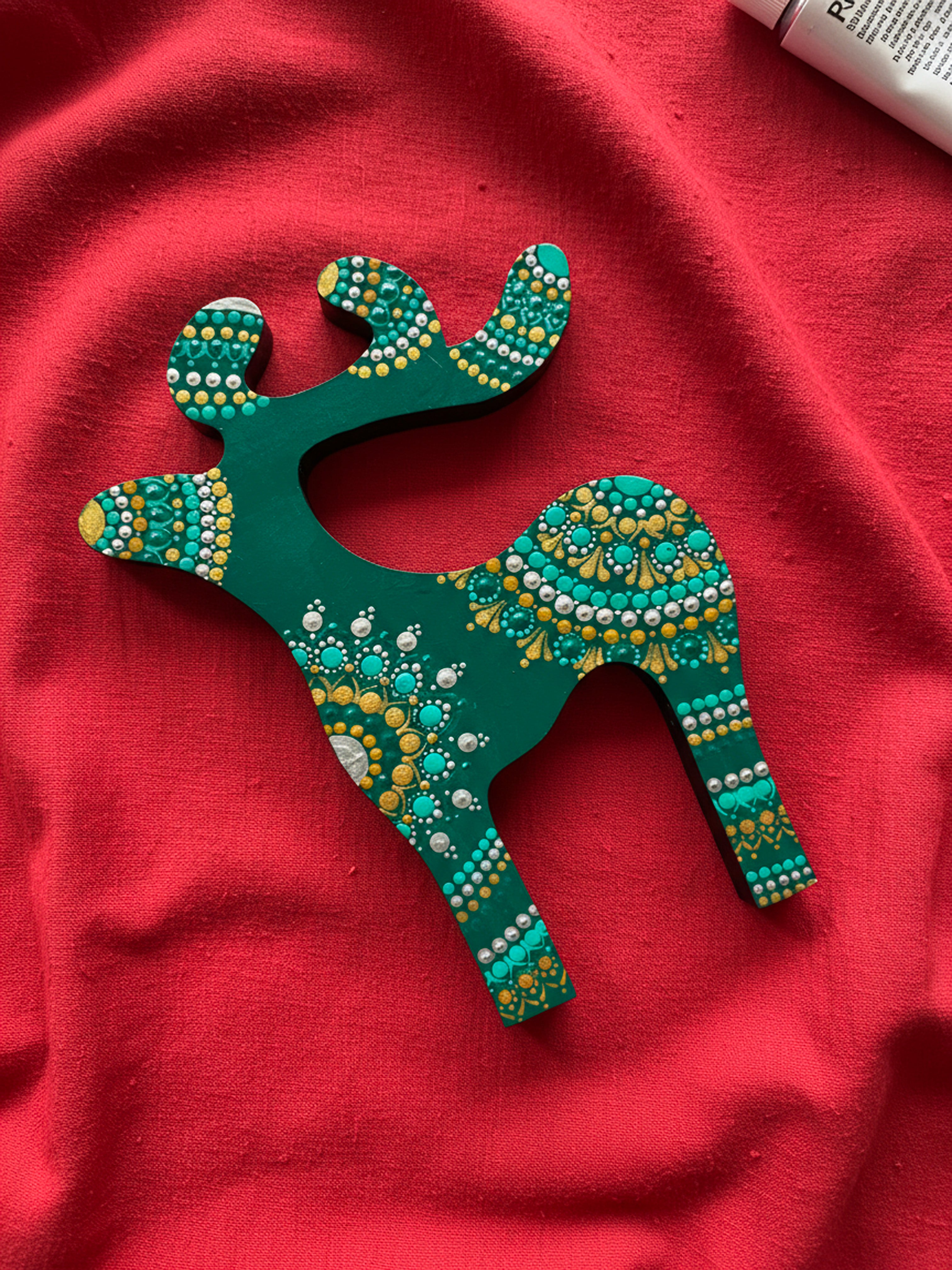 Meticulously crafted on a reindeer silhouette, this piece features intricate dot mandala patterns in soothing emerald tones, highlighted with touches of gold, silver, or white (adjust based on your artwork). Each dot is placed with precision, symbolizing harmony, gratitude, and the joy of togetherness during the holiday season.