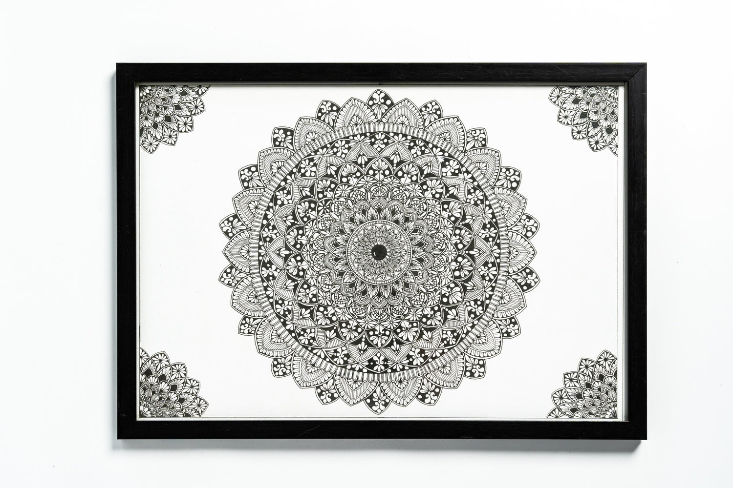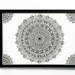 Rendered in monochrome, the fine detailing creates stunning contrast, making this piece a timeless statement for collectors, meditation spaces, and interiors that appreciate mindful, detailed art.
