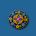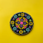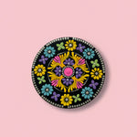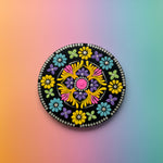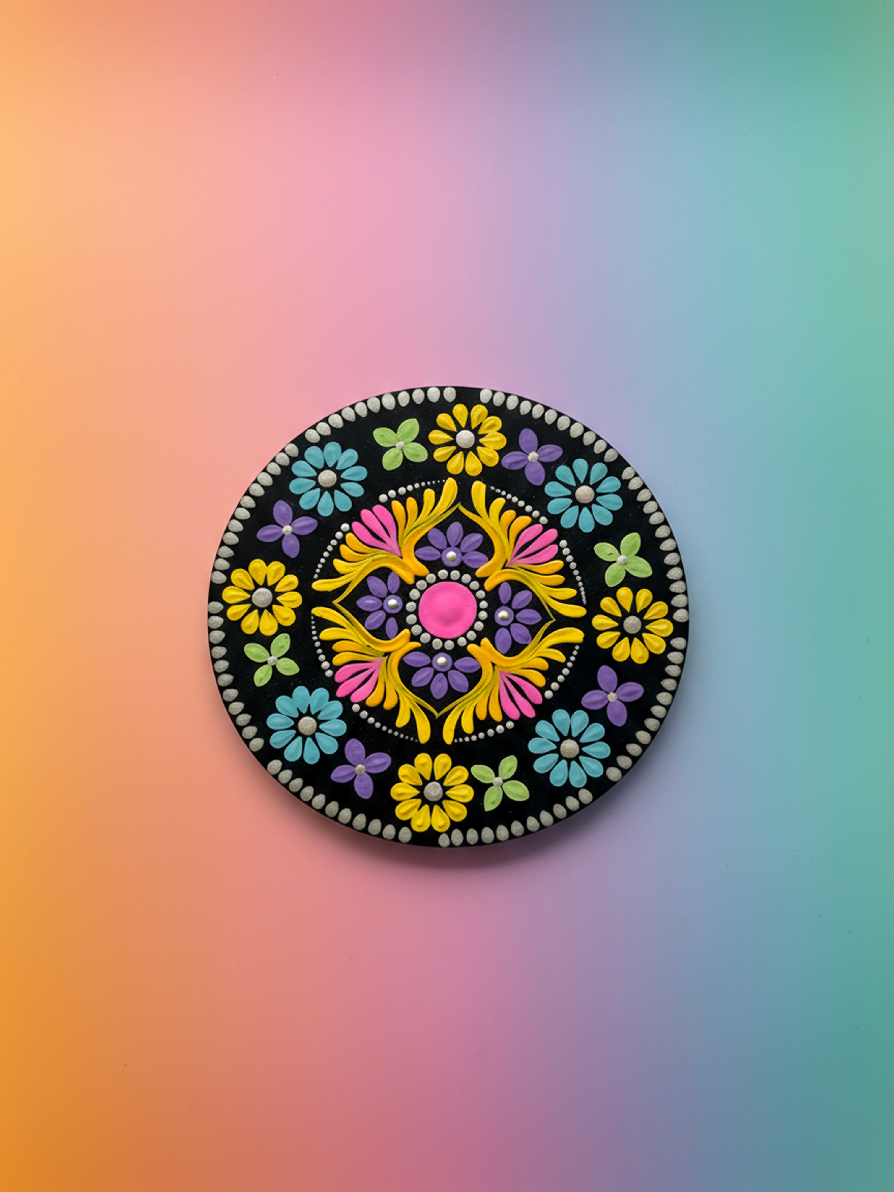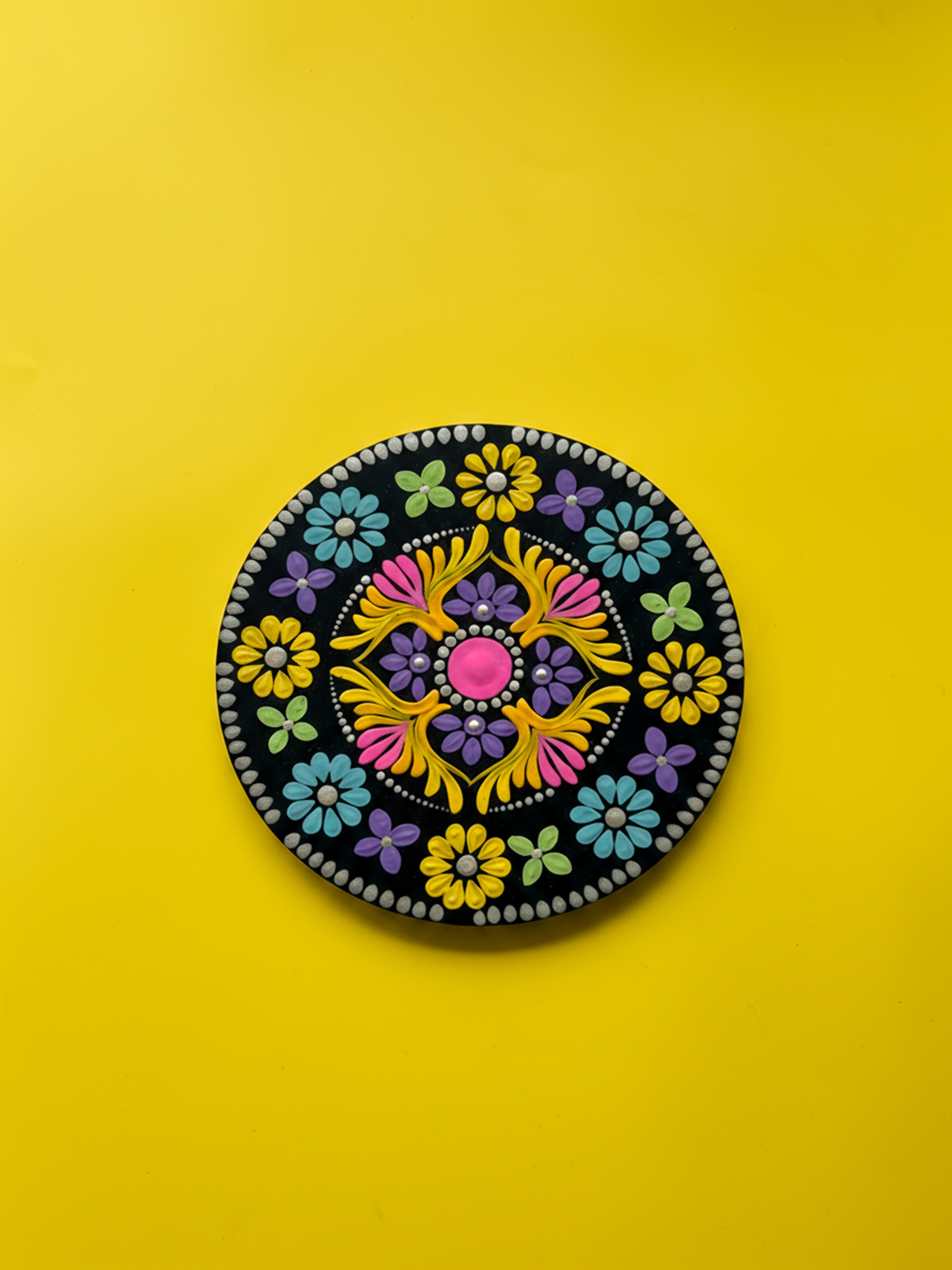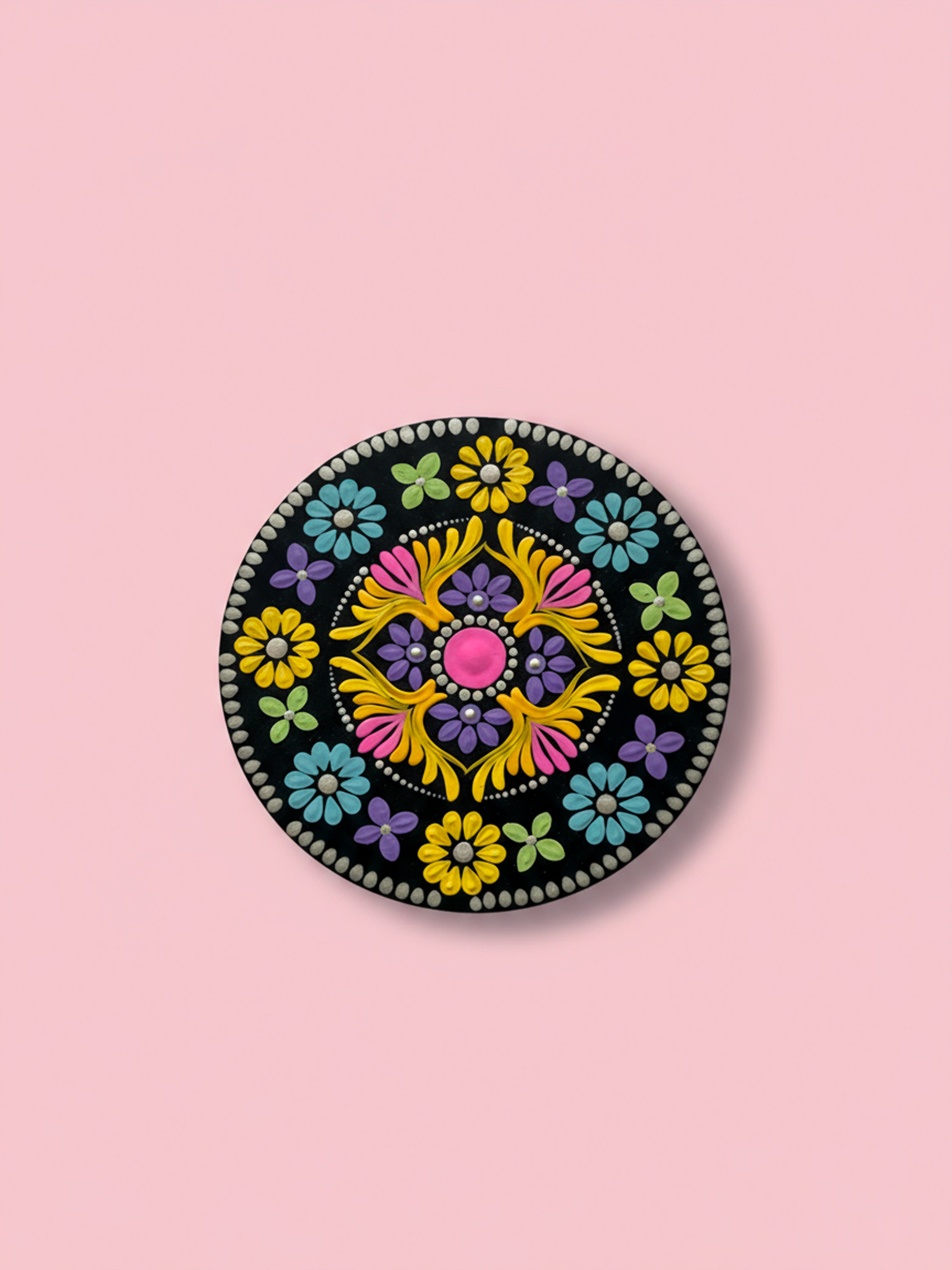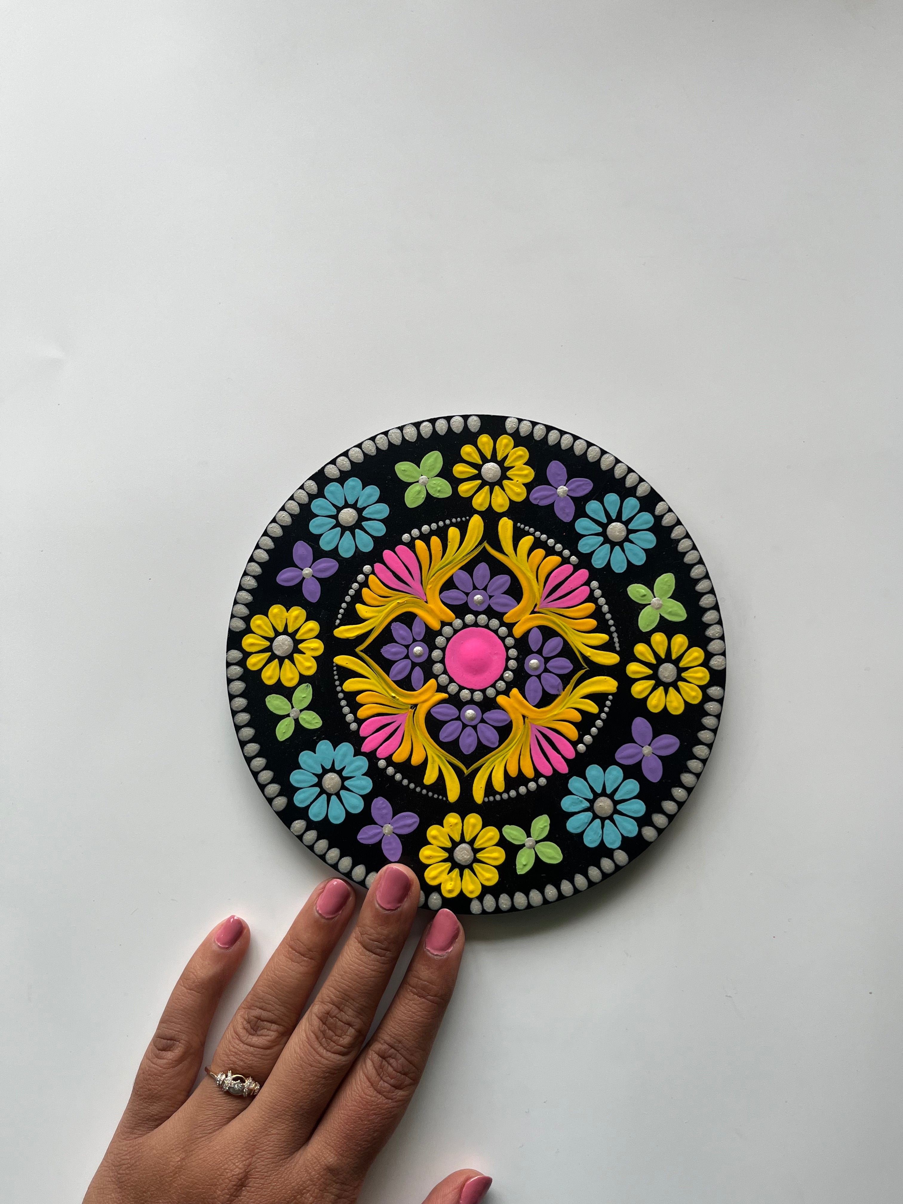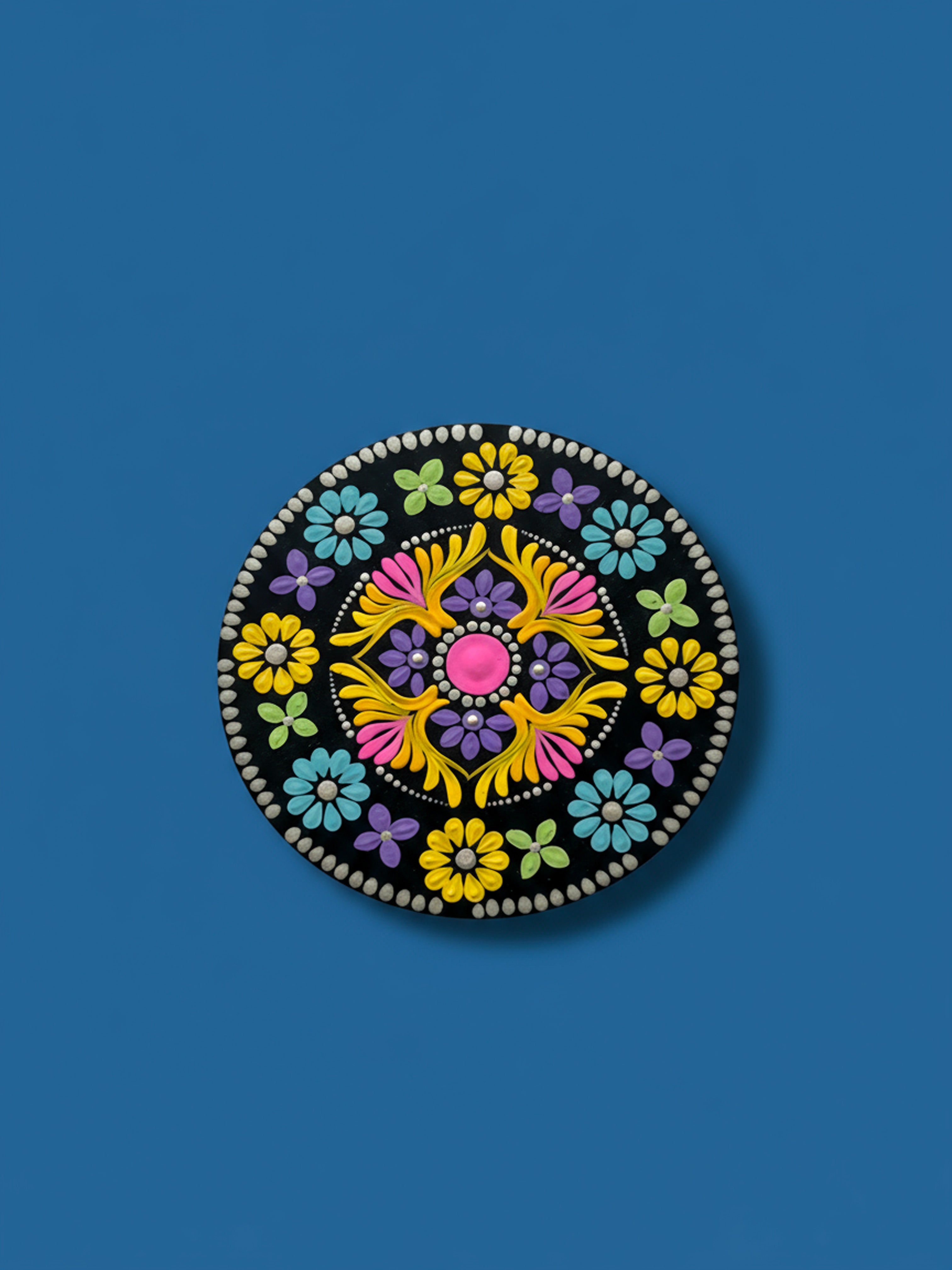 This exquisite hand-painted Mandala Dot Art brings together vibrant floral motifs in cheerful tones of yellow, pink, purple, green, and blue. Created on a black base, the design radiates positivity and balance, with a detailed center surrounded by blooming flowers and delicate dot patterns.