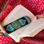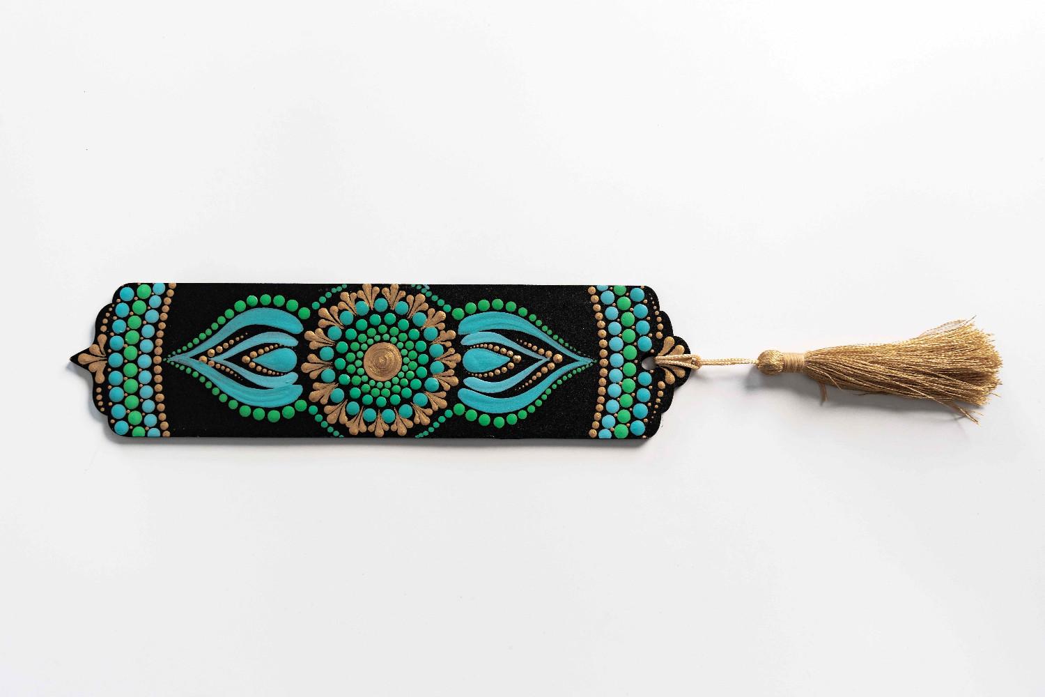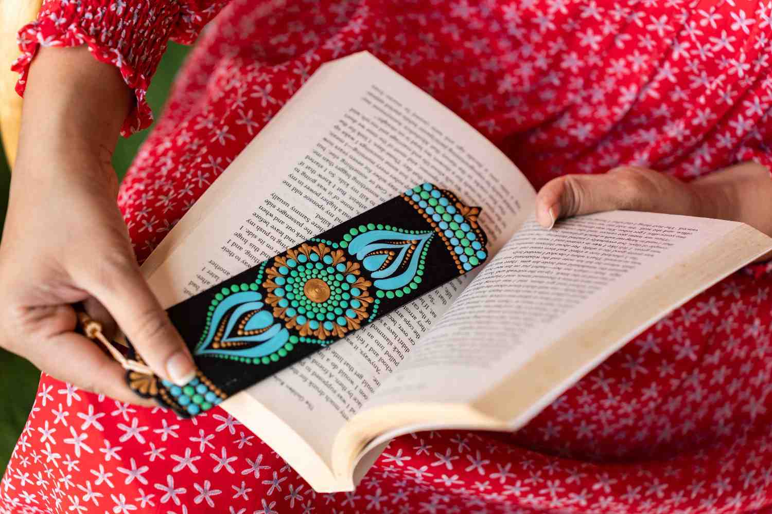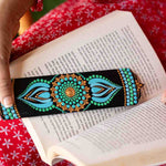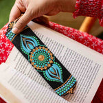 Add a hint of elegance to your reading moments with this Mandala Dot Art Bookmark by Nartika Creatives. Handcrafted on a sleek black base, it features intricate mandala blooms in shades of turquoise, teal, and antique gold, symbolizing calmness and clarity. Finished with a golden tassel for a touch of sophistication, this bookmark is more than just a page holder it’s a reminder to pause, breathe, and find beauty in every chapter.