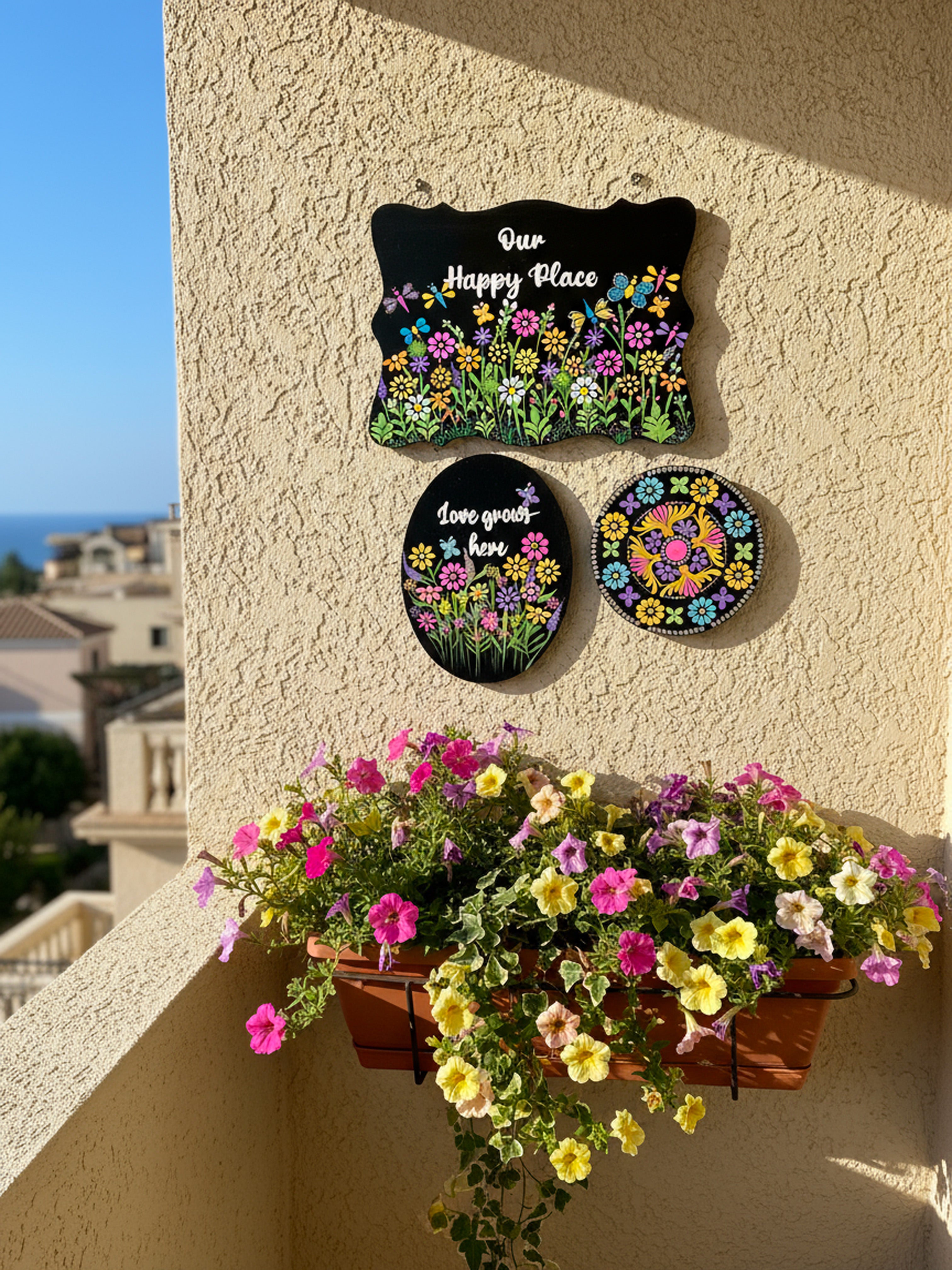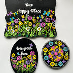 Our Happy Place Board – A joyful garden scene with colorful flowers and butterflies, symbolizing positivity and togetherness.