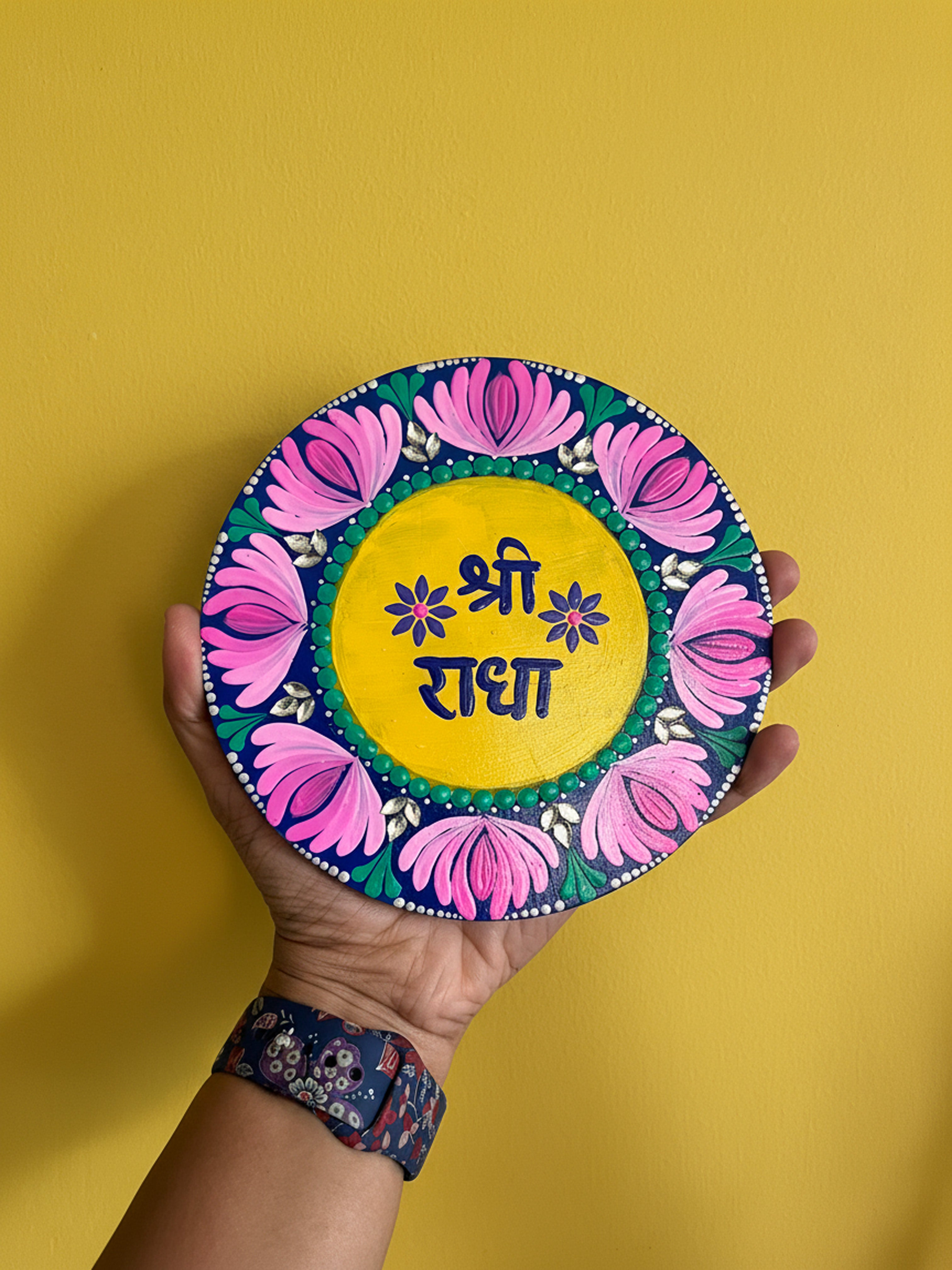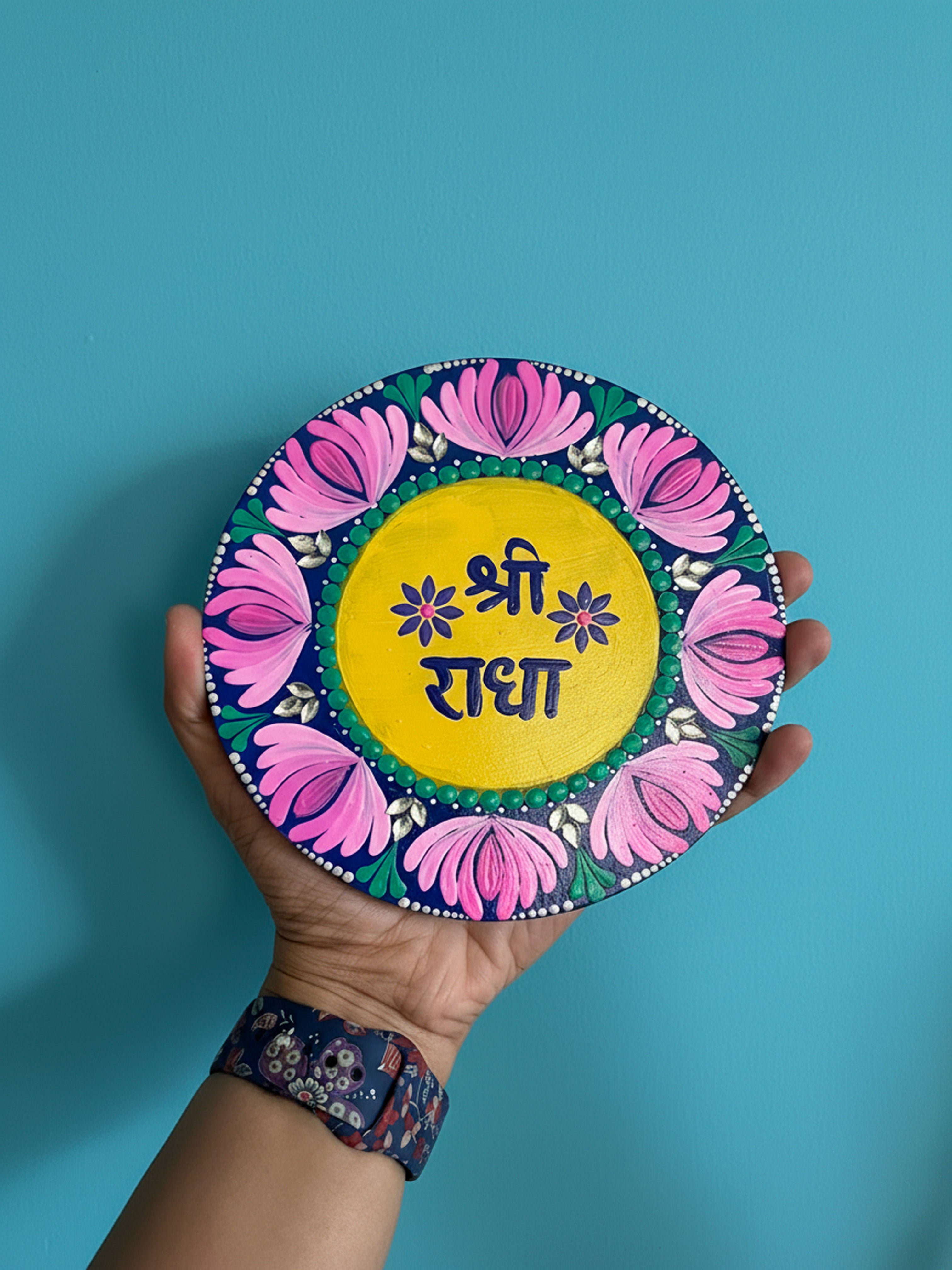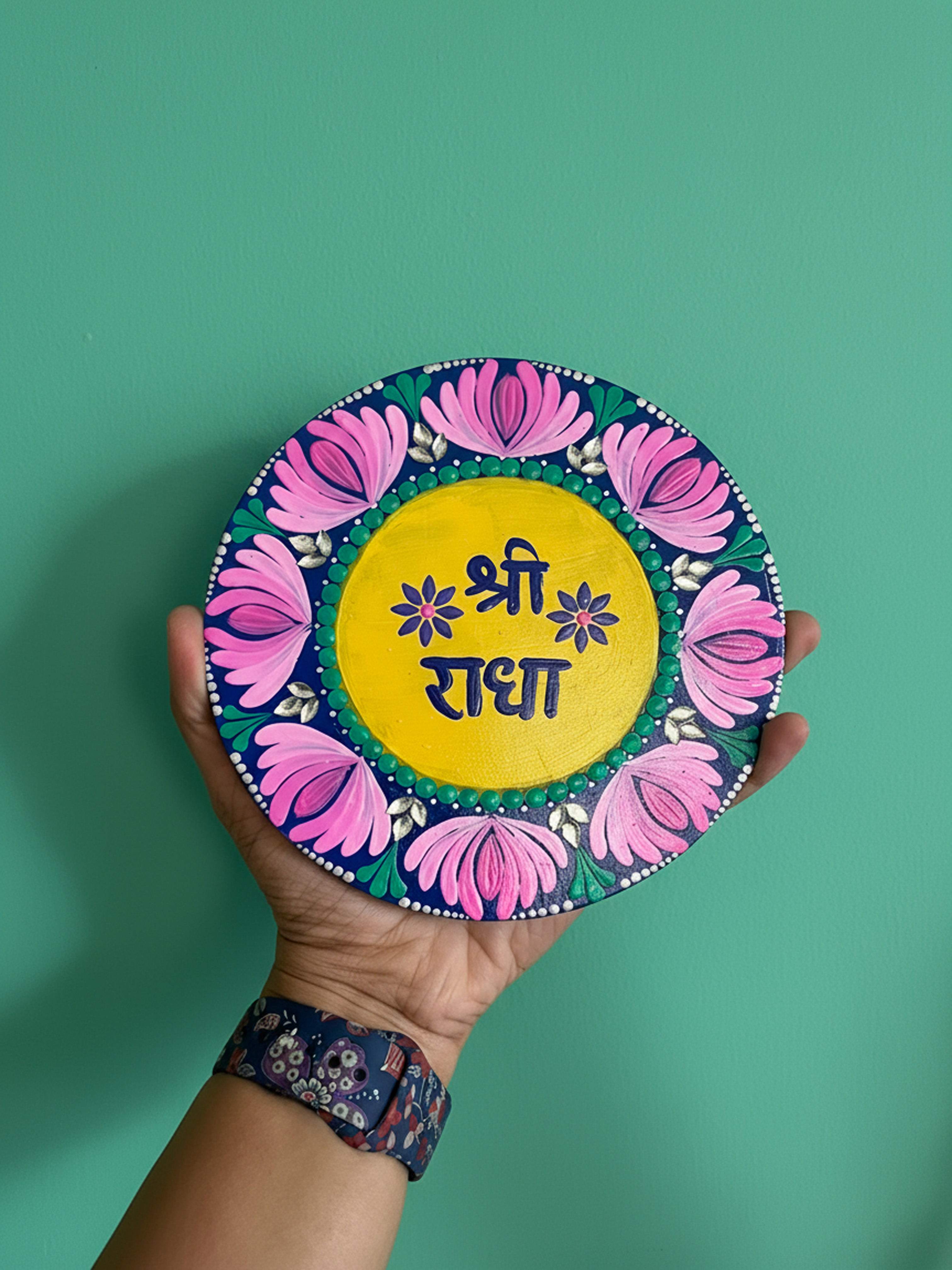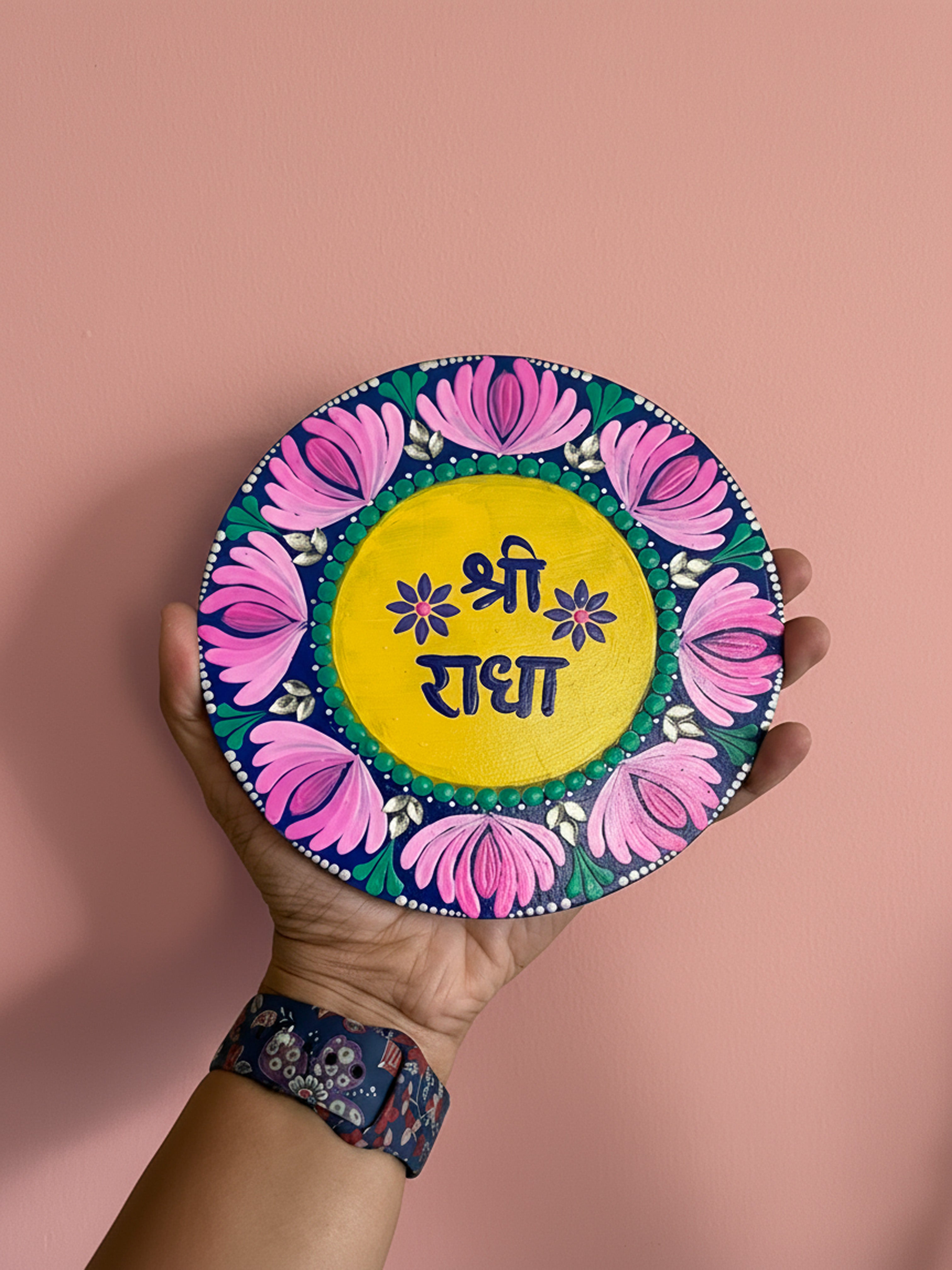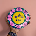 This beautiful hand-painted MDF round plate features Shri Radha written in Hindi, surrounded by a vibrant mandala design in pink, green, and yellow tones. The artwork is done in the traditional dot mandala style, symbolizing love, devotion, and divine energy. Each detail is carefully hand-painted, making it a unique and spiritual piece of decor for your home, temple, or gifting purpose. Perfect to add a touch of color, positivity, and sacredness to your living space.