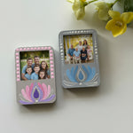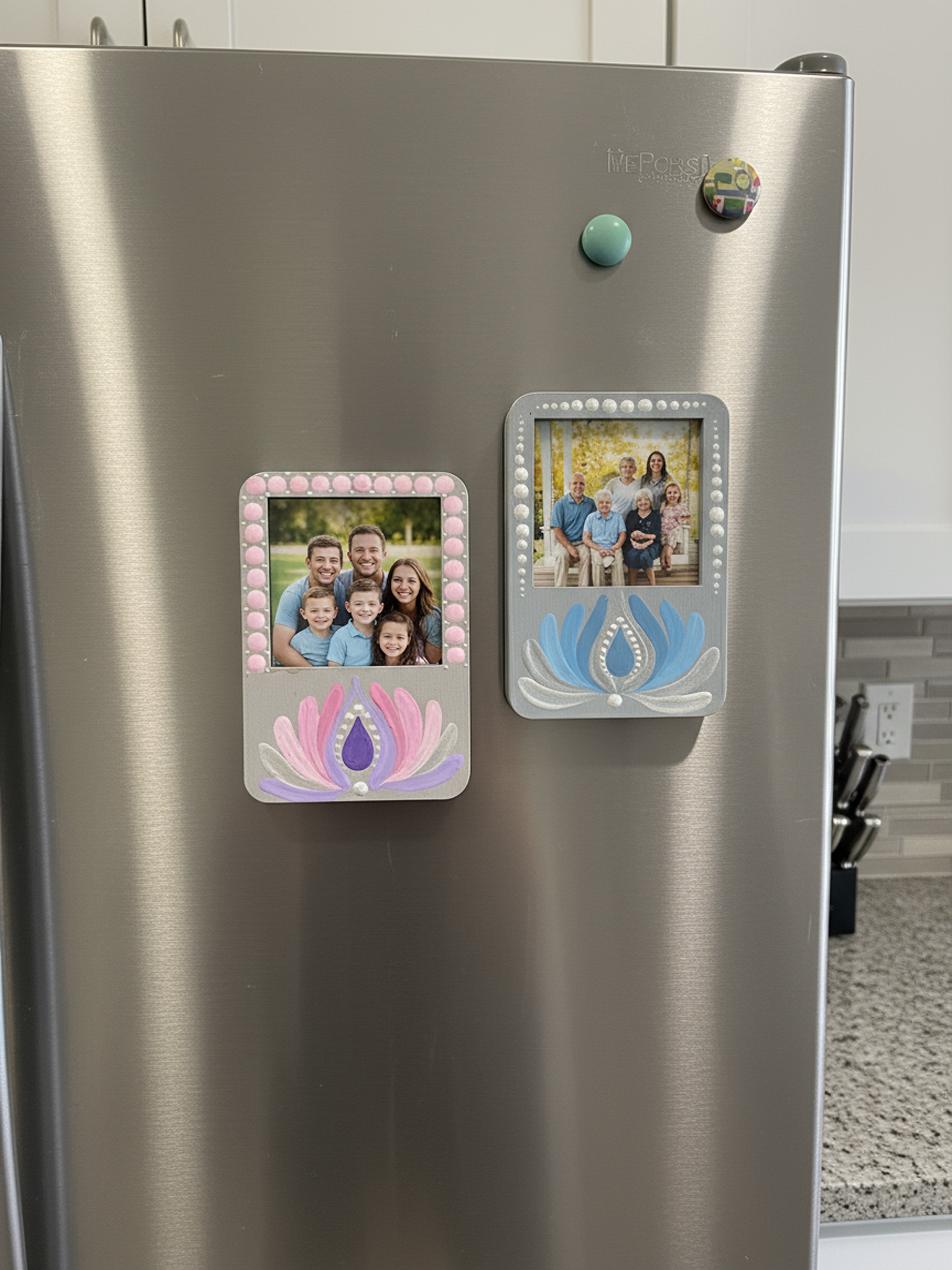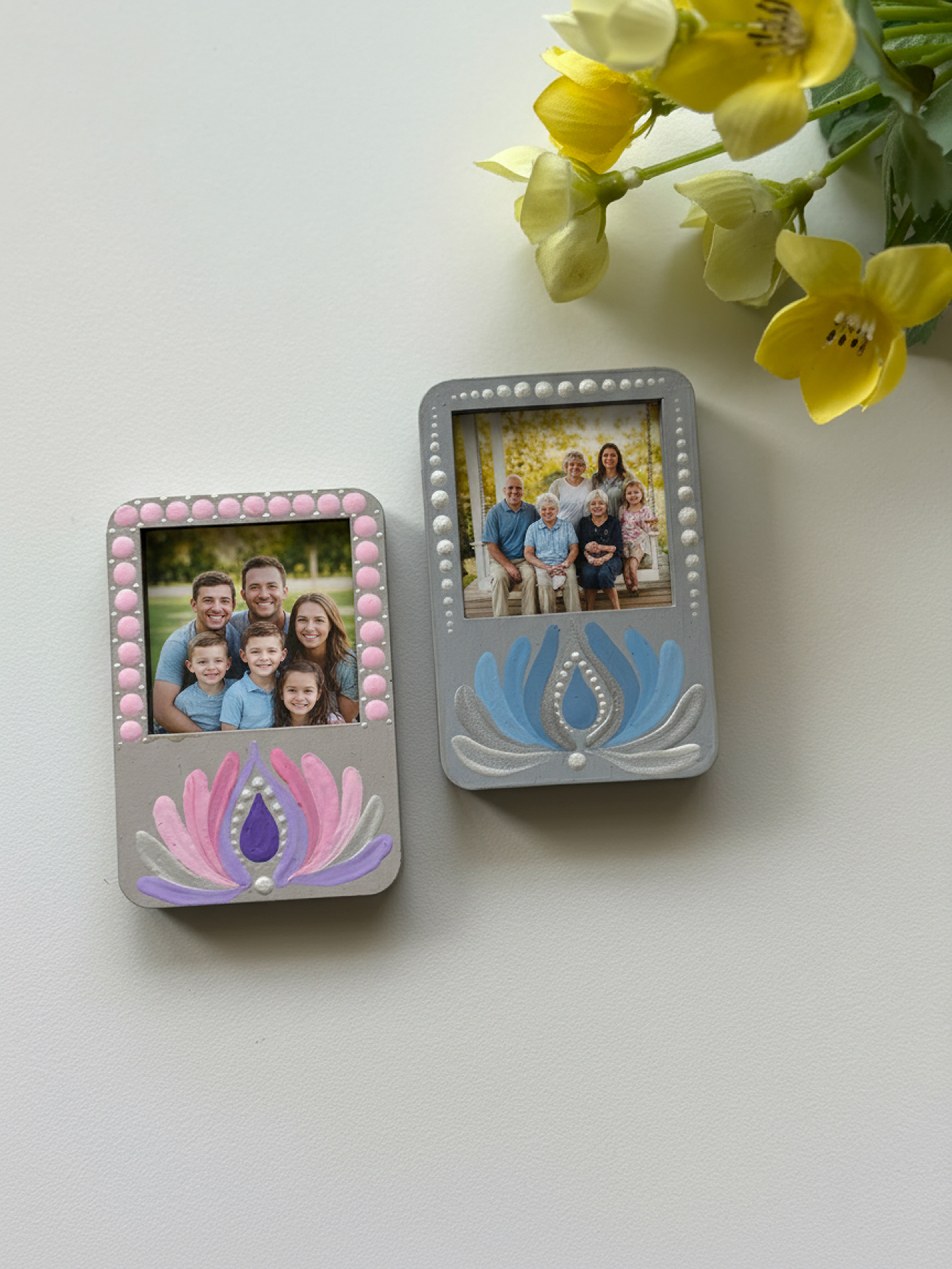 Capture your sweetest memories with these elegant hand painted mini photo frame magnets, detailed with lotus mandala motifs in soft pastel hues of pink, lavender, and sky blue.