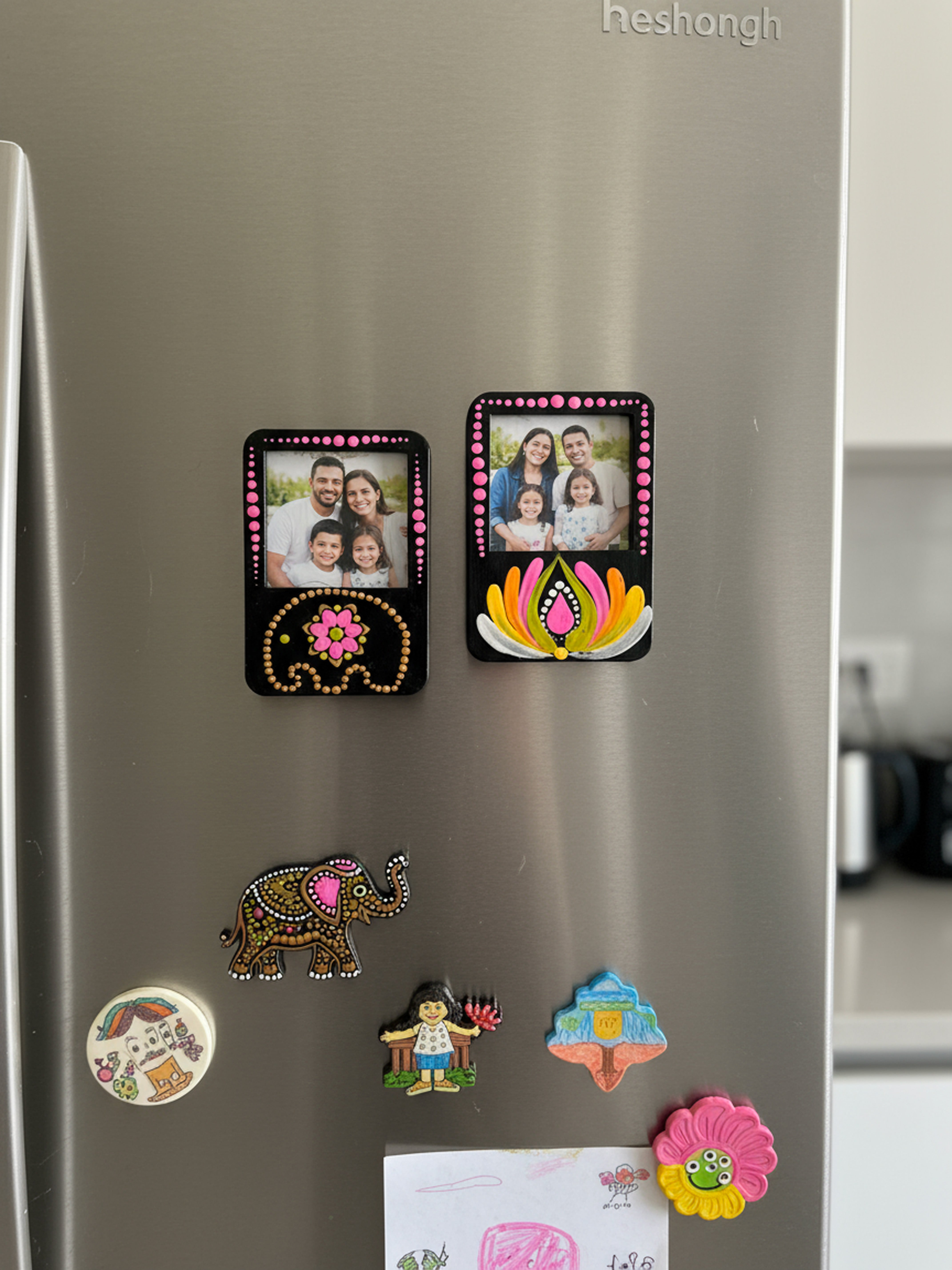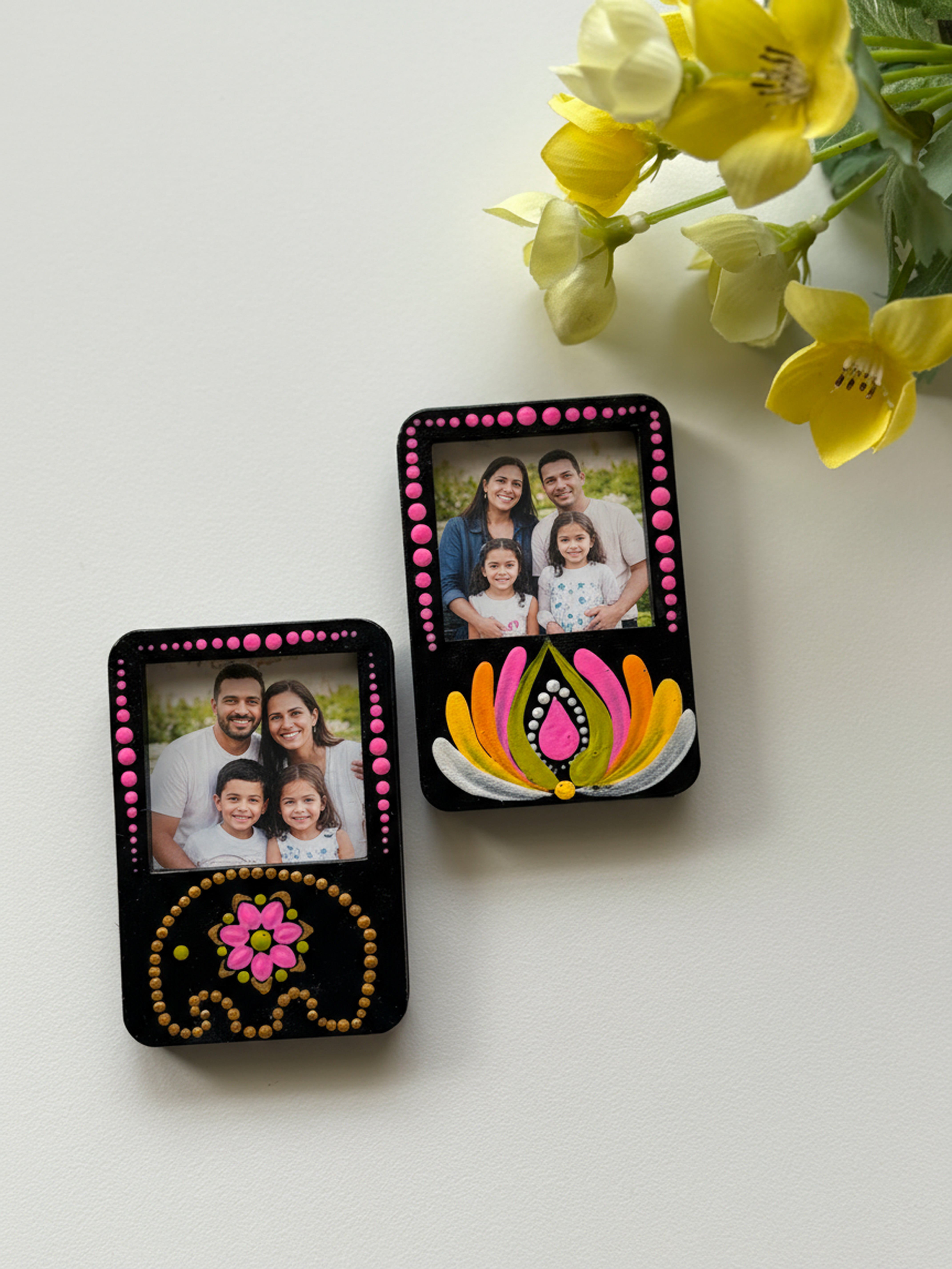 Add a pop of color and tradition to your space with these handcrafted mini photo frame magnets.