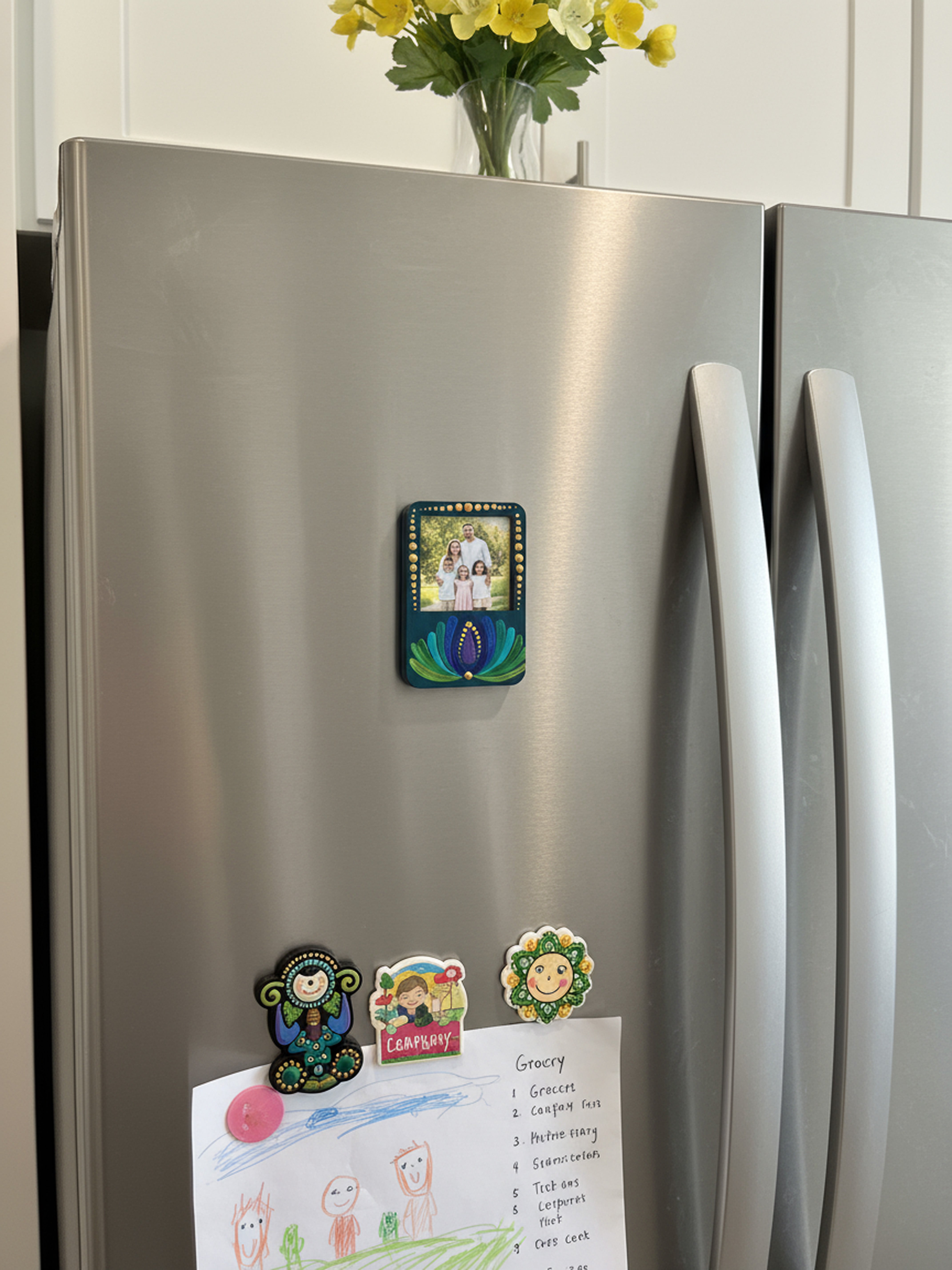 Ideal for displaying family memories, couple portraits, or special milestones, this piece doubles as functional art — a delightful keepsake that brightens up your refrigerator, workspace, or gifting collection.