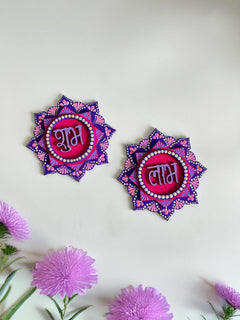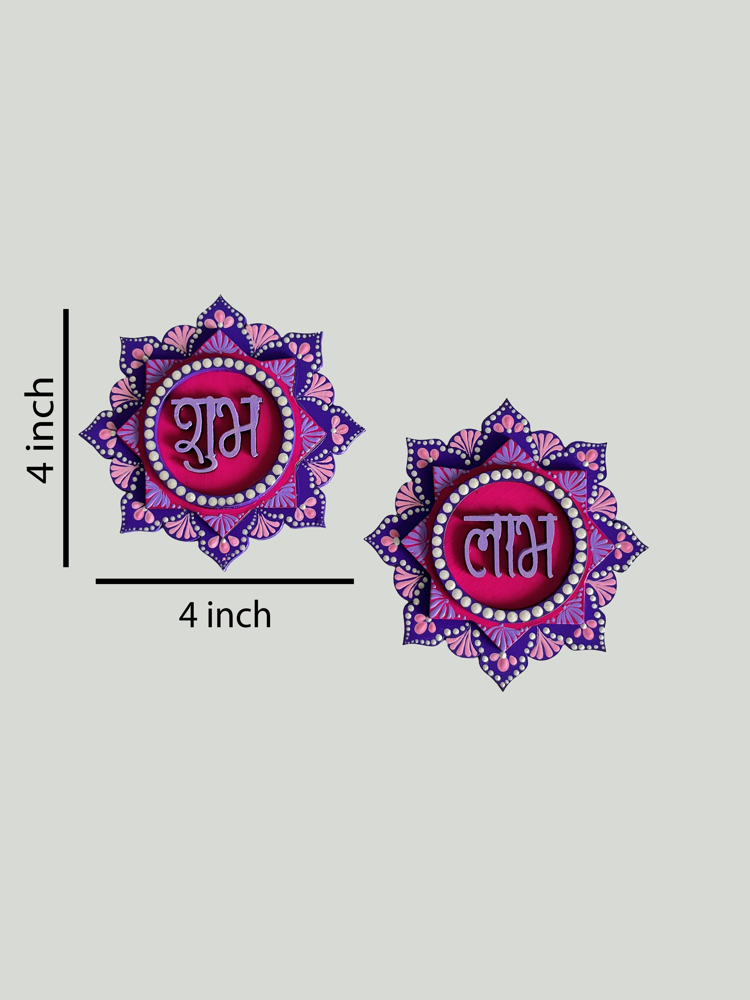 Brighten up your home with this flower-shaped Shubh Labh wall hanging, handpainted in striking Purple and Pink tones.