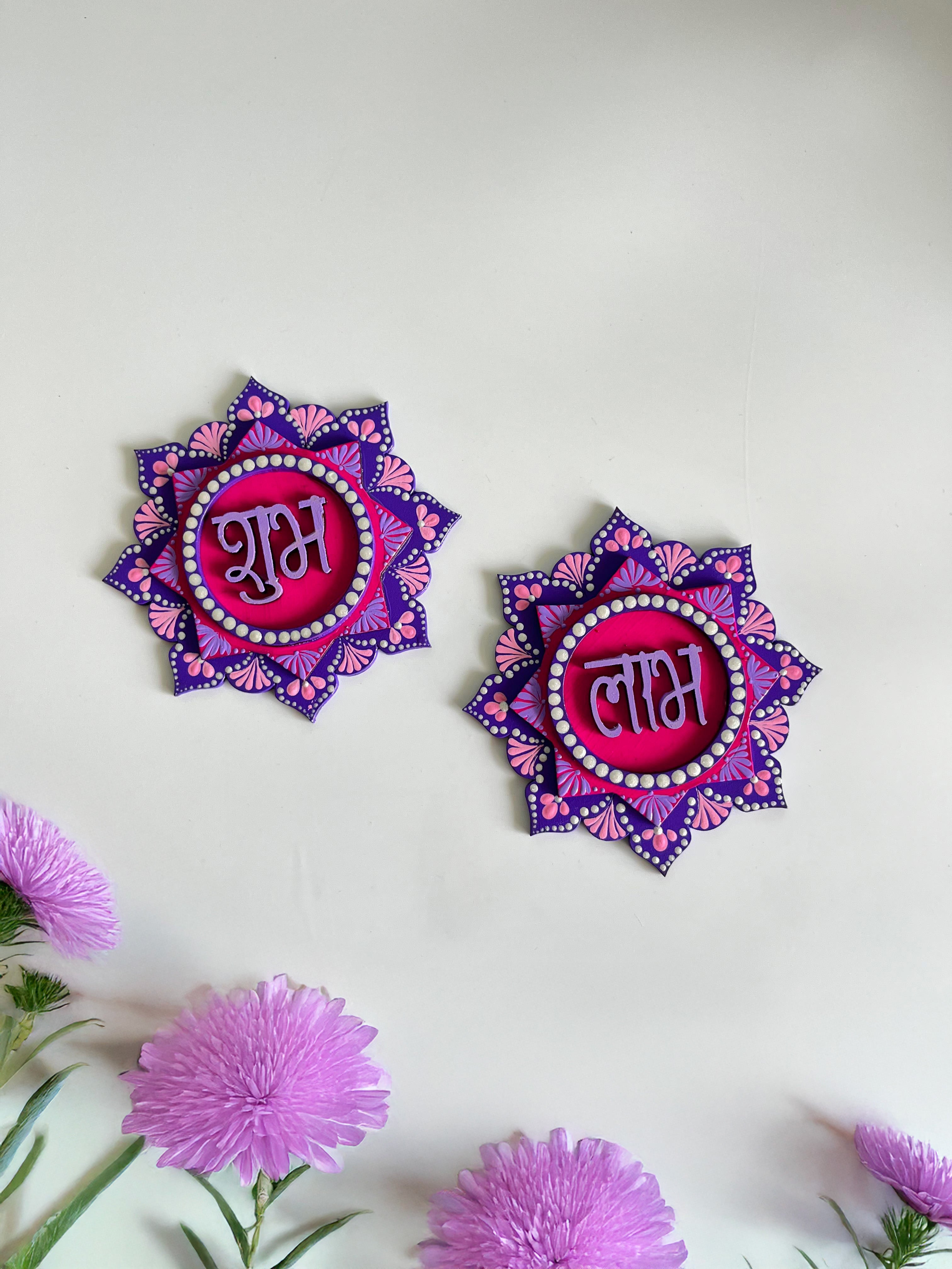 Handpainted Shubh Labh Wall Hanging – Flower Design in Purple & Pink (4x4 Inch)