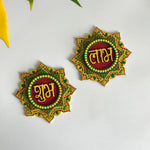 Brighten up your home with this flower-shaped Shubh Labh wall hanging, handpainted in striking red, green, and yellow tones.