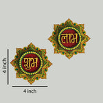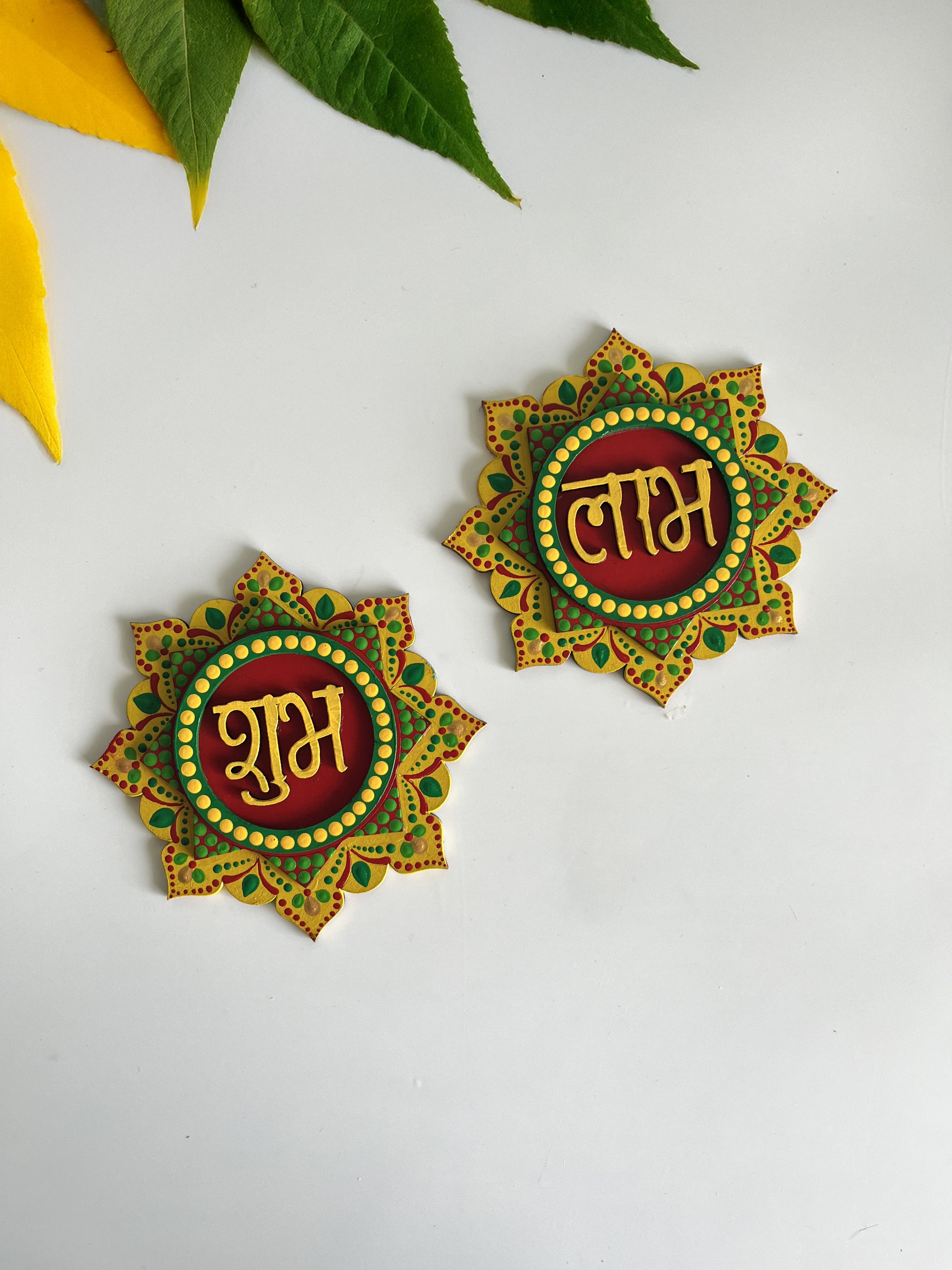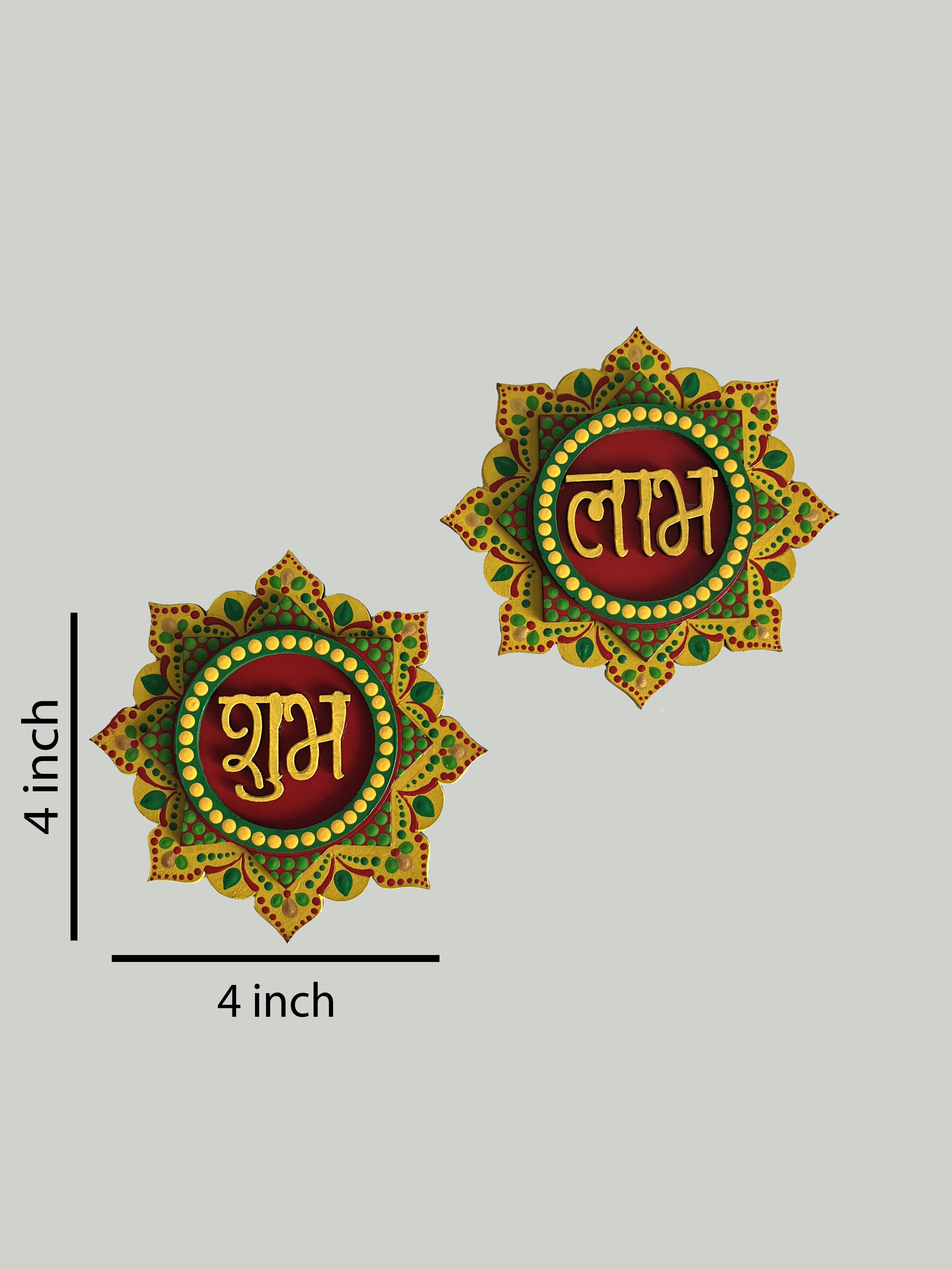 Handpainted Shubh Labh Wall Hanging – Flower Design in Red, Green & Yellow (4x4 Inch)