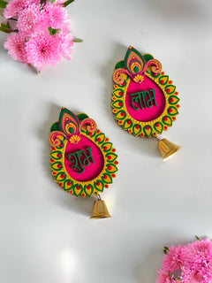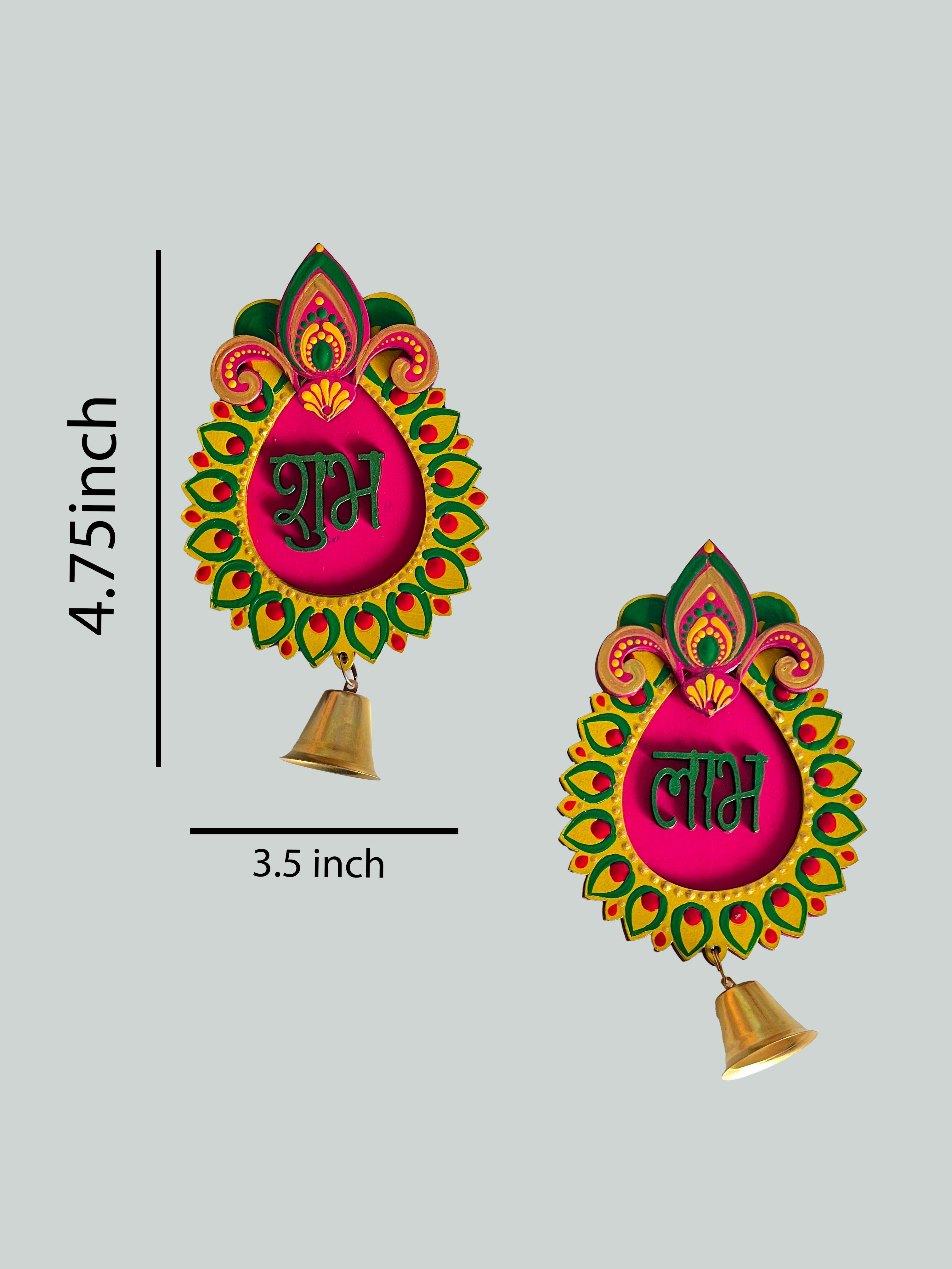 Handpainted Shubh Labh Wall Hanging with Decorative Bells – Pear Drop Design in Pink , Yellow & Green (Approx. 4x3 Inch)