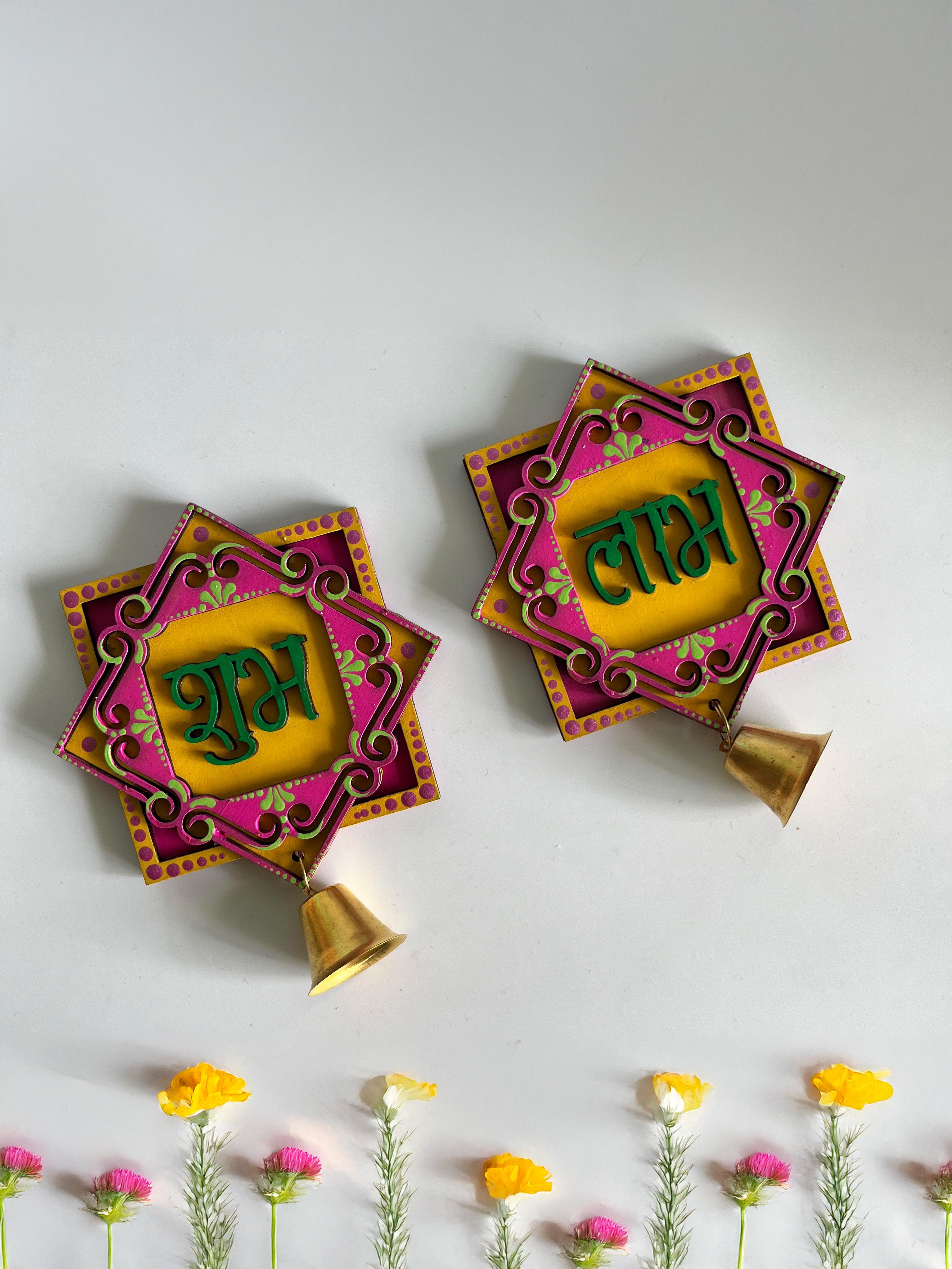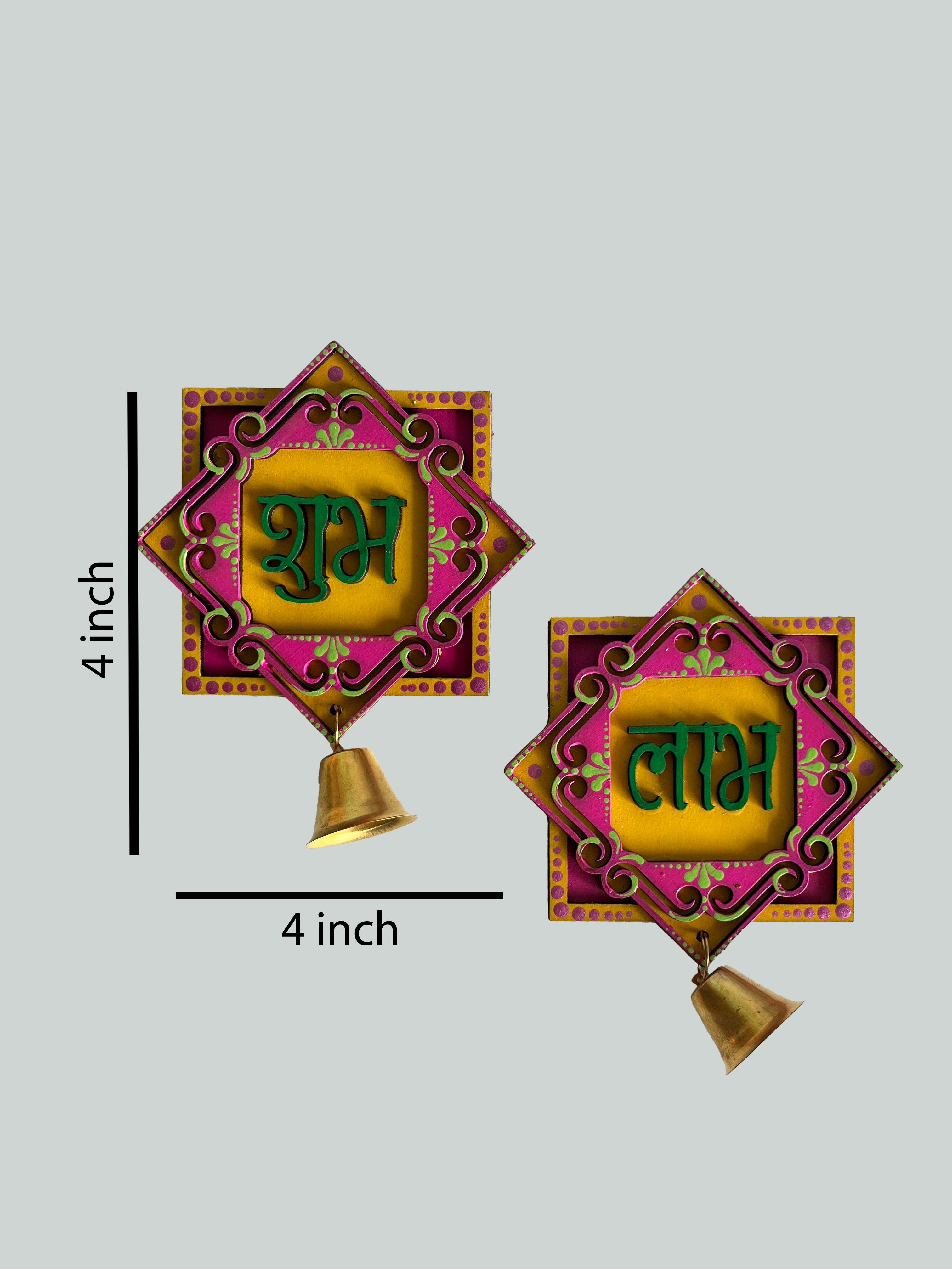 Handpainted Shubh Labh Wall Hanging with Decorative Bells – Pink & yellow Square (4x4 Inch)