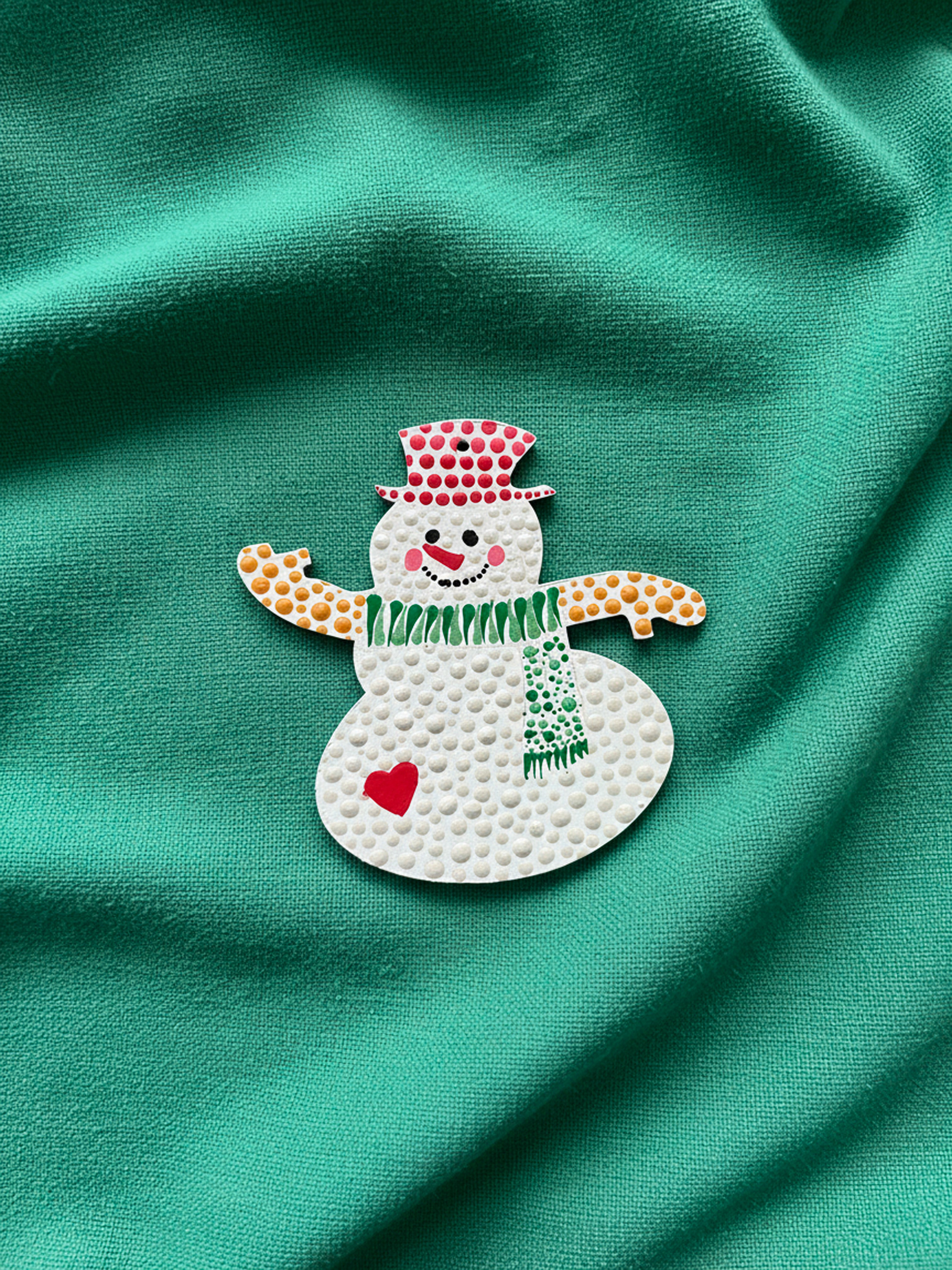 Crafted with love and precision, this adorable snowman features intricate dot mandala designs layered over a classic winter-white base, embellished with festive shades like red, emerald, silver, and icy blue (customizable to your palette).
