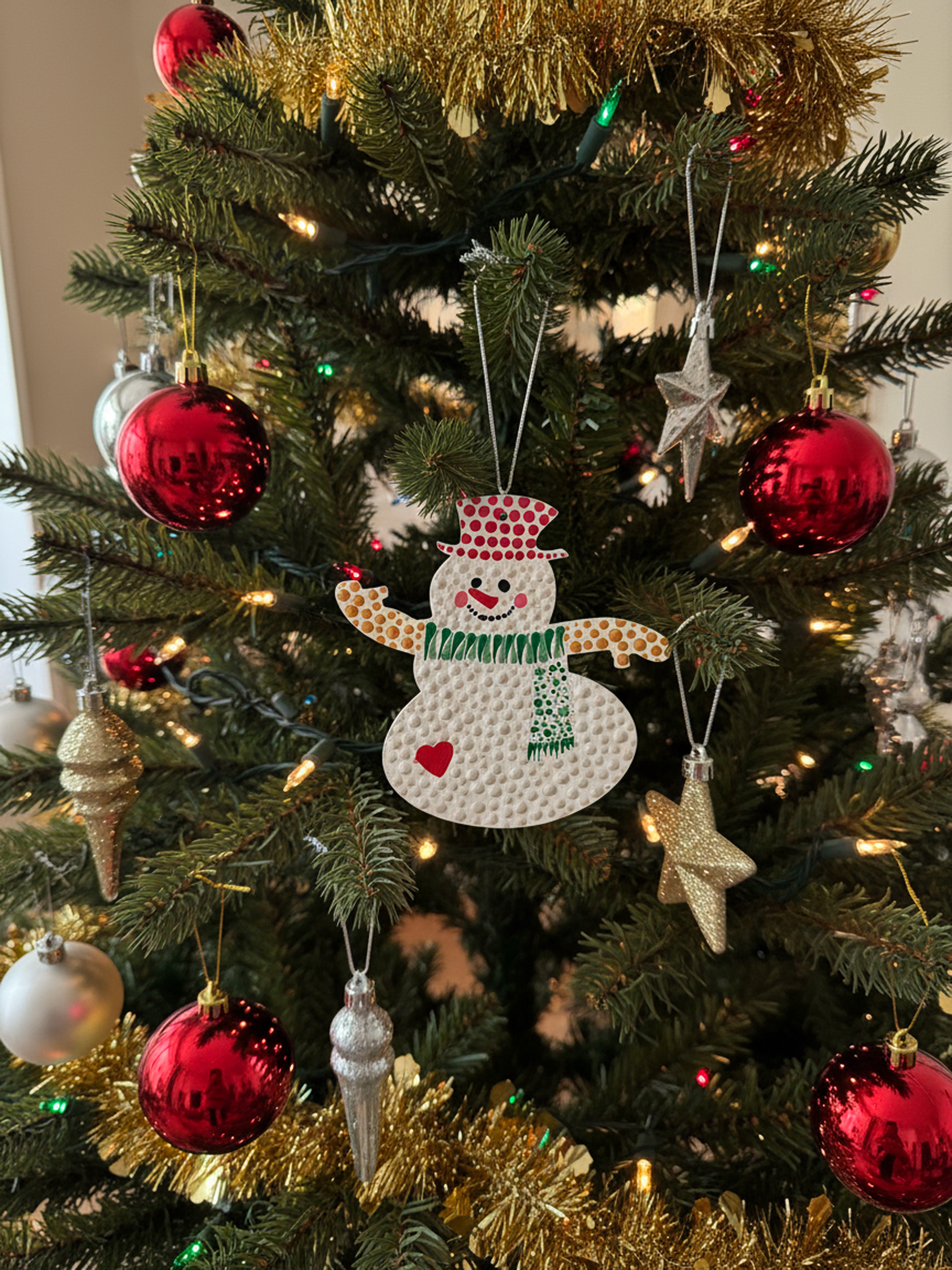 Each dot is placed by hand, making every ornament truly one-of-a-kind. Whether it hangs on your Christmas tree, adorns a wreath, or brightens a cozy corner, this little snowman brings warmth, joy, and handcrafted charm to your holiday décor.