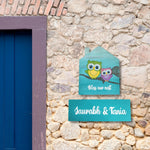 The top panel, shaped like a cozy house, features a pair of brightly hand-painted owls perched on a tree branch — a symbol of love, wisdom, and togetherness. Below it hangs a teal name plank - personalized with your family name or couple’s names.
