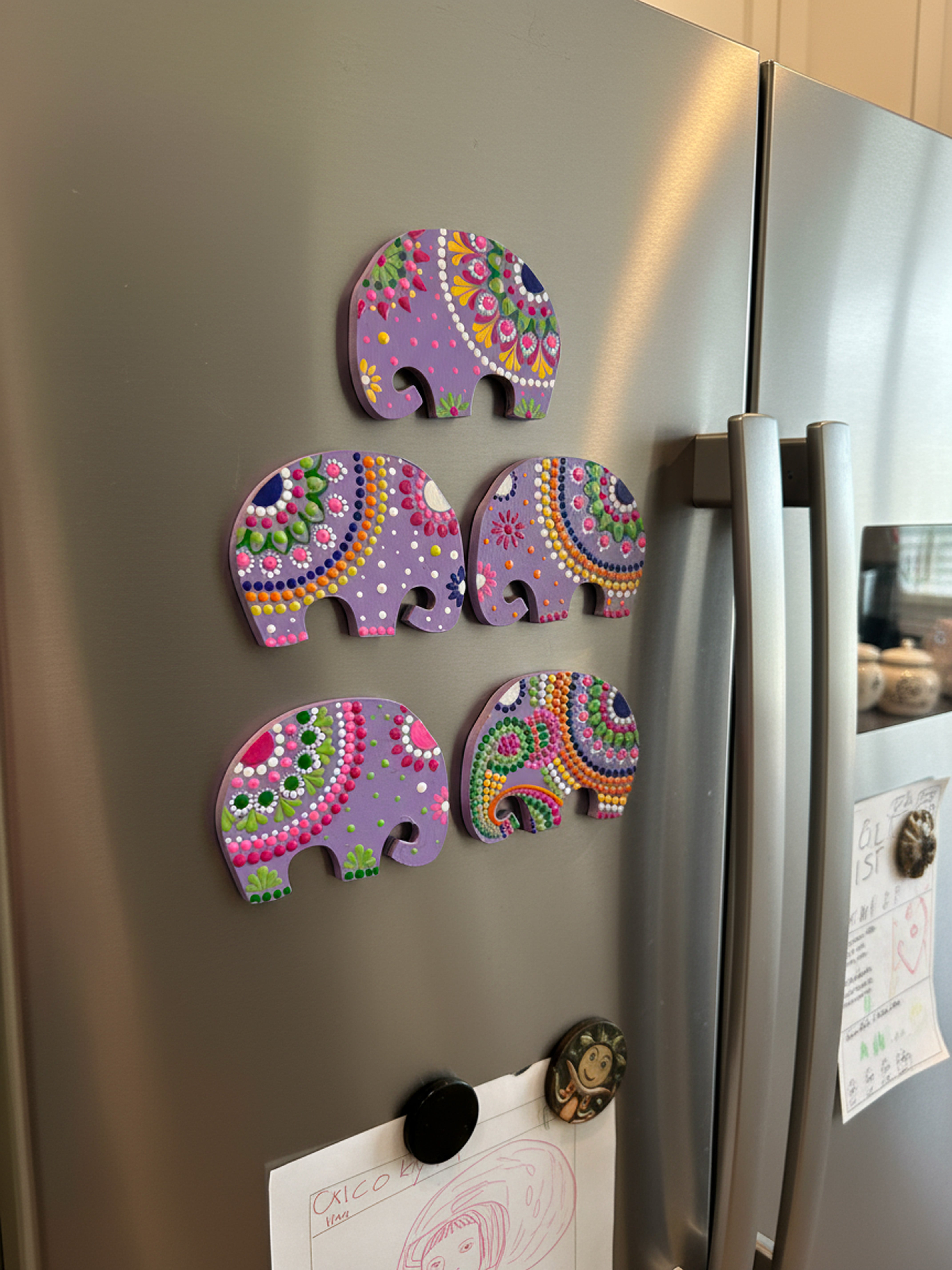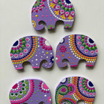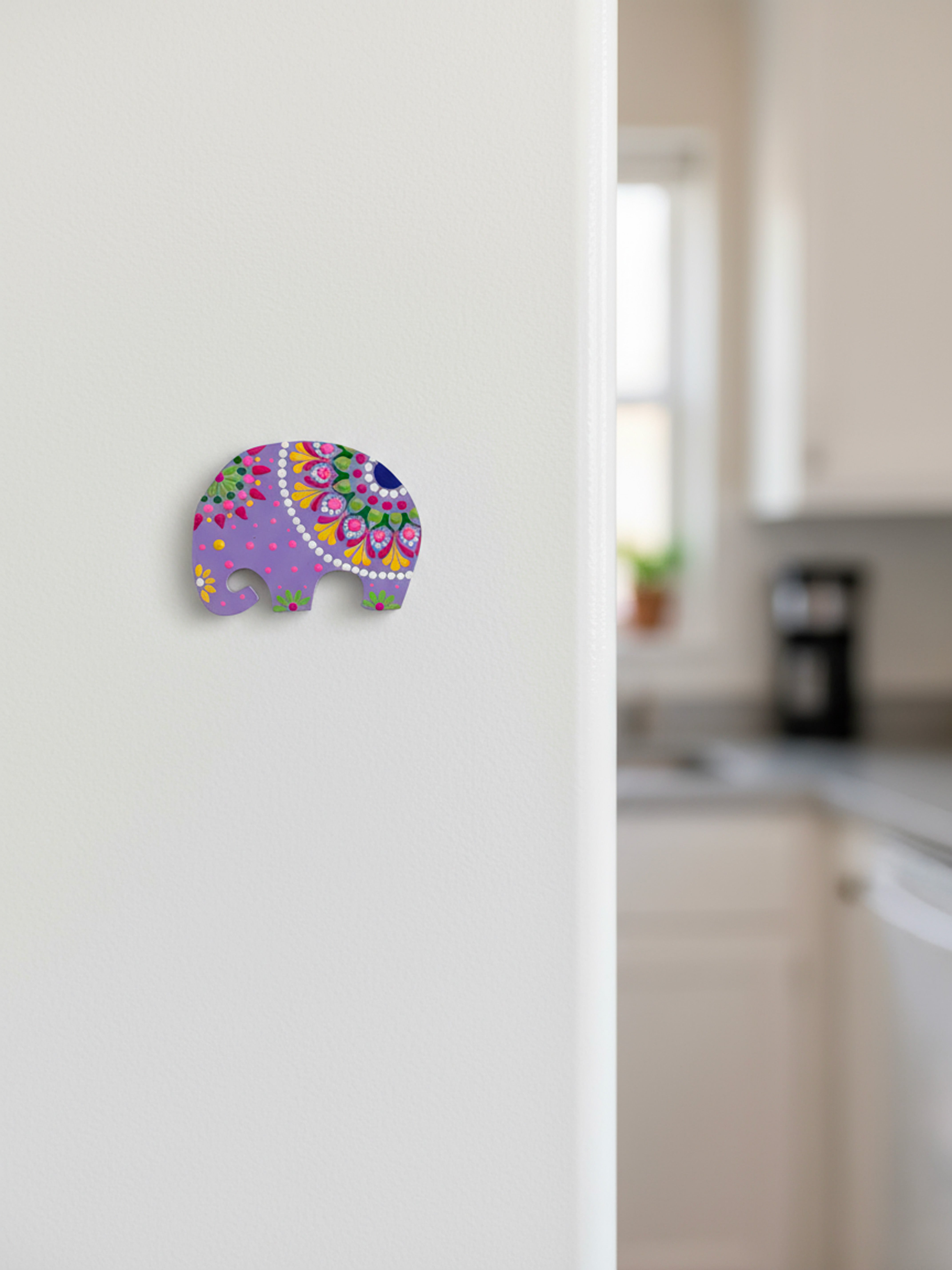 These lavender-hued elephant magnets are a celebration of calm, color, and creativity. Hand-painted in the intricate dot mandala art style, each elephant features vibrant patterns in pink, green, yellow, and orange symbolizing prosperity, harmony, and joy.