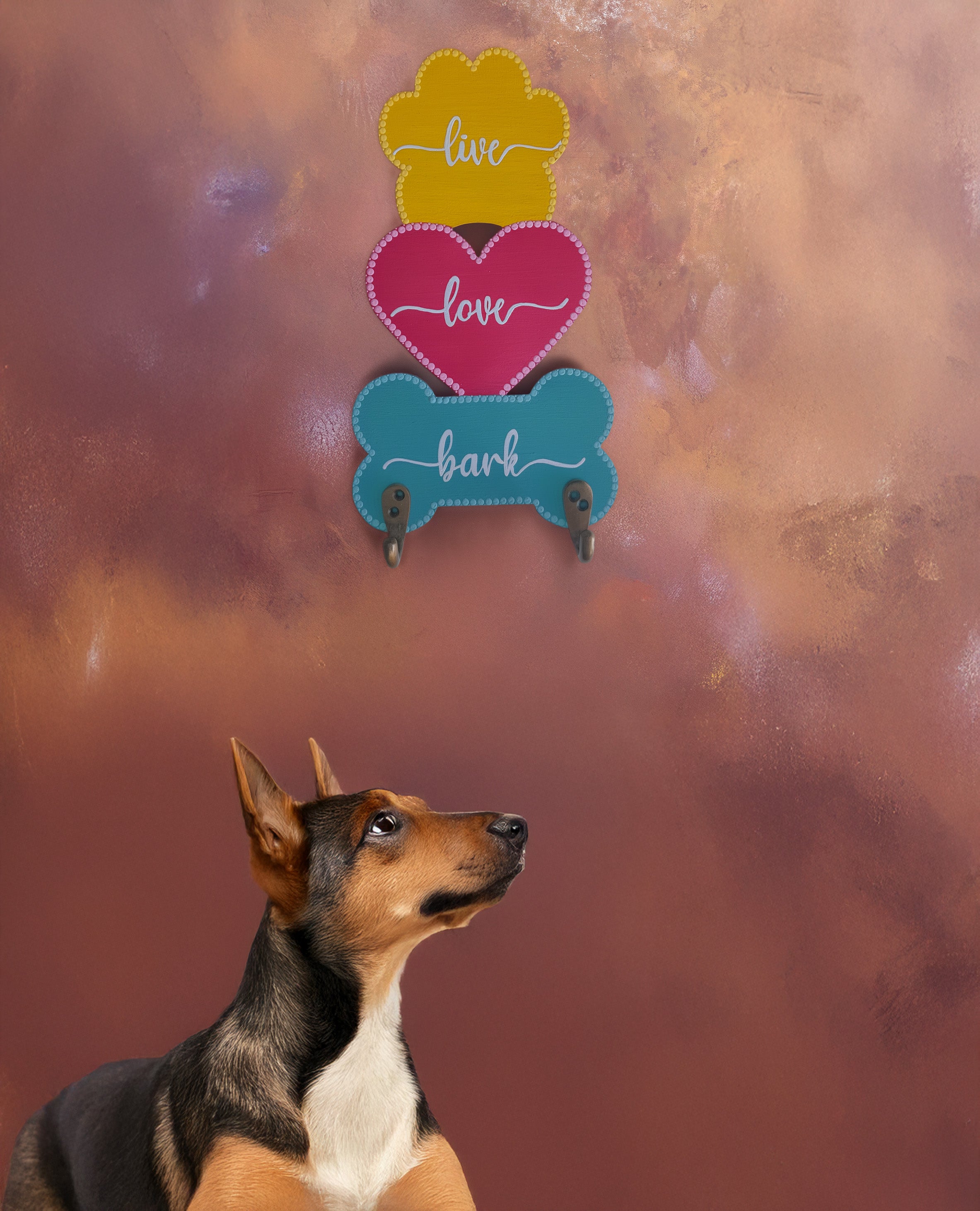 Crafted with intricate dot details and finished with durable hooks, it’s perfect for hanging leashes, collars, or small pet essentials while adding a splash of personality to your wall. The bright hues of yellow, pink, and teal make it a delightful accent for any pet lover’s home.