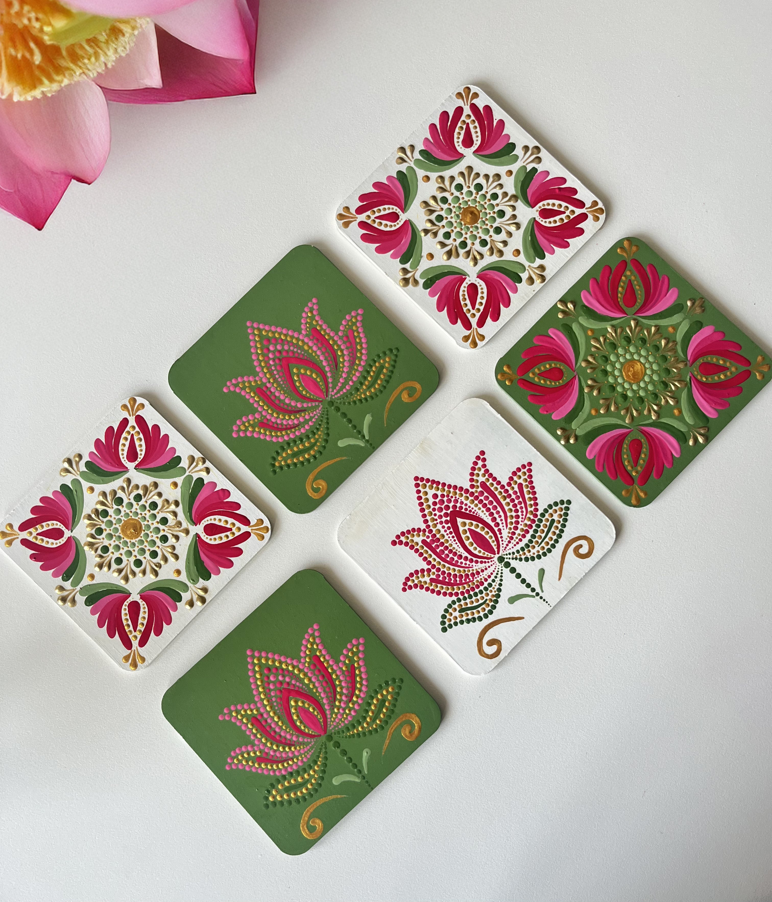 Available in sets of 2, 4, or 6, these coasters are perfect for daily use or festive occasions. Each set is randomly curated from multiple lotus-inspired designs, making every order truly special. Since every coaster is hand-painted, slight variations in pattern and color details enhance their charm, ensuring your set is one-of-a-kind.